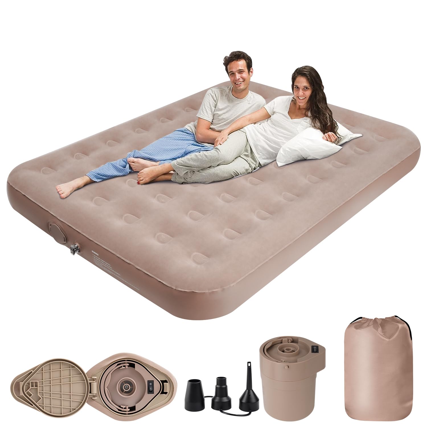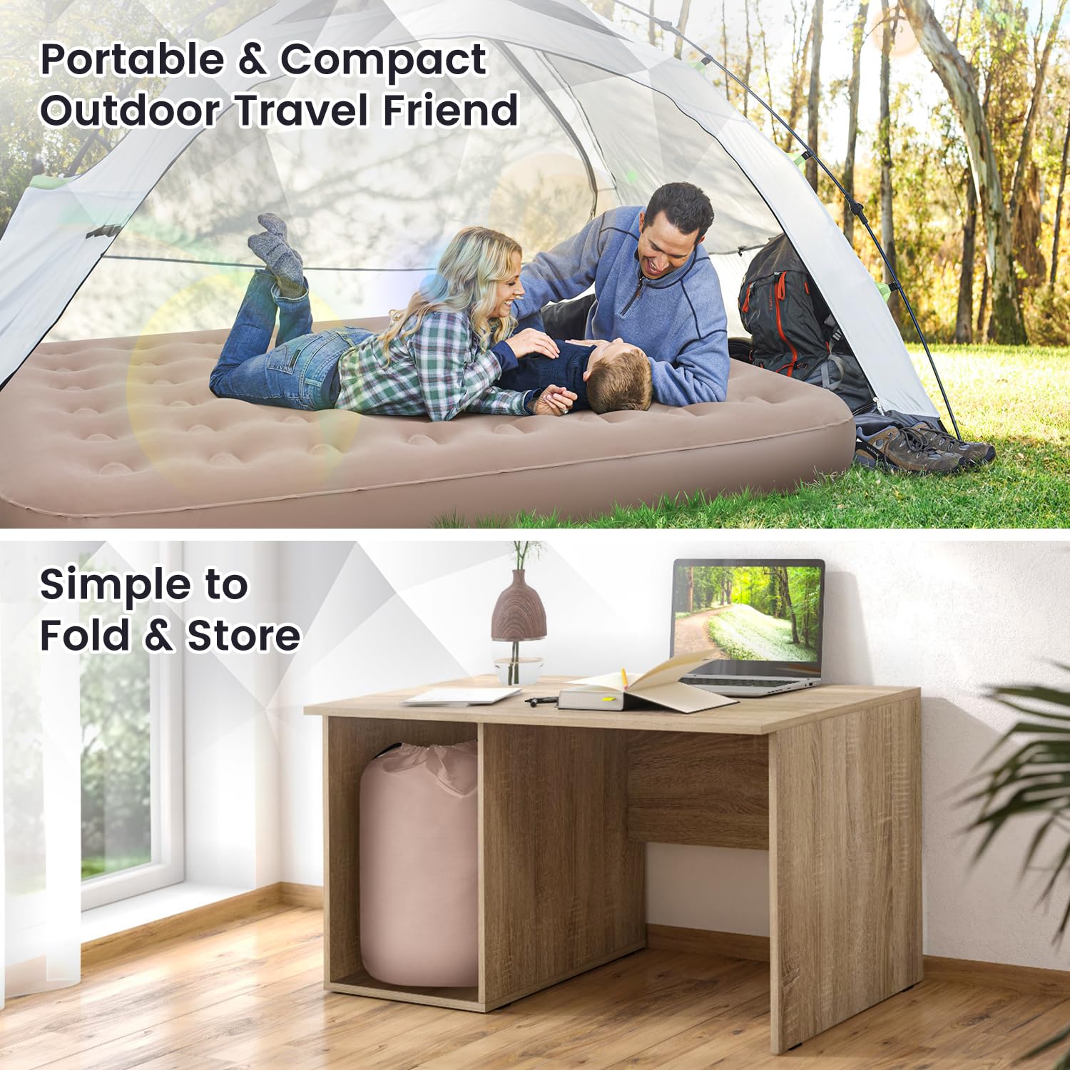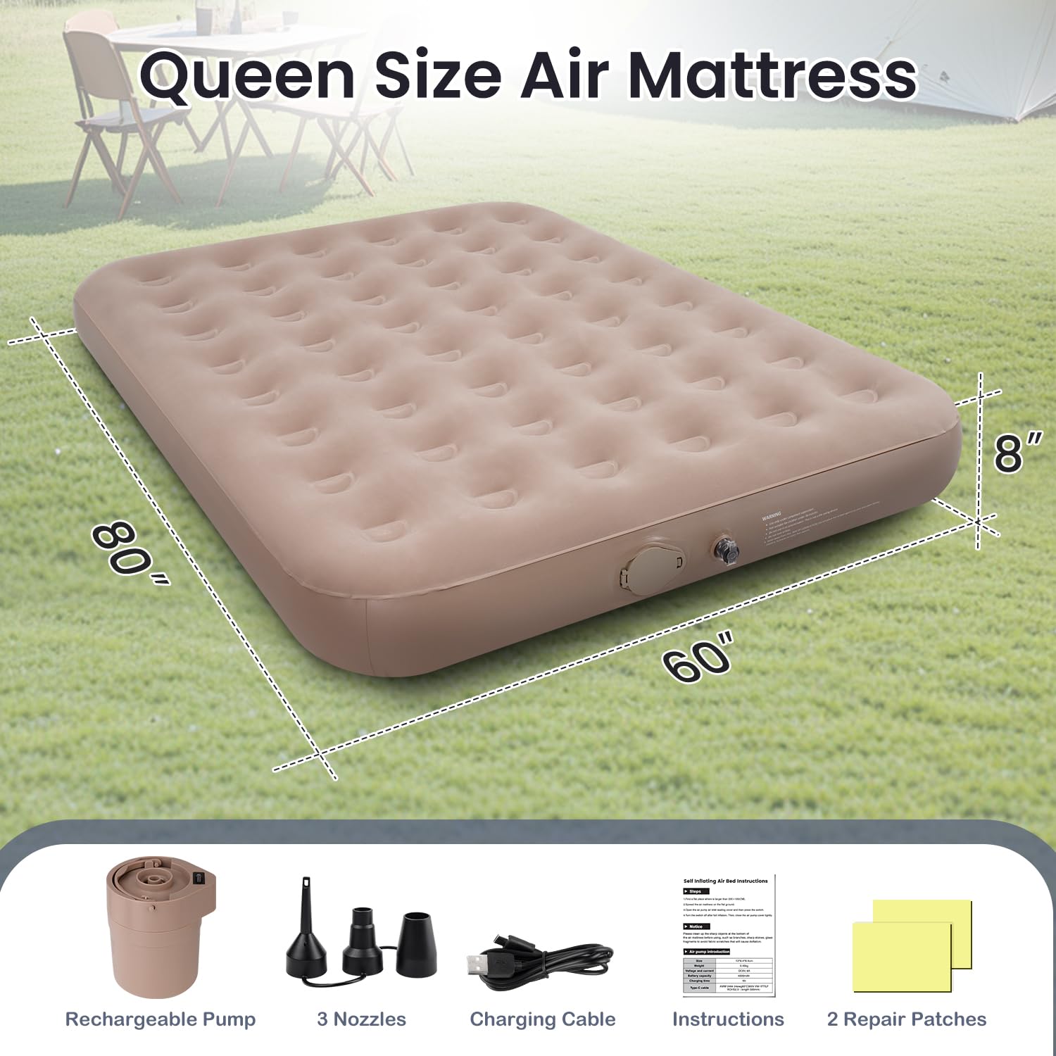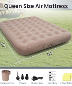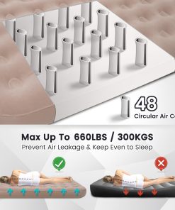 4. Tamaño Queen y Almacenamiento Pequeño: Nuestro colchón de aire tamaño queen para acampar tiene dimensiones infladas de 80×60.8×8 pulgadas y una capacidad de peso de hasta 660 libras. La tecnología de columna de haces de aire ofrece comodidad de colchón real y soporte espinal adicional, proporcionando un soporte uniforme de la cabeza a los pies. Nuestro colchón de aire inflable viene con una bolsa de almacenamiento, que se puede doblar y guardar para ahorrar espacio cuando no se esté utilizando.