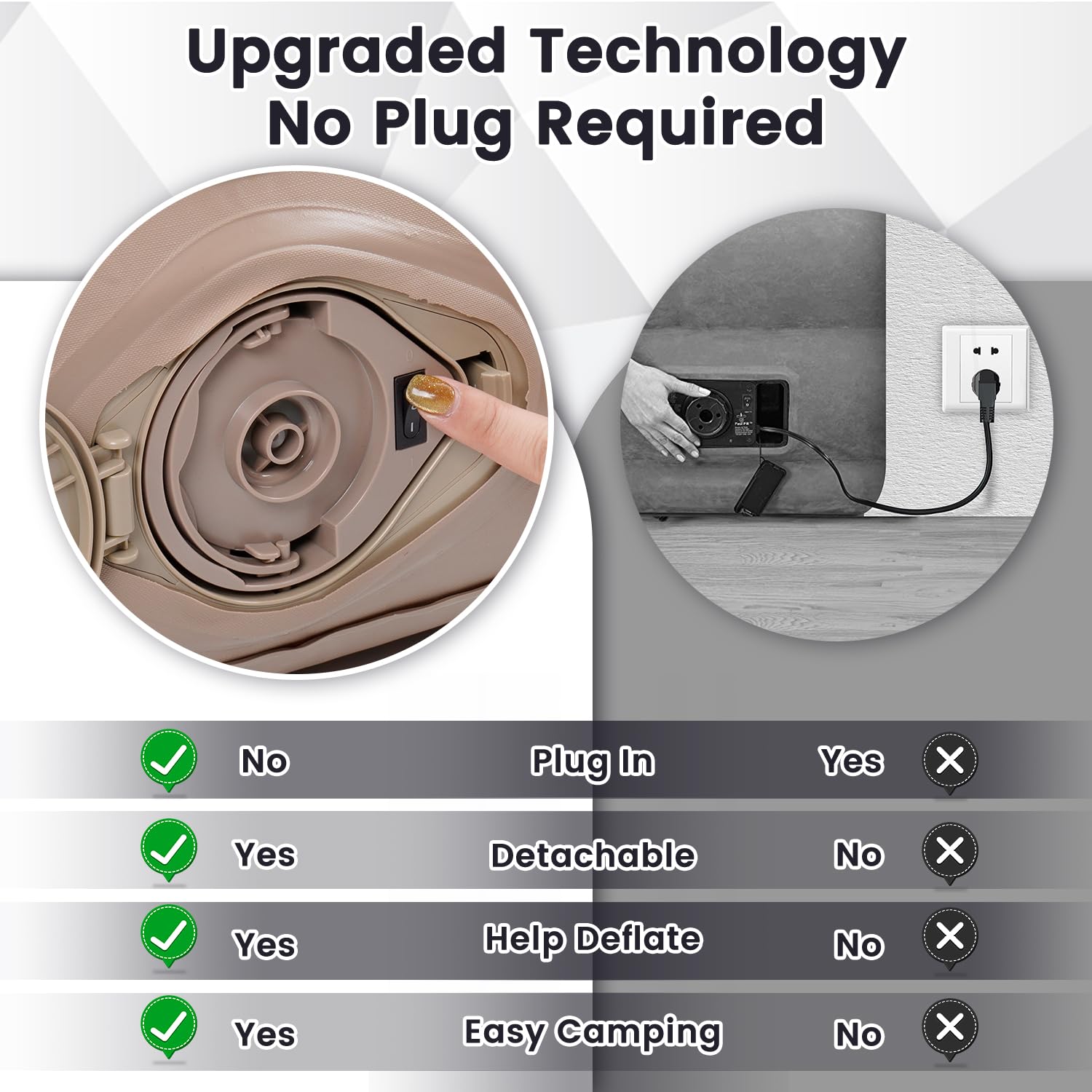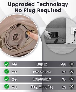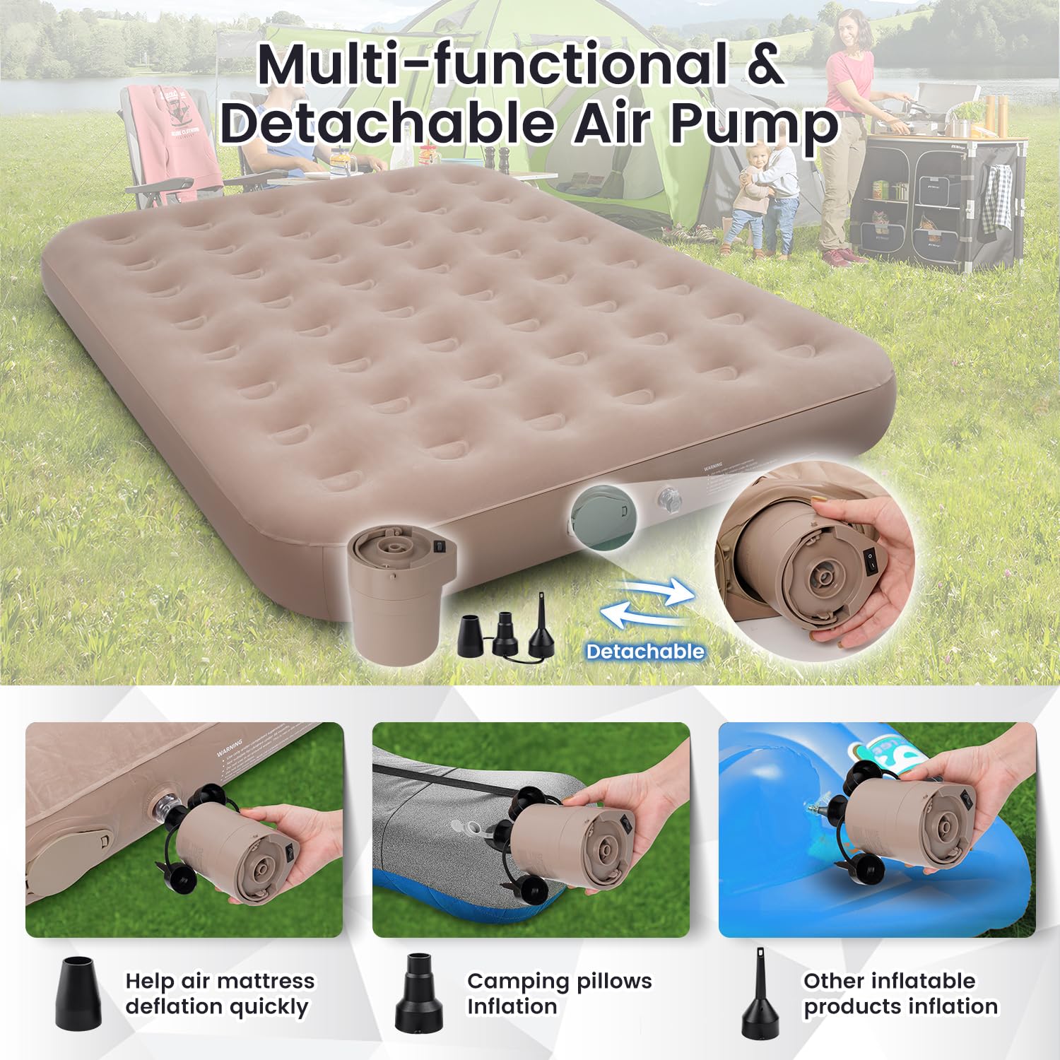1. Bomba desmontable incorporada de 2000mAh: El colchón de aire tamaño queen de Calanofin cuenta con una bomba recargable con botones de inflado/deflado, lo que permite una fácil inflación sin depender de una fuente eléctrica. La bomba desmontable permite una rápida inflación con un solo clic en el colchón inflable en solo 2-3 minutos, haciéndolo versátil para diversas ocasiones.