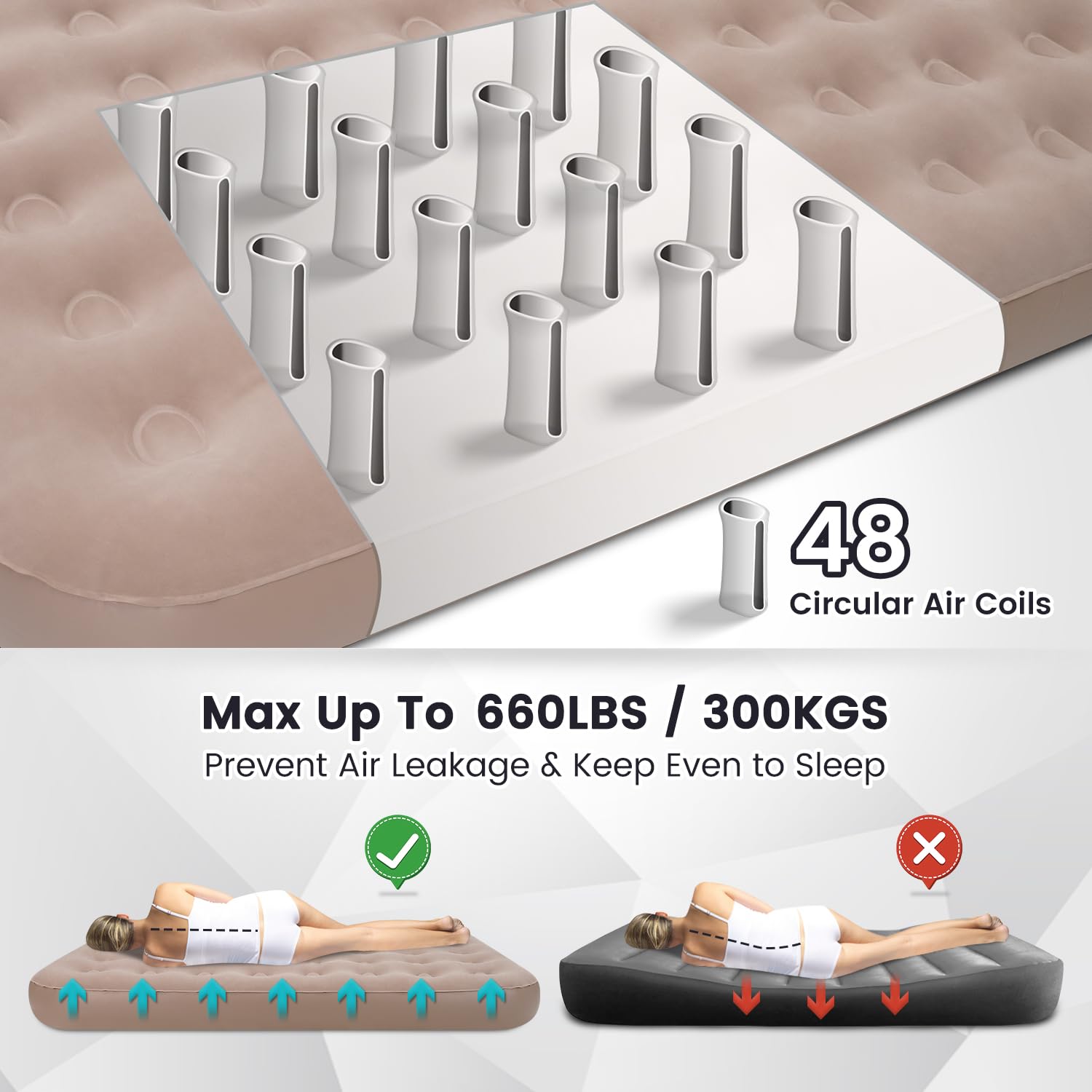 2. Soporte interno potente: Con un grosor de 8″ y un diseño de soporte interno de 48 haces de bobina de aire, el colchón autoinflable que es plano y firme ofrece una experiencia de dormir o sentarse cómoda. Con nuestro colchón de aire inflable, puedes disfrutar de una experiencia de dormir o sentarse cómoda sin preocuparte por el colapso.