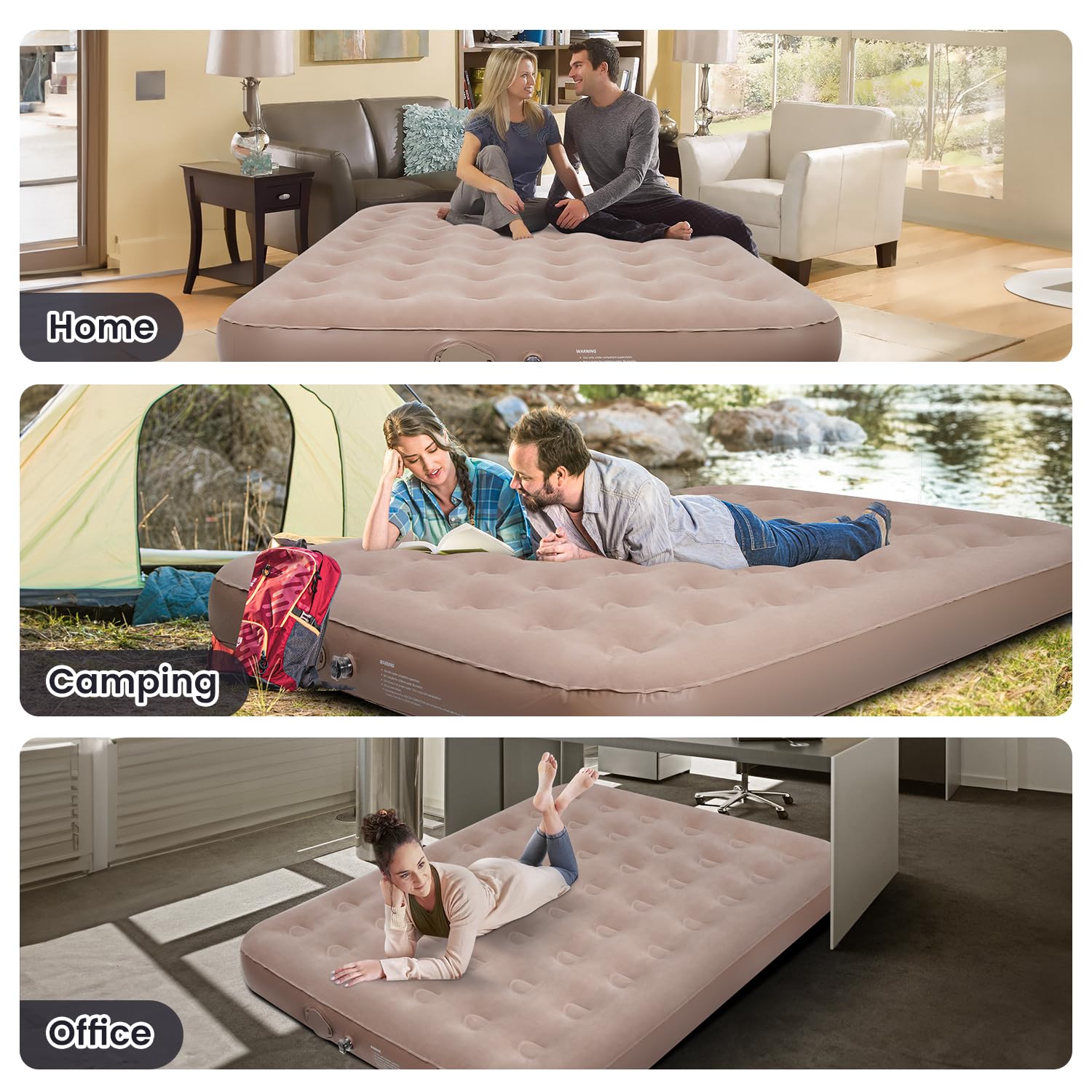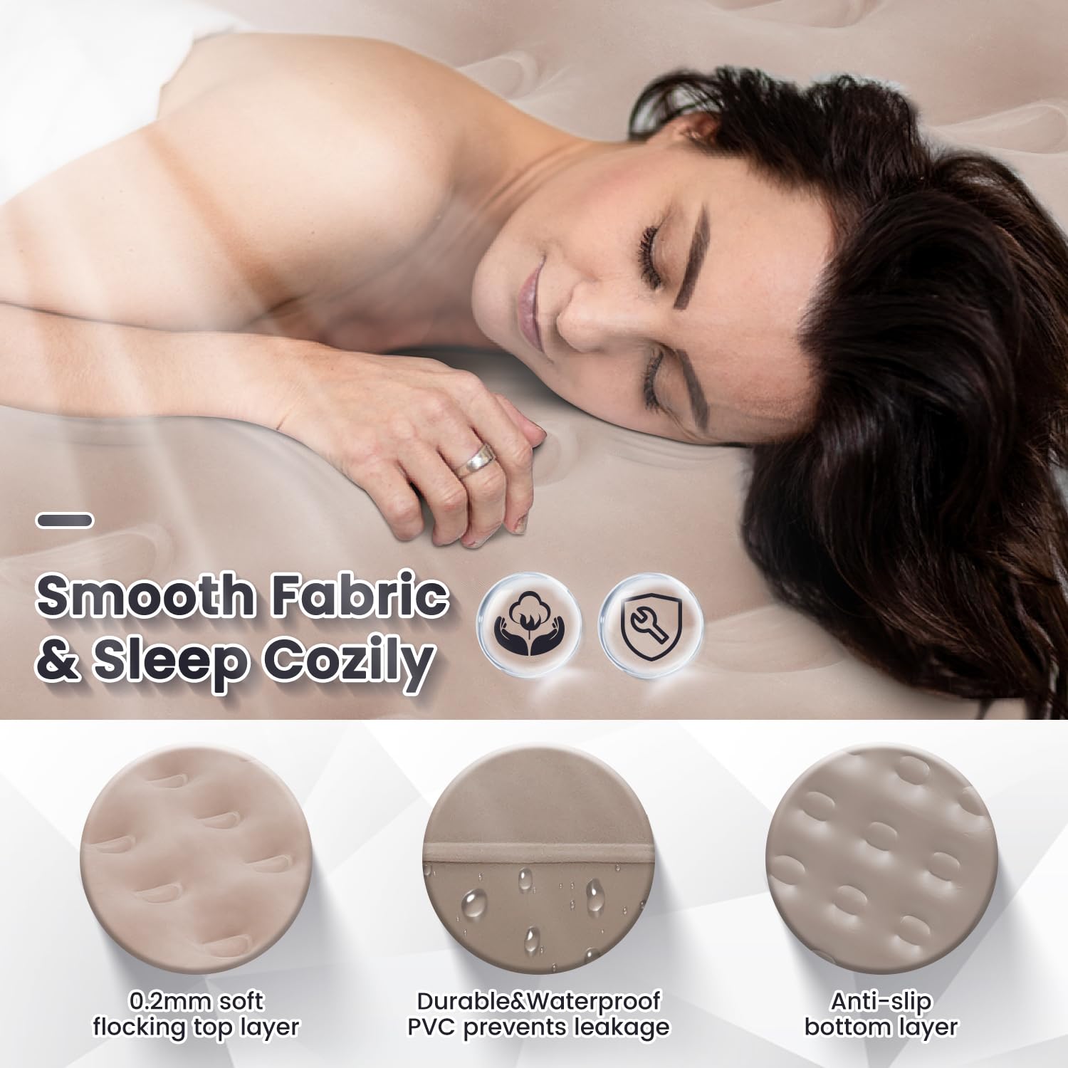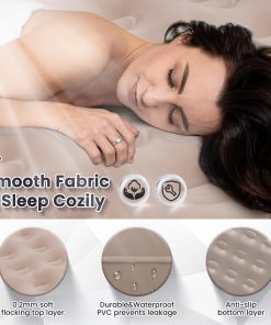 3. Material de felpa combinado y PVC antideslizante: La parte superior de nuestro colchón inflable cuenta con terciopelo suave para una superficie de dormir mullida y cómoda. La parte inferior está diseñada con PVC impermeable y antideslizante, asegurando estabilidad y previniendo movimientos no deseados. Fabricado con múltiples capas de PVC resistente a la perforación, nuestro colchón de aire resistente a las perforaciones ofrece durabilidad y minimiza las fugas de aire. Ideal como colchón de aire para acampar, proporciona una excelente experiencia de dormir.