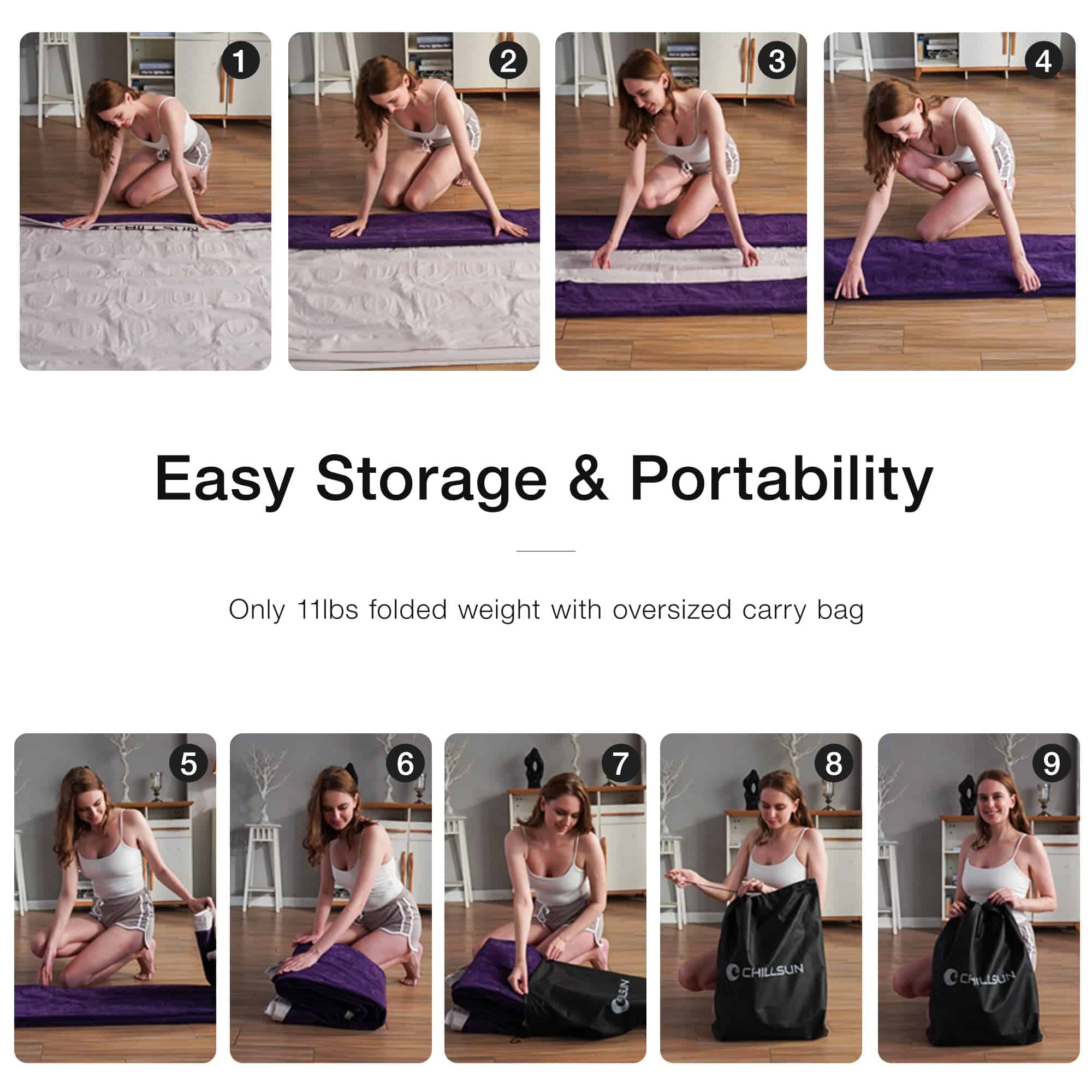 1. Inflación Rápida: El colchón de aire CHILLSUN viene equipado con una bomba de aire eléctrica integrada de 110V para una inflación fácil; el sistema de inflación dual único garantiza una inflación/desinflación rápida y estable al reducir el riesgo de fuga de aire. 2. Impermeable y Duradero: Construido con múltiples capas, incluyendo material a prueba de fugas de PVC de 0.4mm y una capa superior de felpa impermeable de 0.2mm; este diseño para el colchón de aire Queen de 18″ elevado de CHILLSUN resiste los pinchazos y garantiza una durabilidad duradera. 3. Material Mejorado: El colchonetas inflables CHILLSUN está hecho de una nueva fórmula de PVC que ofrece mayor resistencia y resistencia al desgaste al resistir la deformación. 4. Tamaño Confortable: Mide 80″x60″x18″ con una capacidad de peso máxima de 650 libras; el colchón hinchable CHILLSUN proporciona un excelente soporte y estabilidad para una noche de sueño reparador, adecuado para acampar o alojamiento de invitados. 5. Portátil y Fácil de Guardar: Incluye una bolsa de almacenamiento para viajes para un embalaje y almacenamiento conveniente; la función de auto-desinflado permite un embalaje rápido y fácil después de su uso. 6. Calidad Certificada: Los colchones de aire CHILLSUN cuentan con certificaciones internacionales de seguridad como CE y ETL; cumplen con altos estándares de la industria en seguridad y rendimiento, ofreciendo confianza en su compra. 7. En CHILLSUN, ofrecemos camas de aire en tamaños queen, twin, full y king para satisfacer sus necesidades. Cada colchón tiene una base antideslizante para una mayor estabilidad e incluye un kit de reparación para arreglos fáciles en caso de pinchazos o cortes.