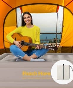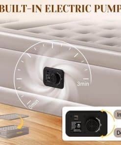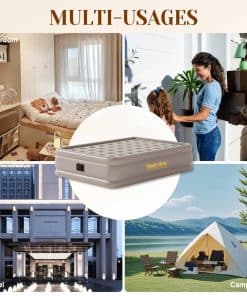1. INFLADO RÁPIDO AUTOMÁTICO: El colchón de aire tamaño completo cuenta con una bomba incorporada con dos cámaras de aire duales, las cuales funcionan simultáneamente. Solo se necesitan 3 minutos para inflar y desinflar, estabilidad toda la noche sin pérdida de aire. Las especificaciones de la bomba eléctrica son 120VAC, 60Hz, 1.2A. 2. RESISTENCIA DE CARGA FUERTE: Las colchonetas de aire completas con bomba interna de construcción de vigas de bobina ofrecen un sólido soporte para mantener la estabilidad, dimensiones infladas de 75 x 39 x 18, capacidad máxima de carga de 600 libras. 3. MATERIAL DE ALTA CALIDAD: Colchón de aire de 18 pulgadas con PVC resistente a los pinchazos y felpa premium. Mantiene la firmeza durante 48 horas. Ideal para viajes, hogar, camping y alojamiento de invitados. 4. DISEÑO DE ALTURA DE BORDE DE SEGURIDAD: Los bordes de seguridad elevados proporcionan más espacio para dormir y protegen los objetos contra caídas. La parte inferior antideslizante asegura que el colchón de aire permanezca en su lugar, manteniendo la cama estable incluso en suelos de madera o baldosas para una experiencia de sueño segura y cómoda. 5. AHORRO DE ESPACIO Y PORTÁTIL: El colchón de aire tiene un tamaño de paquete de 12 pulgadas x 15 pulgadas x 7 1/2 pulgadas, pesa solo 11 libras y viene con una bolsa de transporte para una portabilidad fácil. 6. MULTIUSOS: Para campistas y entusiastas del aire libre, los colchones de aire proporcionan una superficie de descanso cómoda durante viajes de campamento y aventuras al aire libre. Los viajeros que se alojan en hoteles u otros alojamientos también pueden beneficiarse de un colchón de aire.