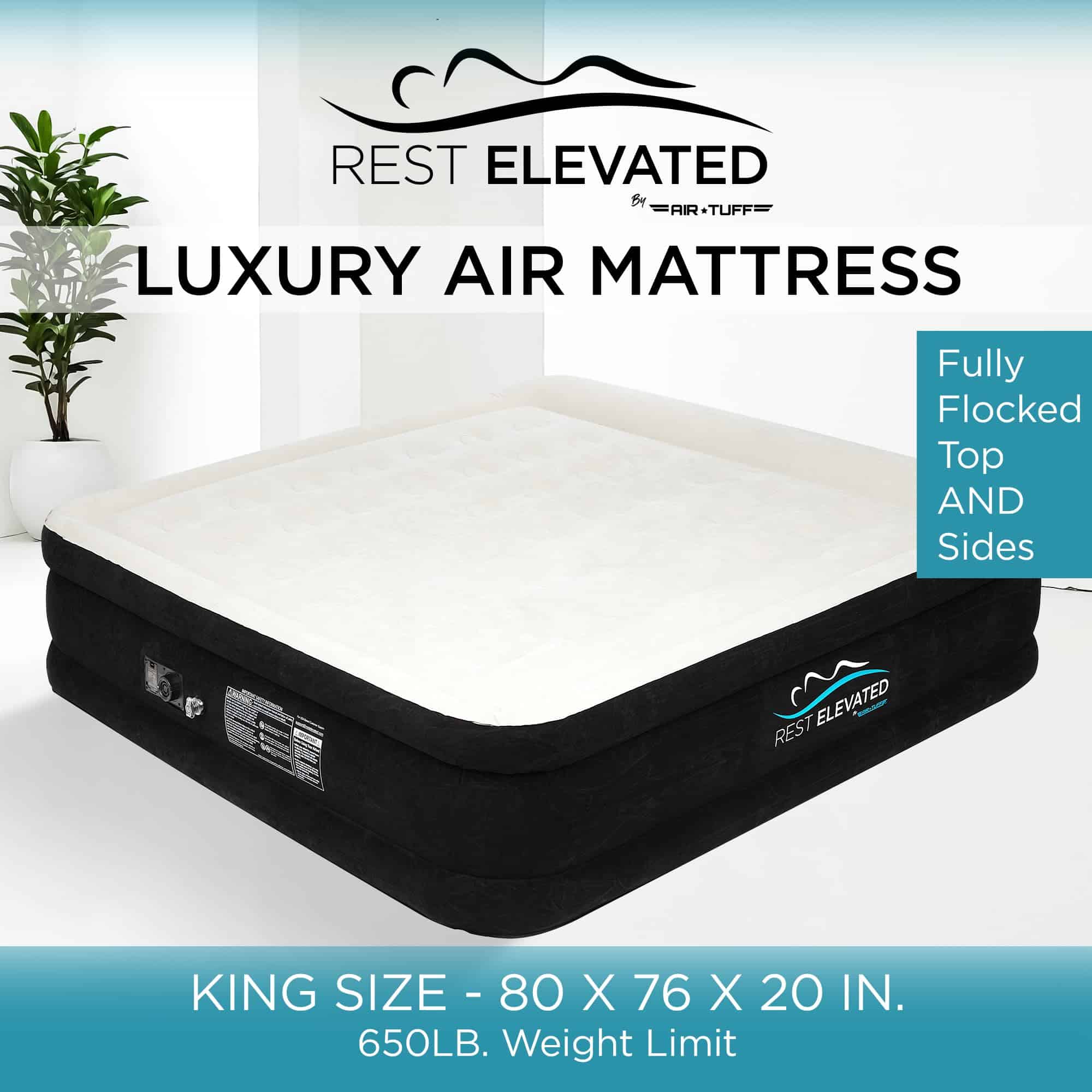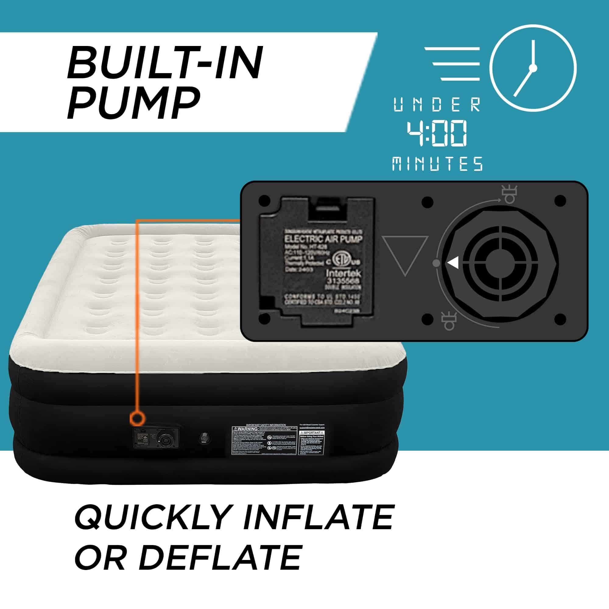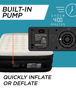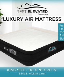 El colchón de aire de lujo RestElevated brinda comodidad y conveniencia con su altura de 20″, soporte de bobina para un mejor apoyo, y bomba incorporada para una fácil inflado. Ideal para uso en el hogar, recibir visitas y actividades de camping. La parte superior acolchada en color negro con parte superior crema le da un aspecto elegante que se adapta a cualquier ambiente. ¡Descansa y disfruta de un sueño reparador en este colchón de aire de calidad superior!