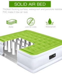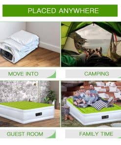 Tamaño del producto: 75″ x 54″ x 18″. Límite de peso: 600 libras. Dimensiones del paquete: 16″ x 11″ x 7 1/2″. Peso del artículo: 15.4 libras. Información de la bomba eléctrica: 120VAC, 60Hz, 1.15A. El colchón de aire YENING con bomba incorporada adopta el color verde, se puede inflar rápidamente en 3-4 minutos, la superficie de felpa acolchada resistente al agua te hace sentir más cómodo. Brinda soporte de cabeza a pies con capacidad de 600 lbs. Nuestro colchón de aire está diseñado para uso en el hogar, adecuado para invitados y amigos que se quedan a pasar la noche, también puedes llevarlo contigo cuando viajas y acampas.