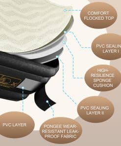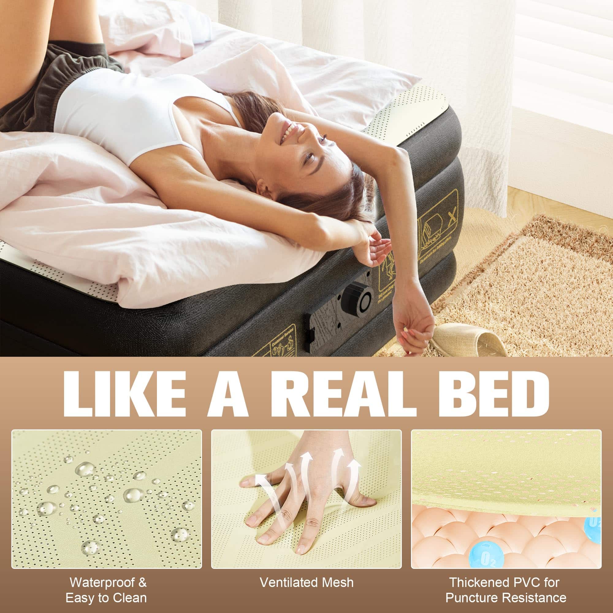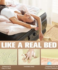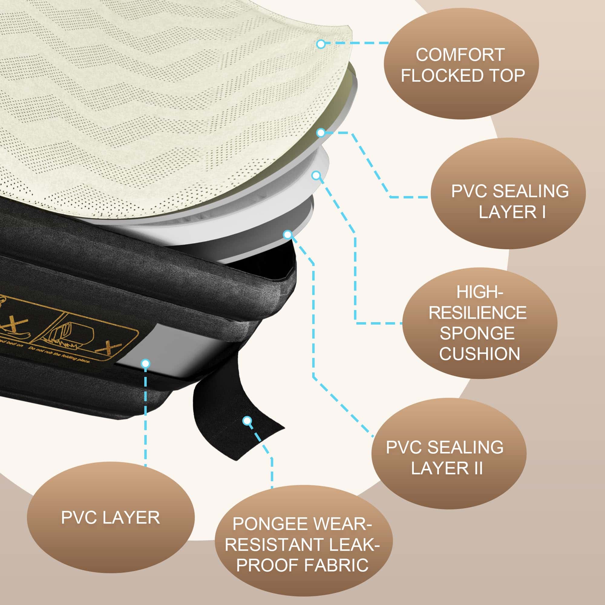 2. Microfibra Aterciopelada y Resistente a las Arrugas: La superficie del colchón inflable está hecha de microfibra suave de alta calidad con un diseño acolchado que resiste las arrugas y proporciona una superficie de descanso suave como el terciopelo. El colchón hinchable cuenta con múltiples capas de material impermeable extra grueso, promete durabilidad y resistencia a los pinchazos. No solo es impermeable, sino que también proporciona una superficie suave y lujosa para un sueño sin ruidos todas las noches.
