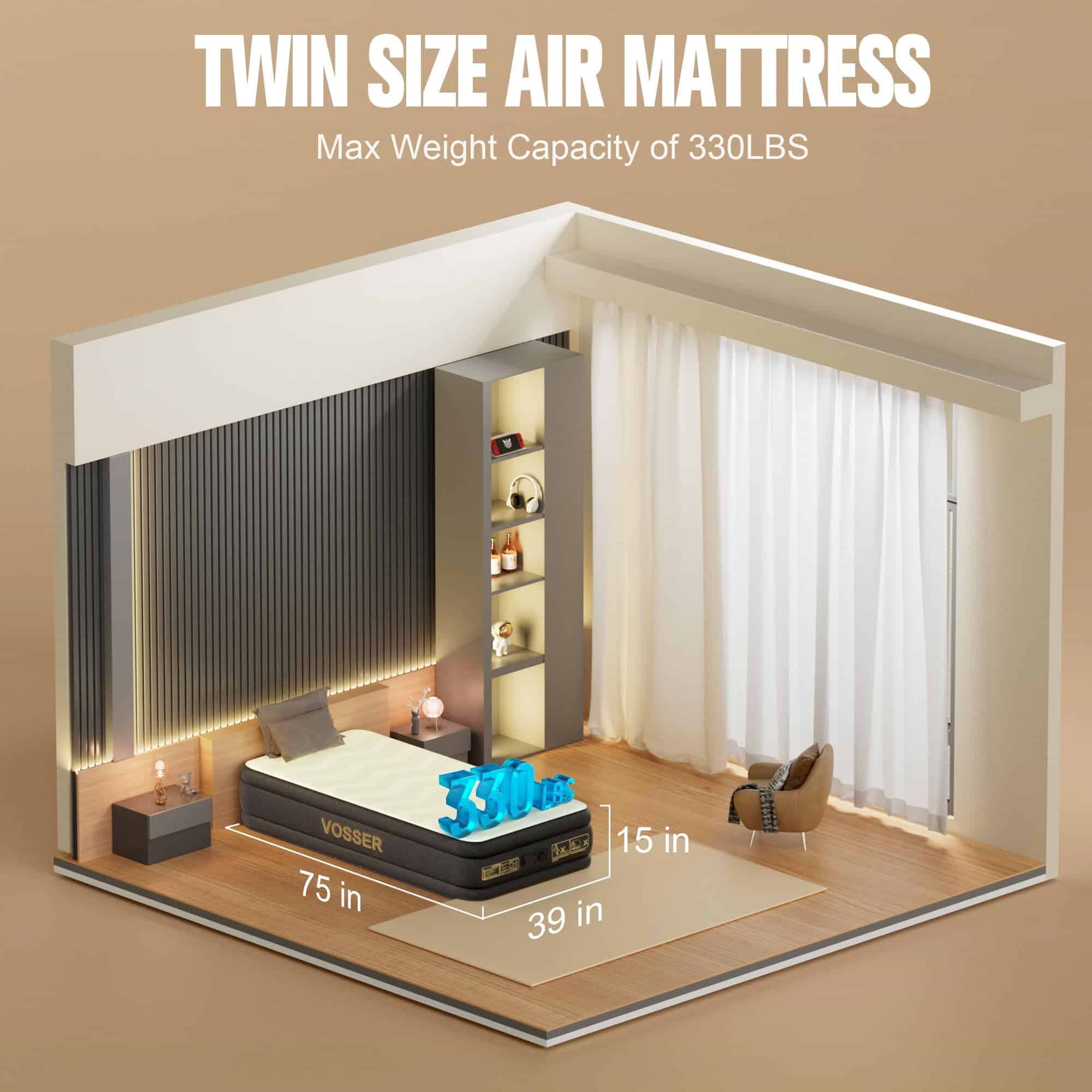 Referencia única de ASIN con bomba integrada: B0CZDYJSGT – El colchón de aire gemelo VOSSER es la solución perfecta para una cama temporal de rápido montaje y desmontaje con todas las comodidades de una cama convencional. Con un diseño innovador que incluye un topper de espuma y orificios de ventilación, este colchón inflable brinda un confort excepcional y una superficie plana que te hará sentir como si estuvieras durmiendo en una cama de verdad. La superficie de microfibra aterciopelada resiste las arrugas y proporciona una sensación suave y cómoda para un sueño sin interrupciones. El colchón hinchable tiene múltiples capas de material impermeable extra grueso que garantizan durabilidad y resistencia a los pinchazos. Equipado con una bomba integrada que infla o desinfla el colchón en tan solo 2 minutos, este colchón es conveniente para usar en casa, acampar, recibir invitados o viajar. Con un diseño interno avanzado que garantiza estabilidad y soporte óptimo para el cuerpo, este colchón de aire gemelo promueve una postura de sueño más saludable y alivia los puntos de presión. La base antideslizante proporciona una estabilidad excepcional, evitando movimientos no deseados mientras duermes. Respaldado por una garantía del fabricante de 2 años, VOSSER se compromete a ofrecer calidad y satisfacción con cada colchón inflable que venden. Disfruta de un sueño reparador y sin preocupaciones con el colchón de aire gemelo VOSSER.