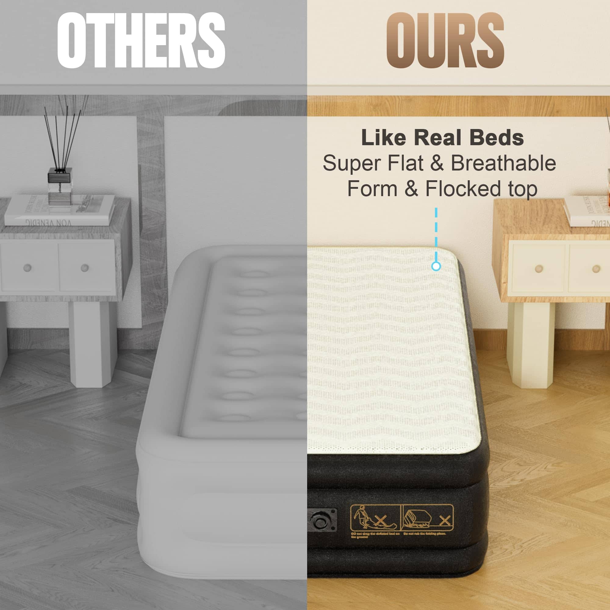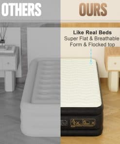 4. Soporte Óptimo: Diseñado con una estructura interna avanzada, nuestro colchón de aire gemelo se mantiene herméticamente hermético mientras brinda soporte adicional al cuerpo, promoviendo una postura de sueño más saludable y aliviando los puntos de presión. Con medidas de 75» x 39» x 15» y una capacidad de peso máxima de 330 libras, proporcionan una excelente estabilidad para una noche de sueño reparador.