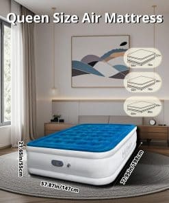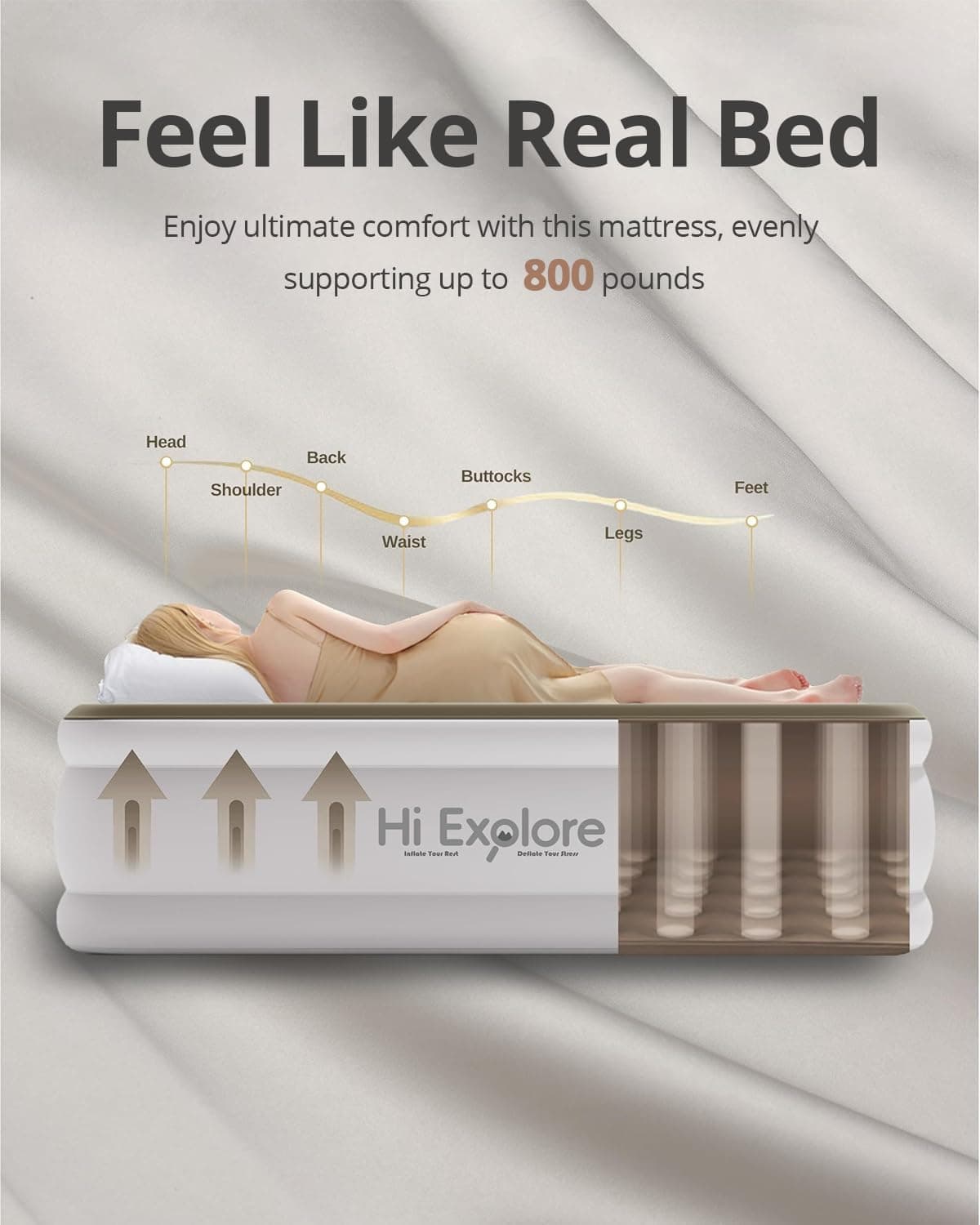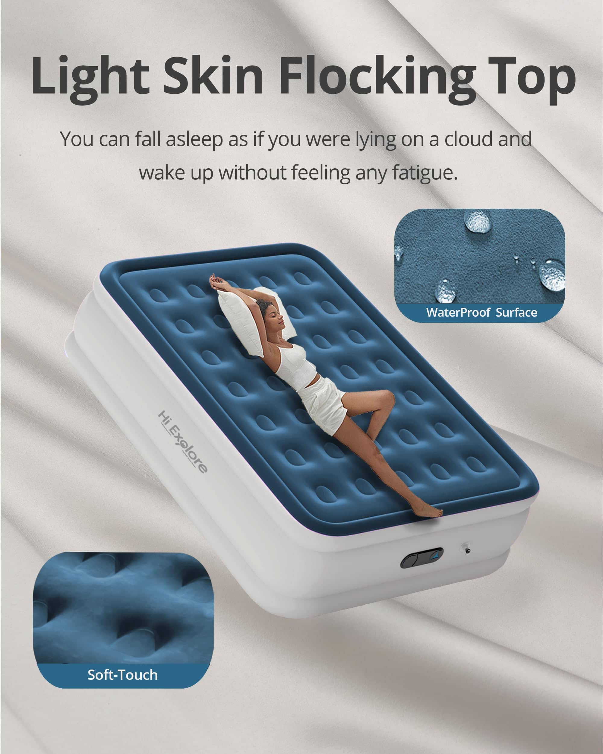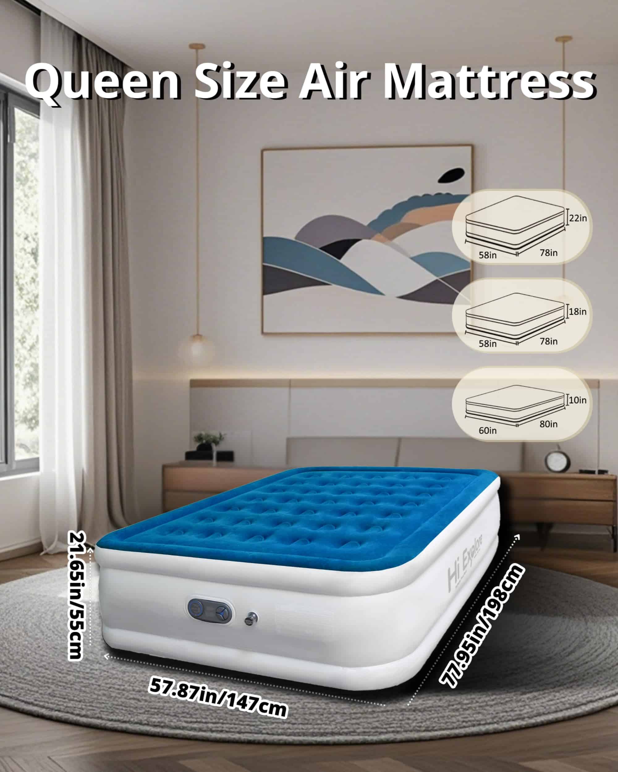 Colchón de aire Hi Explore Queen con bomba integrada, con un diseño de felpa de primera calidad. Fabricado con una capa superior de felpa, nuestro colchón de aire garantiza una experiencia de sueño increíblemente acogedora. La superficie de felpa es impermeable y neutraliza los olores, garantizando una noche de sueño serena y tranquila. Nuestro colchón de aire Queen con bomba integrada cuenta con una construcción interna de bobina de alta resistencia para soporte y estabilidad sólidos. Hecho con material de PVC grueso, evita fugas de aire y hundimientos, ofreciendo durabilidad impermeable y resistente a perforaciones para una comodidad, estabilidad y soporte duraderos. Dimensiones infladas de 22 pulgadas de altura: 80 x 60 x 22, capacidad de carga de 800 libras. Nuestro colchón de aire presenta un Diseño de Altura de Borde de Seguridad. agregando espacio adicional para dormir y estabilidad para un sueño más seguro. El borde elevado evita que los teléfonos, almohadas y sábanas se deslicen, garantizando un entorno de sueño ordenado y cómodo. Este detalle mejora tu descanso, manteniendo tu ropa de cama en su lugar toda la noche. La característica de autoinflado de nuestra cama de aire permite un embalaje rápido y conveniente después de su uso. Fácil de almacenar y transportar, la cama de aire incluye una bolsa de almacenamiento para viajes, lo que la hace perfecta para huéspedes nocturnos, amigos, parientes y viajes de campamento. Tenga en cuenta que a medida que utiliza el colchón de aire, su material se expandirá y estirará naturalmente. Es posible que notes algo que parece estar perdiendo aire, pero tenga la seguridad de que esto es normal. Para mantener el colchón firme y en condiciones óptimas, todo lo que necesitas hacer es reinflarlo regularmente. Si tienes alguna pregunta, siempre estamos a tu servicio.