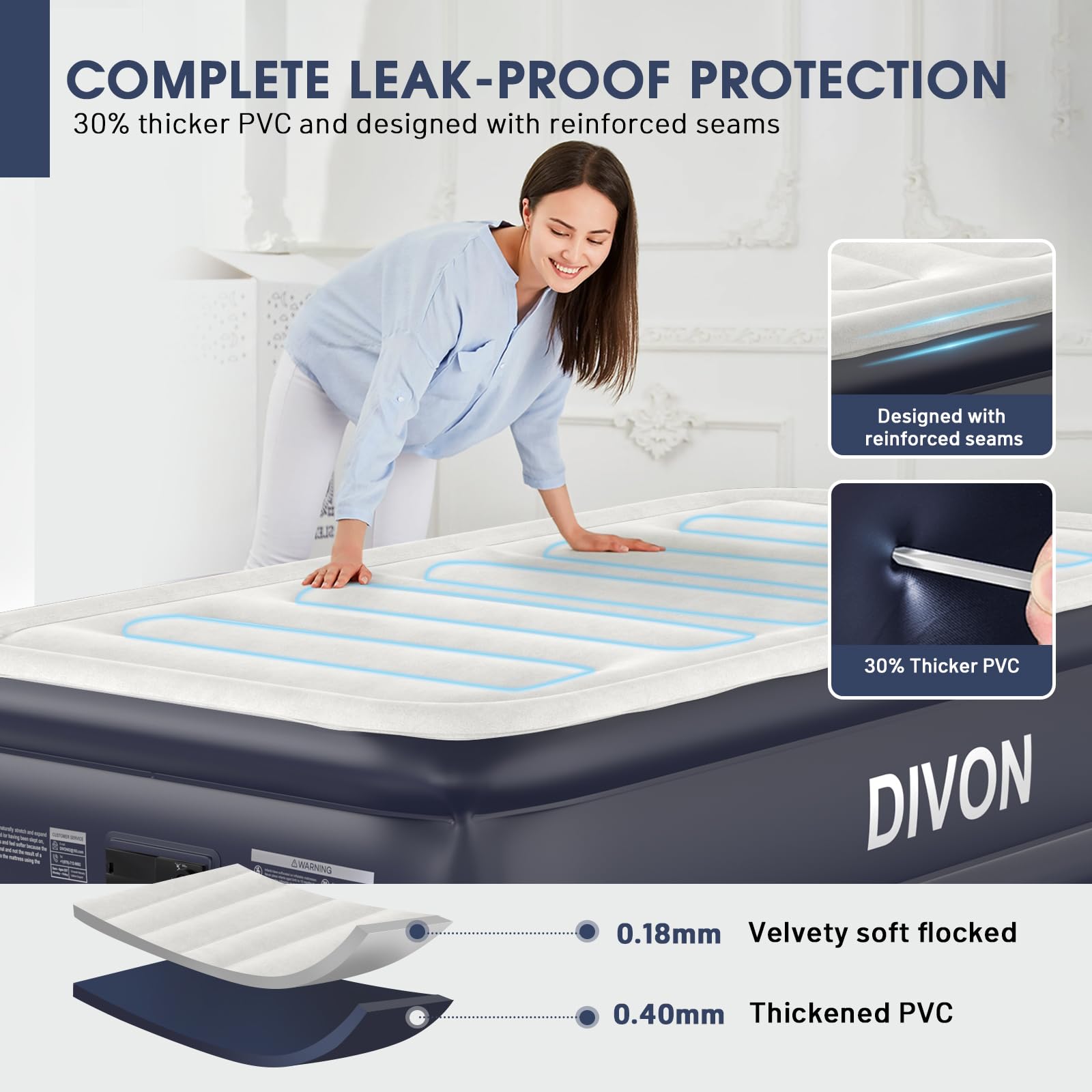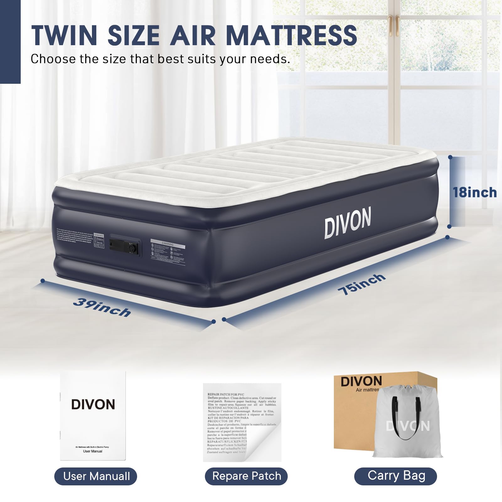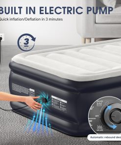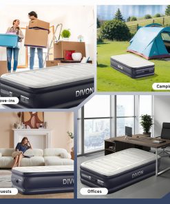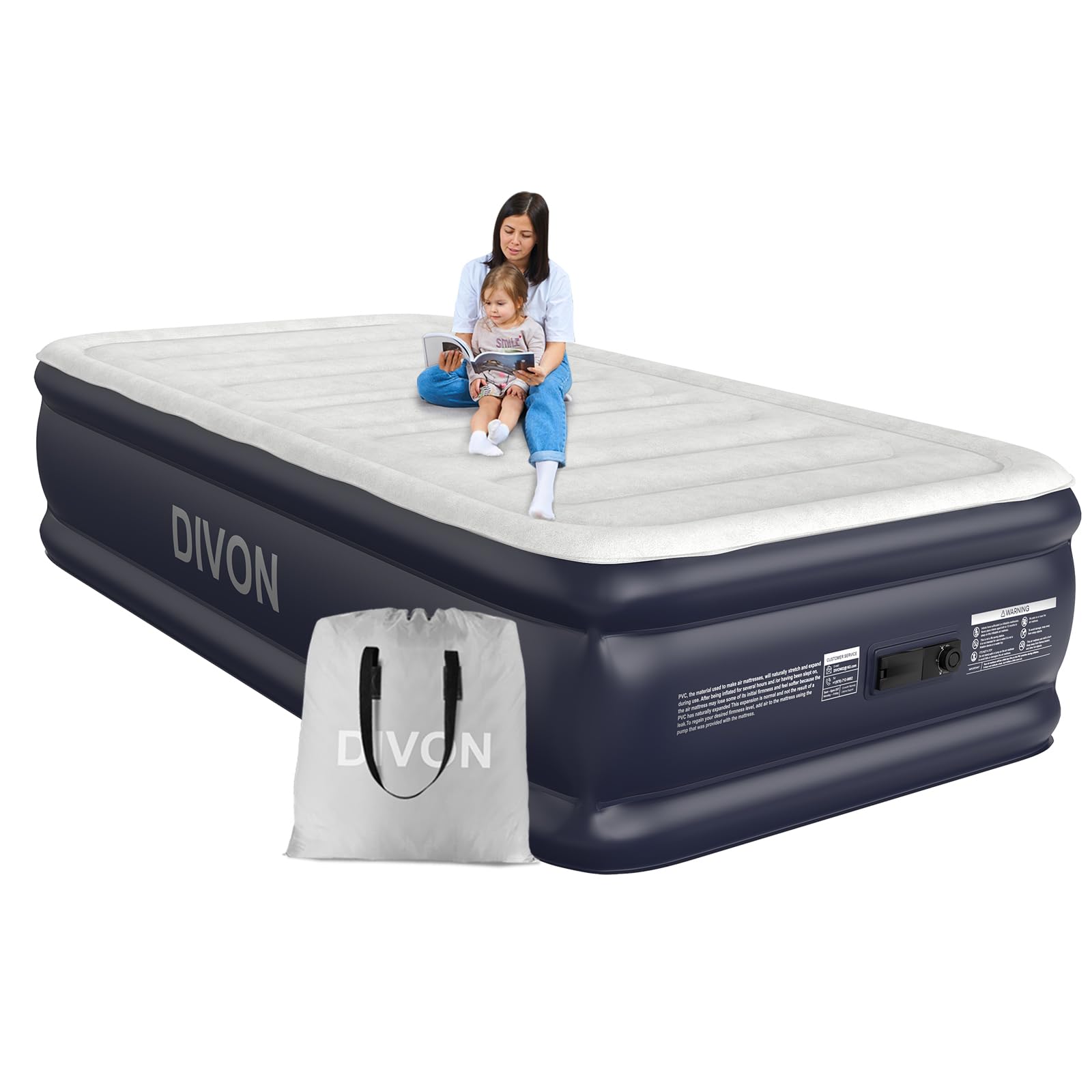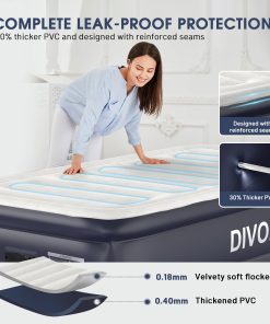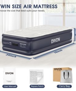 Colchón de Aire Individual con Bomba Incorporada, Colchón Inflable Elevado de 18», Inflado/Desinflado Automático en 2 Minutos, Colchón de Aire Más Grueso Mejorado, Cama de Aire con Parte Superior Aterciopelada y Bolsa de Almacenamiento para Invitados, Hogar, Camping – Lujosamente Cómodo con Parte Superior Impermeable Acolchada: Colchón de aire individual con parte superior impermeable aterciopelada DIVON que presenta una superficie aterciopelada e impermeable que es suave, fácil de limpiar y proporciona la máxima comodidad para un sueño tranquilo todas las noches. Experimenta una experiencia de sueño incomparable con su diseño lujoso. – Material Engrosado y Base Antideslizante: Fabricado con material ecológico, engrosado que es un 30% más grueso que las marcas estándar, este colchón de aire es lo suficientemente duradero como para soportar las garras juguetonas de tus mascotas sin perforaciones ni escapes. La base antideslizante garantiza que el colchón se mantenga en su lugar y reduce el ruido, sin importar cómo te des vuelta, la cama se mantiene quieta y en silencio, asegurando una noche de sueño cómoda. – Construcción Patentada de Viga Vertical: Colchón de aire individual con bomba incorporada construido con una innovadora construcción interna patentada que utiliza miles de fibras de poliéster de alta resistencia, proporciona una estabilidad excepcional y un soporte sólido. Puede soportar hasta 330 libras sin hundirse, asegurando que la cama mantenga su forma tanto para dormir como para descansar, no tienes que preocuparte por que se vuelque o se colapse. – Bomba Eléctrica Incorporada Conveniente: El colchón de aire individual DIVON está equipado con una bomba eléctrica incorporada de 110V, simplemente gira la perilla para inflar/desinflar silenciosamente el colchón inflable individual en solo 2 minutos. Siempre puedes girar la perilla durante unos segundos para inflar o desinflar a tu nivel de comodidad deseado. Después de usarlo, guarda fácilmente el cable de alimentación en la caja de almacenamiento, fácil de configurar y empacar. – Diseño Portátil y Versátil: Colchón de aire individual extendido con bomba incorporada mide 80 x 39 x 18 y pesa solo 14 libras, este colchón inflable individual ligero viene con una práctica bolsa de transporte para facilitar su transporte. Perfecto para recibir invitados, acampar o como un regalo pensativo, es fácil de almacenar y está listo para cualquier ocasión. – Calidad Confiable y Satisfacción del Cliente: El PVC se estira naturalmente durante el uso inicial, lo que puede requerir inflado adicional para mantener la firmeza. Se asienta completamente dentro de 2 a 3 noches. DIVON ofrece una garantía de fabricante sin riesgos de 1 año y soporte de por vida para su tranquilidad. Para cualquier problema, responderemos rápidamente dentro de las 24 horas.