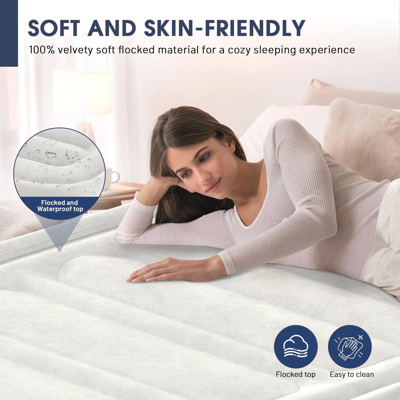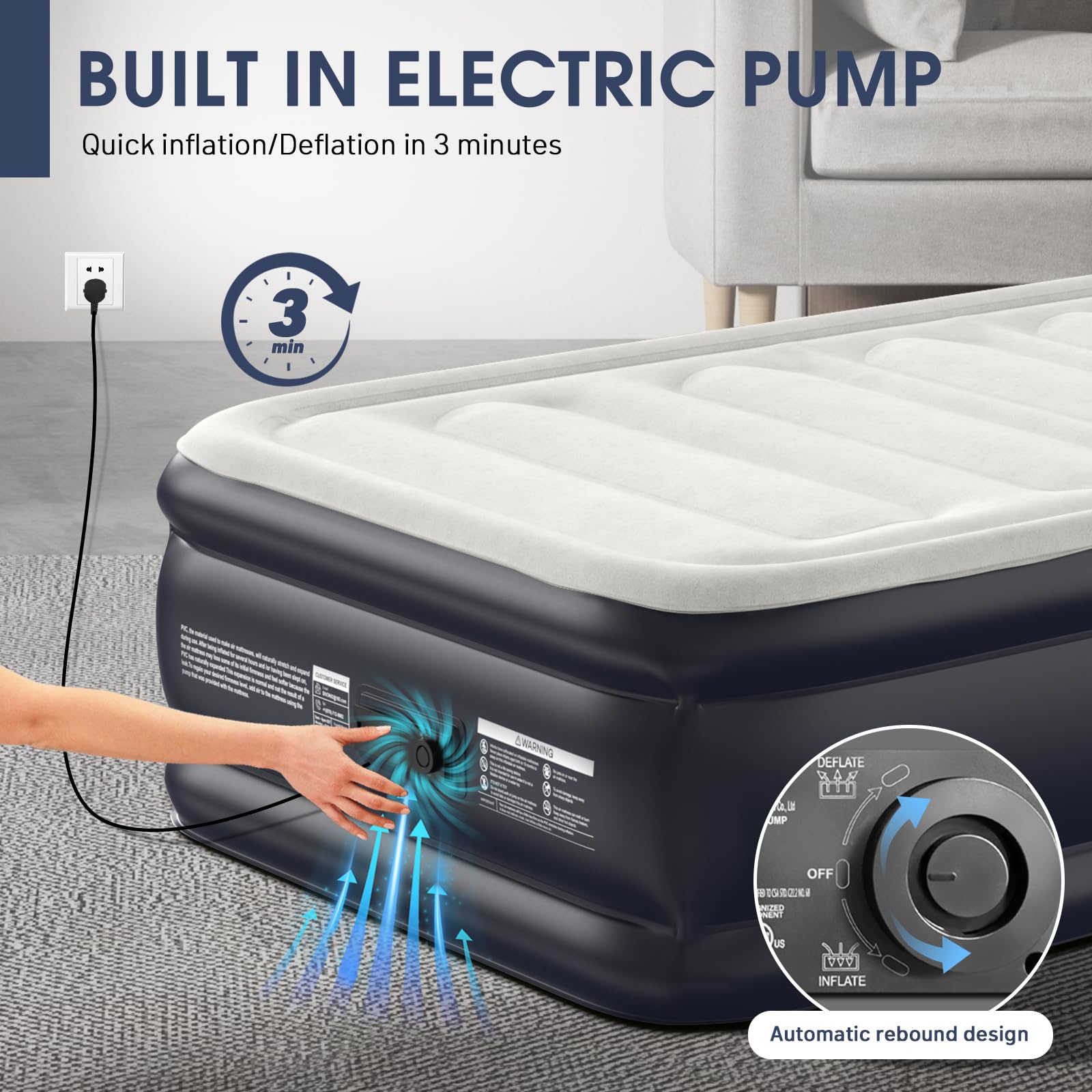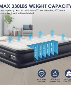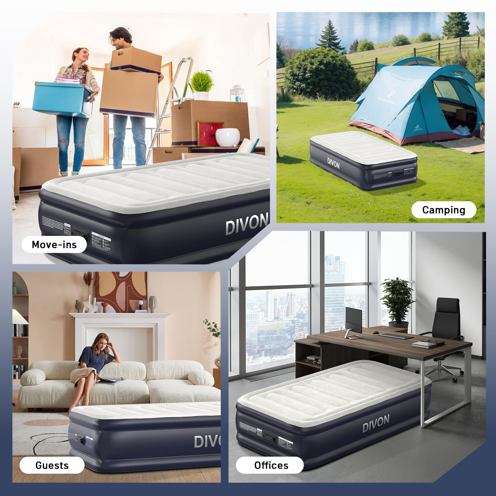 Colchón de Aire Individual con Bomba Incorporada, Colchón Inflable Elevado de 18», Inflado/Desinflado Automático en 2 Minutos, Colchón de Aire Más Grueso Mejorado, Cama de Aire con Parte Superior Aterciopelada y Bolsa de Almacenamiento para Invitados, Hogar, Camping – Lujosamente Cómodo con Parte Superior Impermeable Acolchada: Colchón de aire individual con parte superior impermeable aterciopelada DIVON que presenta una superficie aterciopelada e impermeable que es suave, fácil de limpiar y proporciona la máxima comodidad para un sueño tranquilo todas las noches. Experimenta una experiencia de sueño incomparable con su diseño lujoso. – Material Engrosado y Base Antideslizante: Fabricado con material ecológico, engrosado que es un 30% más grueso que las marcas estándar, este colchón de aire es lo suficientemente duradero como para soportar las garras juguetonas de tus mascotas sin perforaciones ni escapes. La base antideslizante garantiza que el colchón se mantenga en su lugar y reduce el ruido, sin importar cómo te des vuelta, la cama se mantiene quieta y en silencio, asegurando una noche de sueño cómoda. – Construcción Patentada de Viga Vertical: Colchón de aire individual con bomba incorporada construido con una innovadora construcción interna patentada que utiliza miles de fibras de poliéster de alta resistencia, proporciona una estabilidad excepcional y un soporte sólido. Puede soportar hasta 330 libras sin hundirse, asegurando que la cama mantenga su forma tanto para dormir como para descansar, no tienes que preocuparte por que se vuelque o se colapse. – Bomba Eléctrica Incorporada Conveniente: El colchón de aire individual DIVON está equipado con una bomba eléctrica incorporada de 110V, simplemente gira la perilla para inflar/desinflar silenciosamente el colchón inflable individual en solo 2 minutos. Siempre puedes girar la perilla durante unos segundos para inflar o desinflar a tu nivel de comodidad deseado. Después de usarlo, guarda fácilmente el cable de alimentación en la caja de almacenamiento, fácil de configurar y empacar. – Diseño Portátil y Versátil: Colchón de aire individual extendido con bomba incorporada mide 80 x 39 x 18 y pesa solo 14 libras, este colchón inflable individual ligero viene con una práctica bolsa de transporte para facilitar su transporte. Perfecto para recibir invitados, acampar o como un regalo pensativo, es fácil de almacenar y está listo para cualquier ocasión. – Calidad Confiable y Satisfacción del Cliente: El PVC se estira naturalmente durante el uso inicial, lo que puede requerir inflado adicional para mantener la firmeza. Se asienta completamente dentro de 2 a 3 noches. DIVON ofrece una garantía de fabricante sin riesgos de 1 año y soporte de por vida para su tranquilidad. Para cualquier problema, responderemos rápidamente dentro de las 24 horas.