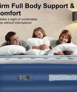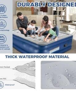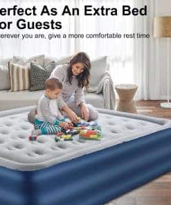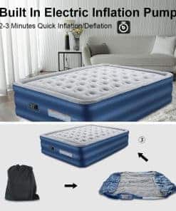 Colchón de Aire Queen con Bomba Incorporada, Colchón Inflable en 3 Minutos Autoinflable/Desinflable, Plegable, Colchón de Aire para el Hogar y los Invitados, 80x60x18in. Este colchón inflable está equipado con una bomba eléctrica incorporada, capaz de inflarse/desinflarse rápidamente en 3 minutos. Tamaño del empaque de 12.99 6.89 16.14in, pesa 18.29 libras. Después de usar, puedes guardar los cables de alimentación en la caja de almacenamiento, fácil de configurar y guardar. Nuestro colchón de aire queen tiene una dimensión inflada de 80 60 18in y una capacidad máxima de carga de 660 libras, lo que lo hace adecuado para todas las sábanas de tamaño queen y lo suficientemente grande para que una a tres personas duerman cómodamente, ofreciendo un excelente soporte y comodidad. El colchón inflable cuenta con una superficie flocada engrosada que proporciona soporte de la cabeza a los pies. Es resistente al agua y a los pinchazos, y la parte inferior está hecha de material de PVC duradero para reducir la fricción con el suelo y prolongar la vida útil de la cama inflable. Especialmente diseñado para uso en el hogar, adecuado para que los invitados y amigos se queden a pasar la noche, y también se puede llevar durante los viajes y acampadas. Ya sea en interiores o exteriores, nuestros colchones de aire son perfectos para satisfacer tus necesidades temporales de sueño. Se puede utilizar en casa, acampando o en cualquier otra ocasión, haciéndolo conveniente para su uso al salir o alojarse con invitados.