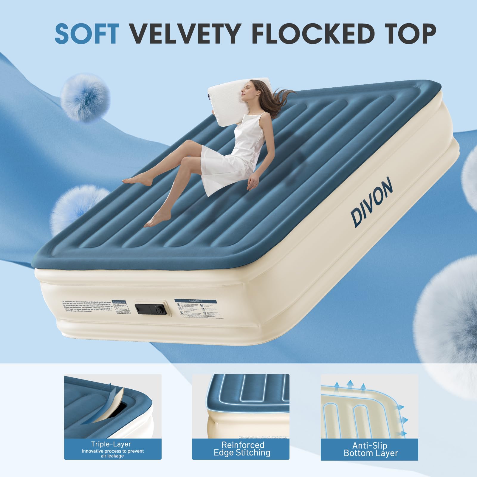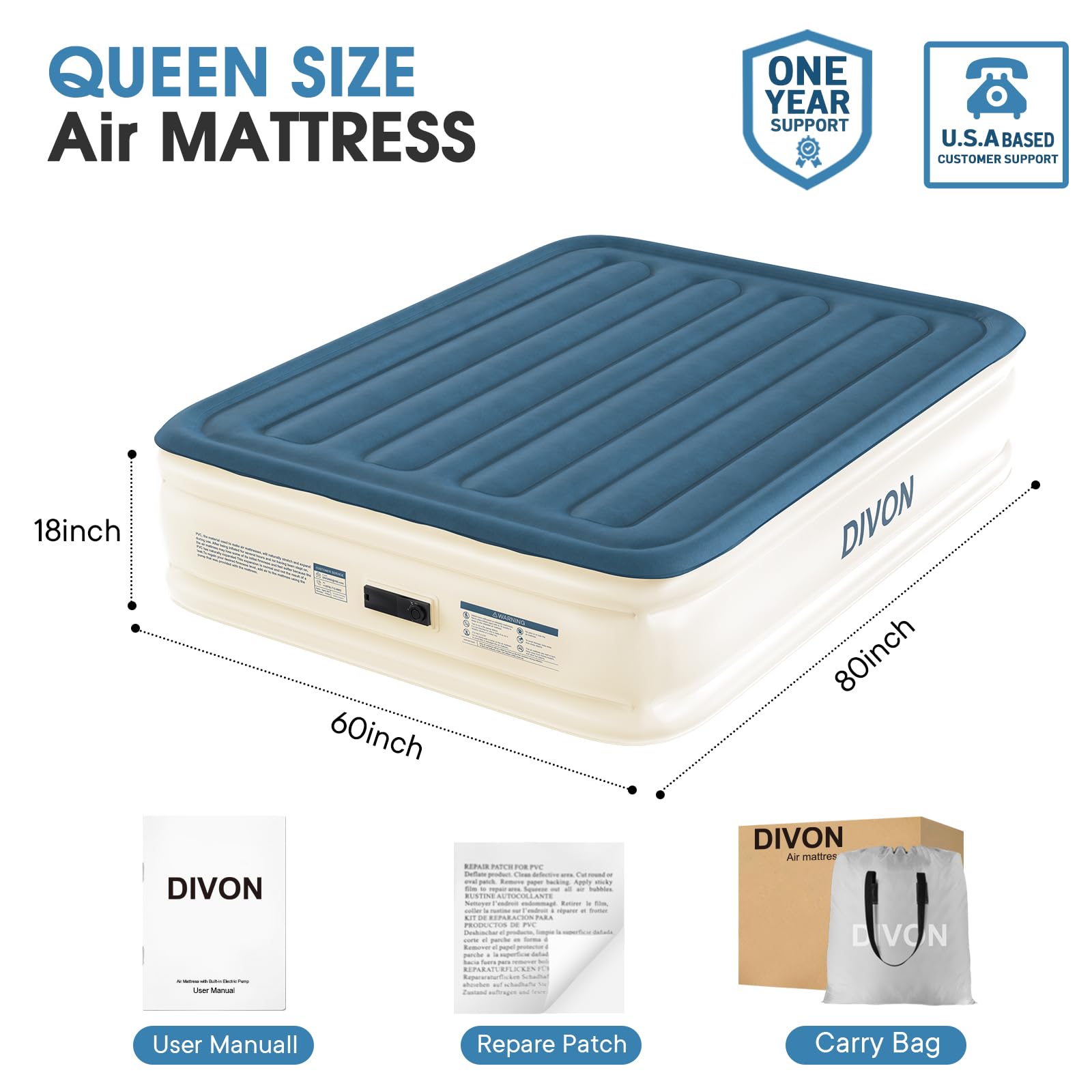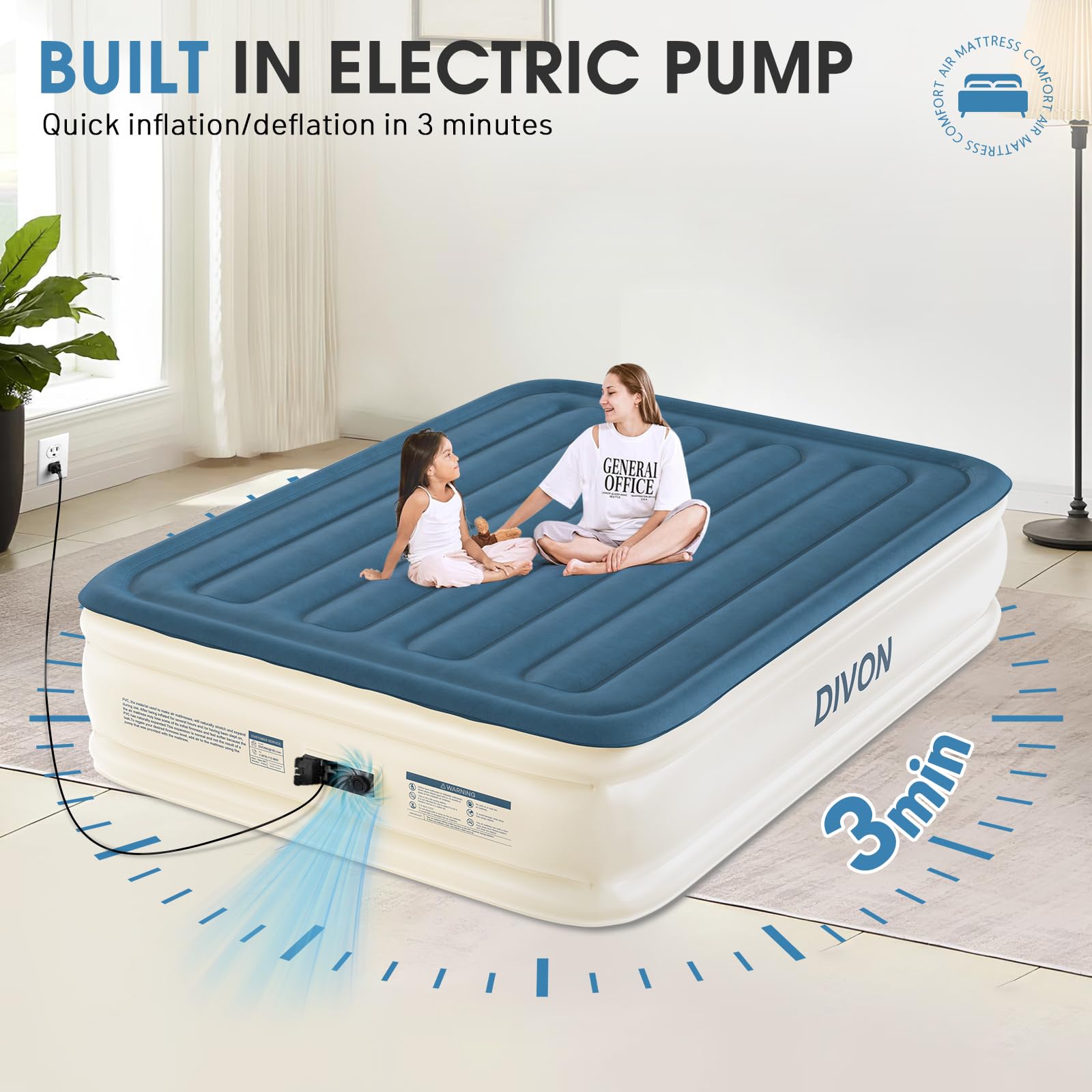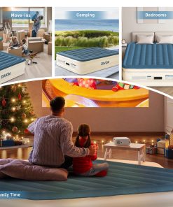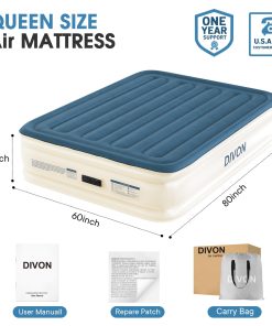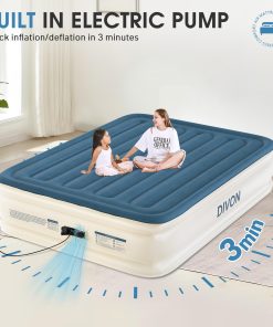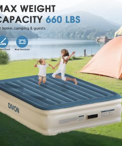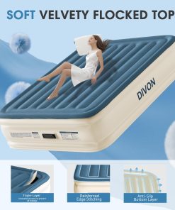 El Colchón de Aire Queen DIVON con Bomba Incorporada es la solución perfecta para tener un lugar cómodo para dormir en cualquier momento y lugar. Con su construcción duradera y a prueba de fugas, este colchón de aire tamaño queen garantiza una noche de sueño reparador. La innovadora tecnología de soporte con estructura interna «I-Beam» asegura una máxima estabilidad y confort, soportando hasta 660 lbs de peso.