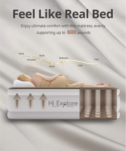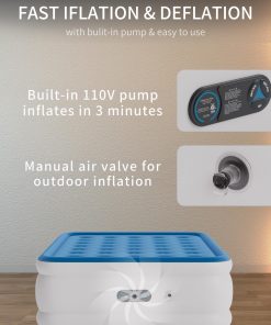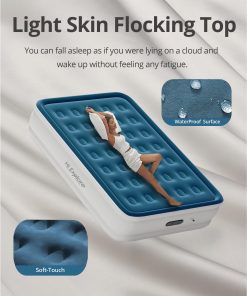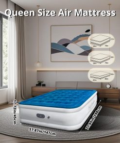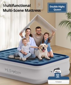 Colchón de Aire Queen Hi Explore con Bomba Incorporada Altura Elevada, con Cómodo Terciopelo, Colchón Inflable, Cama de Aire Portátil para el Hogar, Invitados, Camping (Azul, Altura de 18″) – Colchón de aire premium Queen con bomba incorporada: inflación y deflación rápida y fácil con nuestro sistema de bomba integrado. Perfecto para el confort en el hogar y aventuras al aire libre, se infla completamente en solo 3 minutos y mantiene el aire durante días. Ajuste la inflación a su nivel de comodidad deseado con facilidad! – Diseño de Terciopelo de Lujo: confeccionado con una capa superior de terciopelo suave, nuestro colchón de aire garantiza una experiencia de sueño increíblemente acogedora. La superficie de terciopelo es impermeable y neutraliza los olores, garantizando una noche de sueño serena y tranquila. – Construcción Estable Mejorada: nuestro colchón de aire Queen con bomba incorporada cuenta con una construcción interna de haces de bobina para un sólido soporte y estabilidad. Hecho con material de PVC grueso, evita las fugas de aire y el hundimiento, ofreciendo durabilidad impermeable y resistente a pinchazos para una comodidad, estabilidad y soporte duraderos. Dimensiones infladas: 203 x 152 x 46 cm, capacidad de carga de 600 libras. – Detalles Reflexivos: nuestro colchón de aire presenta un Diseño de Altura de Borde de Seguridad, agregando espacio y estabilidad para un sueño más seguro. El borde elevado evita que los teléfonos, almohadas y sábanas se deslicen, asegurando un entorno de sueño ordenado y cómodo. Este detalle mejora su descanso, manteniendo su ropa de cama en su lugar toda la noche. – Portátil y Fácil Almacenamiento: la función autoinflable de nuestra cama de aire permite un embalaje rápido y conveniente después del uso. Fácil de almacenar y transportar, el colchón inflable incluye una bolsa de almacenamiento de viaje, haciéndolo perfecto para invitados de noche, amigos o familiares, y viajes de camping. Tenga en cuenta que a medida que use el colchón de aire, su material se expandirá y estirará naturalmente. Puede notar algo que parece que está goteando, pero tenga la seguridad de que esto es normal. Para mantener el colchón firme y en condiciones óptimas, todo lo que necesita hacer es volver a inflarlo regularmente. Si tiene alguna pregunta, estamos siempre a su servicio.