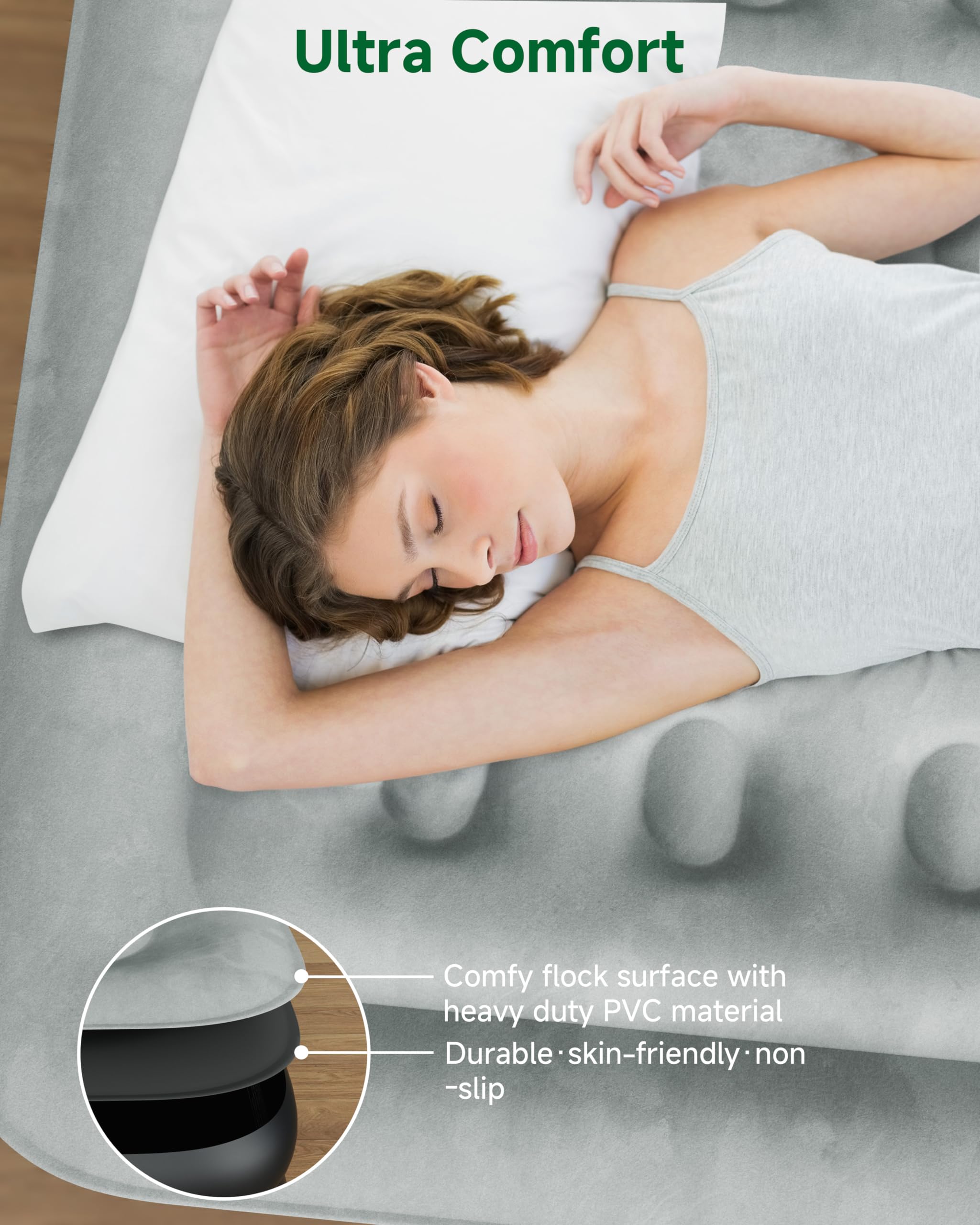 1. Inflado rápido y sin esfuerzo Equipado con una bomba de aire incorporada de alta velocidad, el colchón de aire Sebor twin ofrece una experiencia de configuración sin complicaciones. En solo unos minutos, su colchón inflable estará listo para una noche de confort incomparable, permitiéndole relajarse sin luchas de inflado. 2. Soporte estable y confiable Disfrute de un soporte supremo con la estructura interna de Coil-Beam de nuestro colchón de aire twin. Diseñado para un confort óptimo, el diseño Coil-Beam con una altura de 18 pulgadas refleja la cama tradicional, garantizando una noche de sueño reparador. Abrace el lujo de nuestra cama inflable, diseñada pensando en su bienestar. 3. Diseño cómodo y de calidad Sumérjase en el confort esponjoso de nuestro colchón hinchable, con una superficie flocada suave y material de PVC premium que prioriza la comodidad y garantiza durabilidad. Con dimensiones de 80″ x 39″ x 18″ y una capacidad de carga robusta de 300 lb, garantiza un amplio espacio y soporte para un sueño reparador en cualquier lugar. 4. Funcionalidad conveniente y versátil El colchón de aire autoinflable Sebor está listo para cualquier situación. La bolsa de almacenamiento permite un almacenamiento y transporte sin esfuerzo. Ya sea para recibir invitados o mudarse a una nueva casa, nuestro colchón es su compañero adaptable. 5. Servicio asegurado y profesional Tenga la seguridad de que nuestra garantía de un año respalda nuestro compromiso con la satisfacción. Nuestro equipo dedicado está aquí para ayudarlo con cualquier inquietud o pregunta, asegurando que su experiencia con el Colchón de Aire Sebor Twin sea nada menos que excepcional. No dude en contactarnos en cualquier momento. Elija el confort con confianza; elija Sebor.