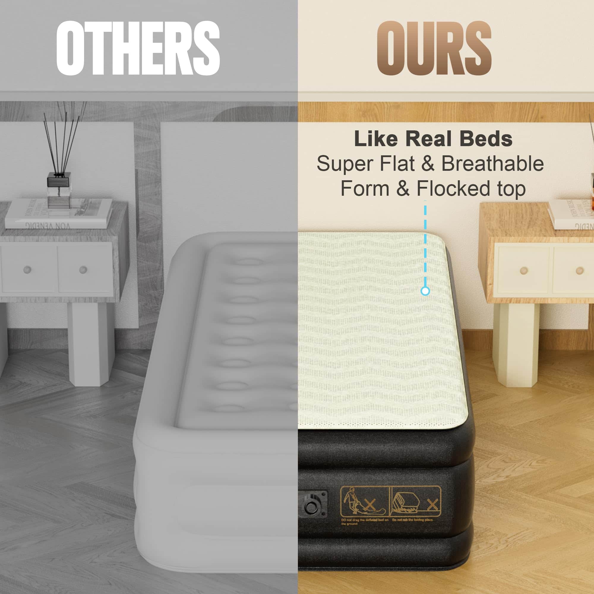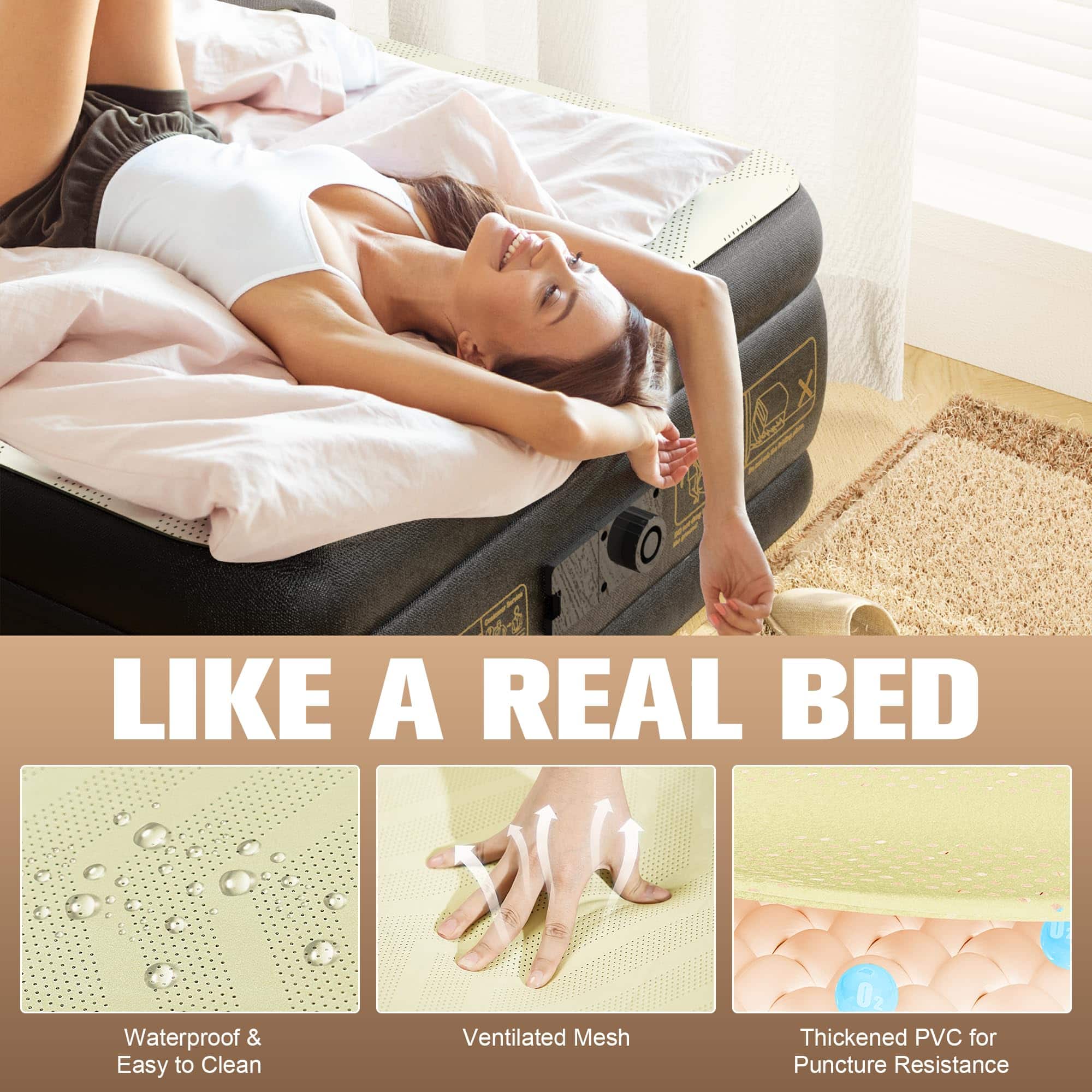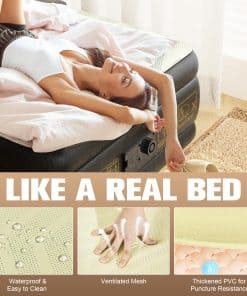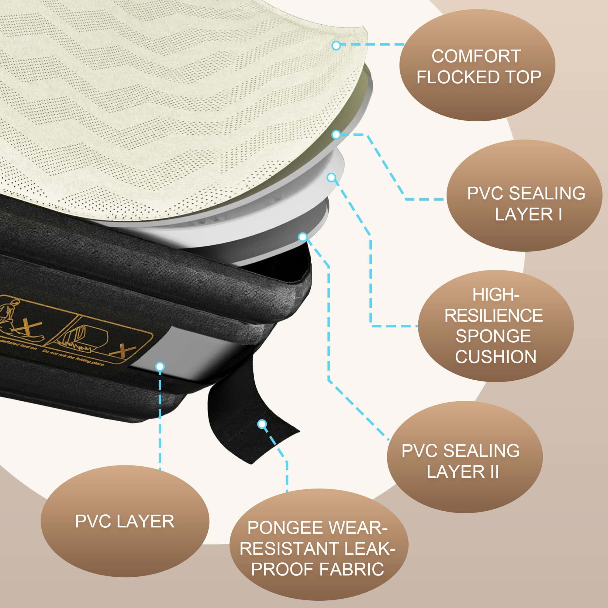 2. Microfibra Aterciopelada y Resistente a las Arrugas: La superficie del colchón inflable está hecha de material de microfibra aterciopelada suave de alta calidad con un diseño acolchado que resiste las arrugas y proporciona una suave superficie para dormir, el colchón inflable cuenta con múltiples capas de material impermeable extra grueso, promete durabilidad y resistencia a pinchazos. No solo es impermeable, sino que también proporciona una suave superficie para un sueño silencioso todas las noches.