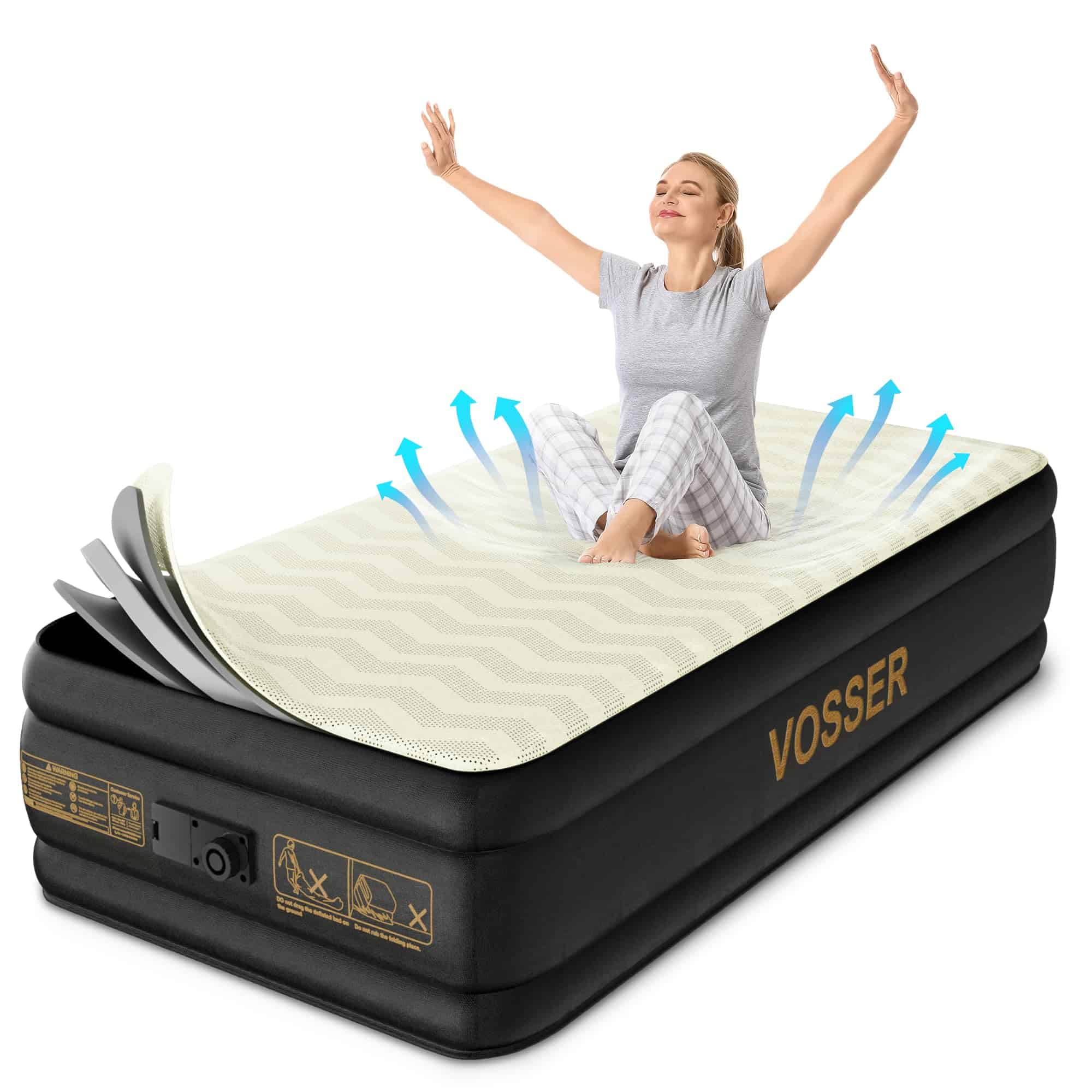 1. Diseño único de Cubrecolchón de Espuma y Orificios de Ventilación: A diferencia de los colchones inflables típicos, el colchón de aire VOSSER cuenta con un cubrecolchón de espuma que proporciona una superficie muy plana, te hace sentir como en una cama real y elimina tu fatiga. Experimenta un confort incomparable. El diseño de orificios de ventilación único garantiza un flujo de aire óptimo para una noche de sueño refrescante.