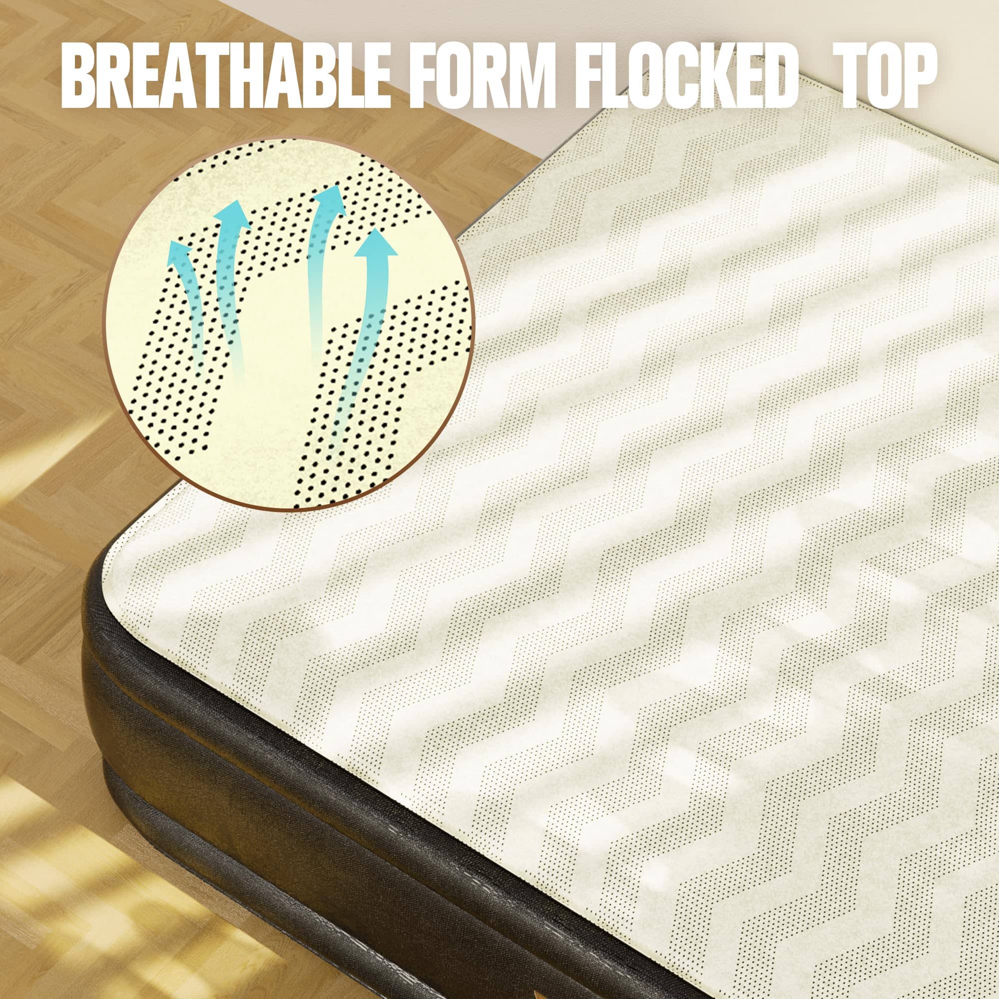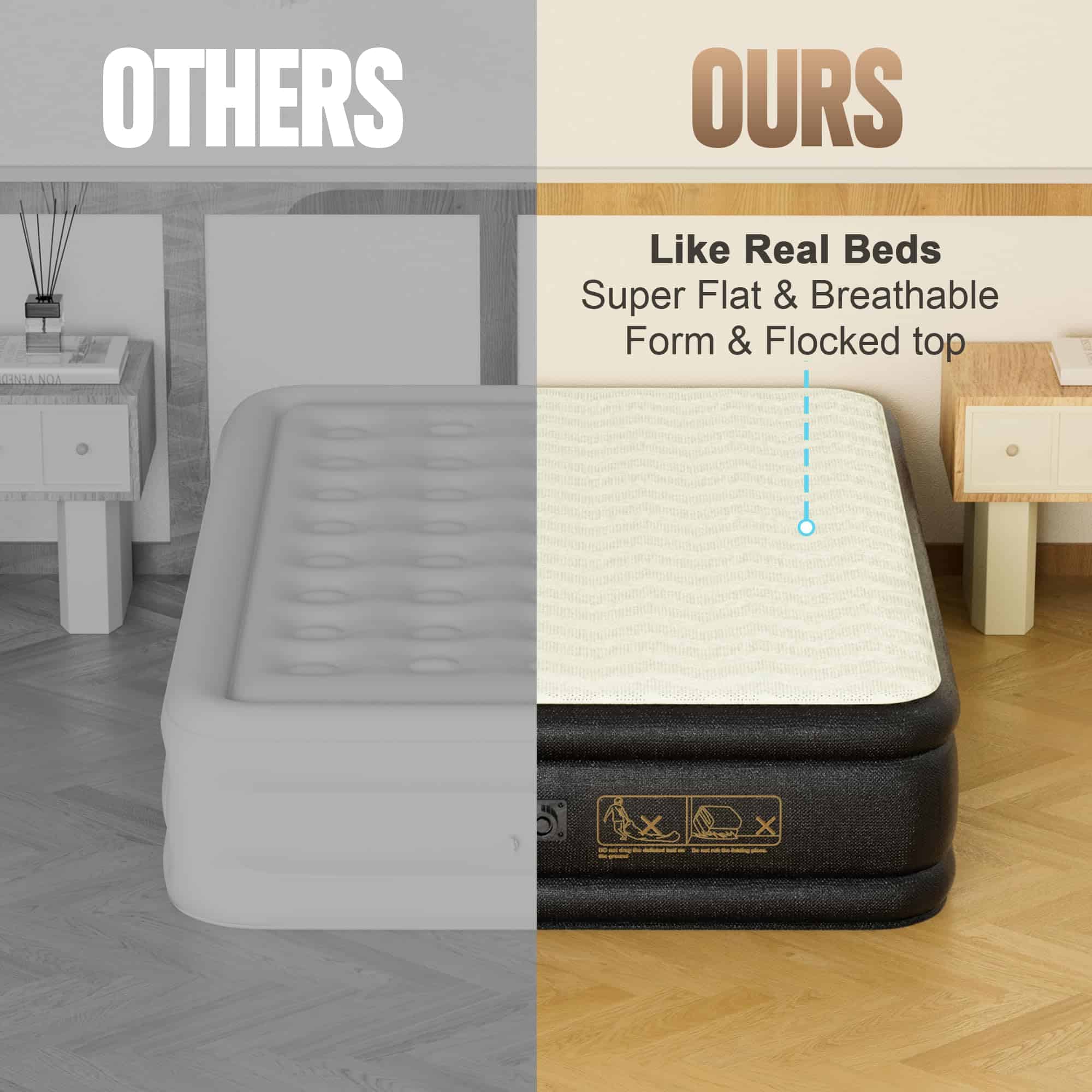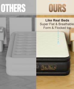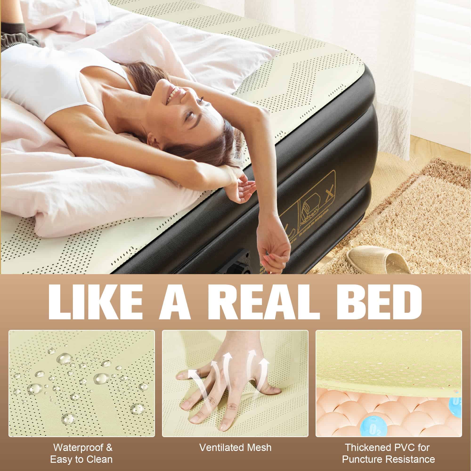 La superficie del colchón inflable está hecha de material microfibra suave de primera calidad con un diseño acolchado que resiste las arrugas y ofrece una superficie de sueño suave y aterciopelada. El colchón inflable cuenta con varias capas de material impermeable extra grueso, promete durabilidad y resistencia a los pinchazos. No solo es impermeable, sino que también proporciona una superficie suave y lujosa para un sueño sin ruidos cada noche.