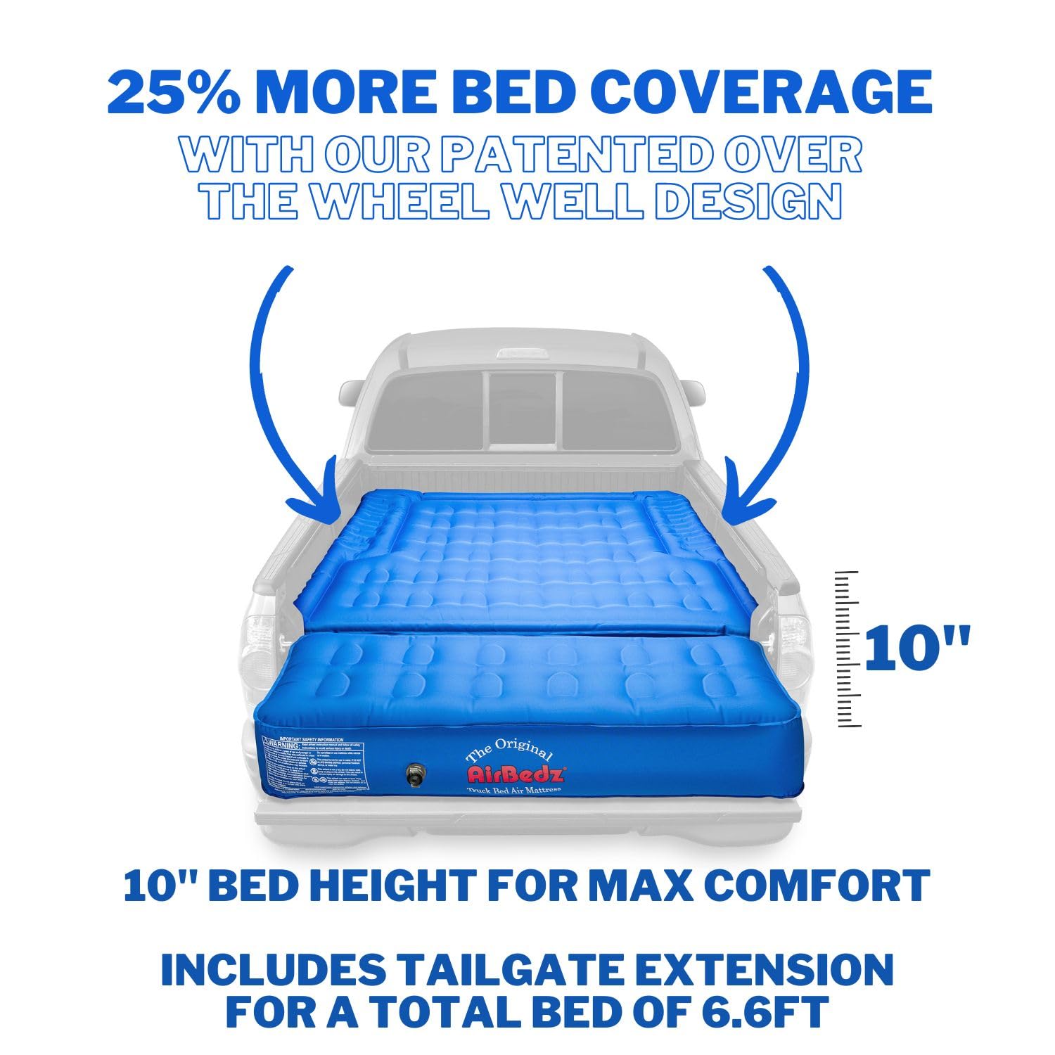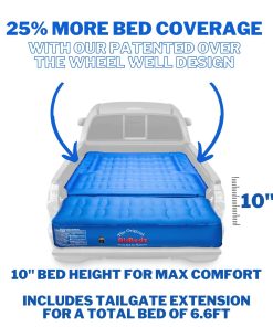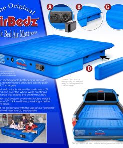 Los colchones de aire originales para camión vienen en varios tamaños diferentes para adaptarse a camiones compactos, medianos y de tamaño completo en diseños de cama larga y corta. Las recortes en cada lado permiten que el colchón se ajuste alrededor y sobre los pasos de rueda en una camioneta, creando un área de descanso que utiliza toda la cama del camión. Una bomba recargable integrada infla y desinfla el colchón con solo presionar un botón. Un sistema de bobinas de aire integrado distribuye el peso uniformemente sobre el colchón. Viene con un colchón adicional para portón trasero de 20″ X 52″ X 10″ que cubre tu portón trasero para una longitud de sueño adicional. Experimenta la máxima comodidad y conveniencia con el colchón de aire para cama de camión AirBedz de Pittman Outdoors. Diseñado específicamente para camionetas de tamaño mediano con cama corta de 5 pies a 5.5 pies de largo, este colchón de aire es tu boleto para una relajación sin igual durante tus aventuras al aire libre. El colchón de aire para cama de camión AirBedz cuenta con una construcción suave y duradera, garantizando una noche de sueño reparador sin importar a dónde te lleve tu camión. No más problemas con bombas de aire externas o la búsqueda de fuentes de energía. Este colchón de campamento para cama de camión viene con una bomba de aire integrada, que permite la inflación y desinflación sin esfuerzo con solo tocar un botón. Equipado para la comodidad en el tamaño más generoso al inflarse. Si eres un motociclista de motocross, cazador, pescador o todoterreno, es probable que hayas pasado una noche incómoda durmiendo en un colchón convencional en la parte trasera de tu camión. Sabiendo que tenía que haber una mejor manera, nos propusimos diseñar y fabricar un colchón que ofreciera una mejor noche de sueño. El colchón de aire para cama de camión AirBedz está diseñado con precisión y construido para durar. Su construcción resistente está diseñada para resistir las exigencias del gran aire libre, garantizando años de rendimiento confiable. Invierte en un colchón que ofrece un confort excepcional y durabilidad, haciendo que cada viaje de campamento sea una experiencia inolvidable. Abraza la libertad de la carretera abierta, explora la belleza de la naturaleza y descansa en un confort inigualable con el colchón de aire para cama de camión AirBedz de Pittman Outdoors. Eleva tus aventuras de campamento, crea recuerdos duraderos y disfruta del lujo de una cama similar a la de casa sobre la marcha. Prepárate para la mezcla definitiva de confort, comodidad y durabilidad: el camper de cama de camión AirBedz es tu boleto a una experiencia al aire libre realmente extraordinaria.