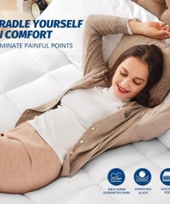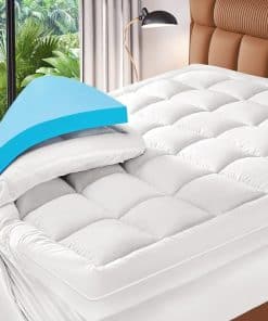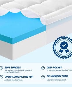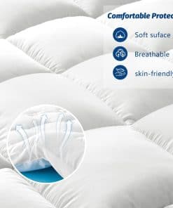 Colchón topper ultra grueso: La cubierta superior tipo almohada está hecha de fibras 3D y 7D, permitiendo la circulación de aire y proporcionando excelente comodidad y frescura sin generar calor adicional y sudor como los colchones tradicionales. El diseño simple y discreto de la superficie es adecuado para habitaciones con diferentes tipos de decoración. La falda de bolsillo profundo puede estirarse fácilmente y es adecuada para la mayoría de los colchones. También puede fijar bien el colchón, prevenir que se resbale demasiado y afecte el sueño, y también puede considerarse como un protector de colchón para protegerlo y alargar su vida útil. En resumen, puede ayudarte a recuperar vitalidad en un buen sueño.
