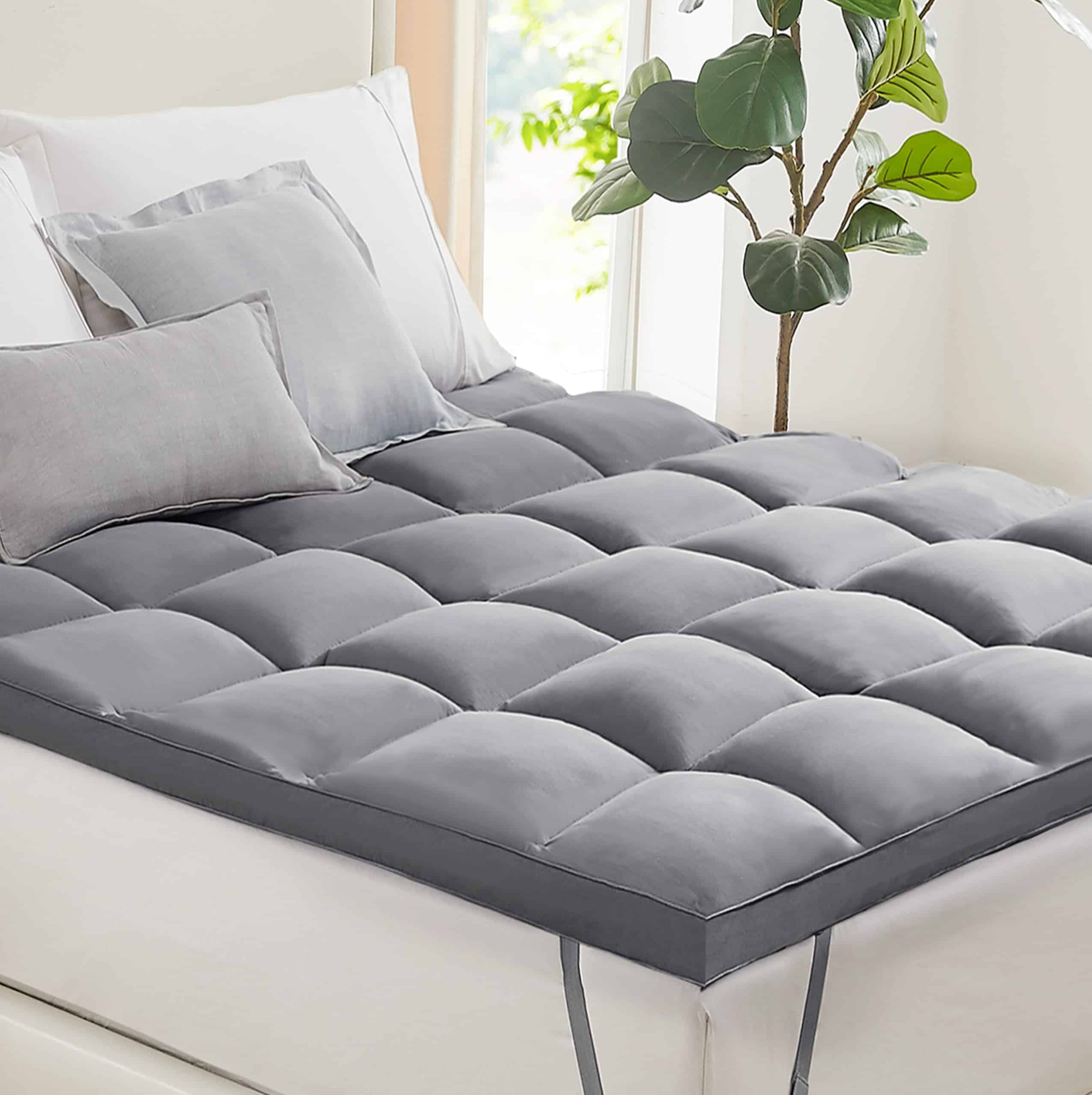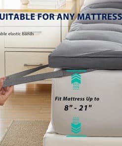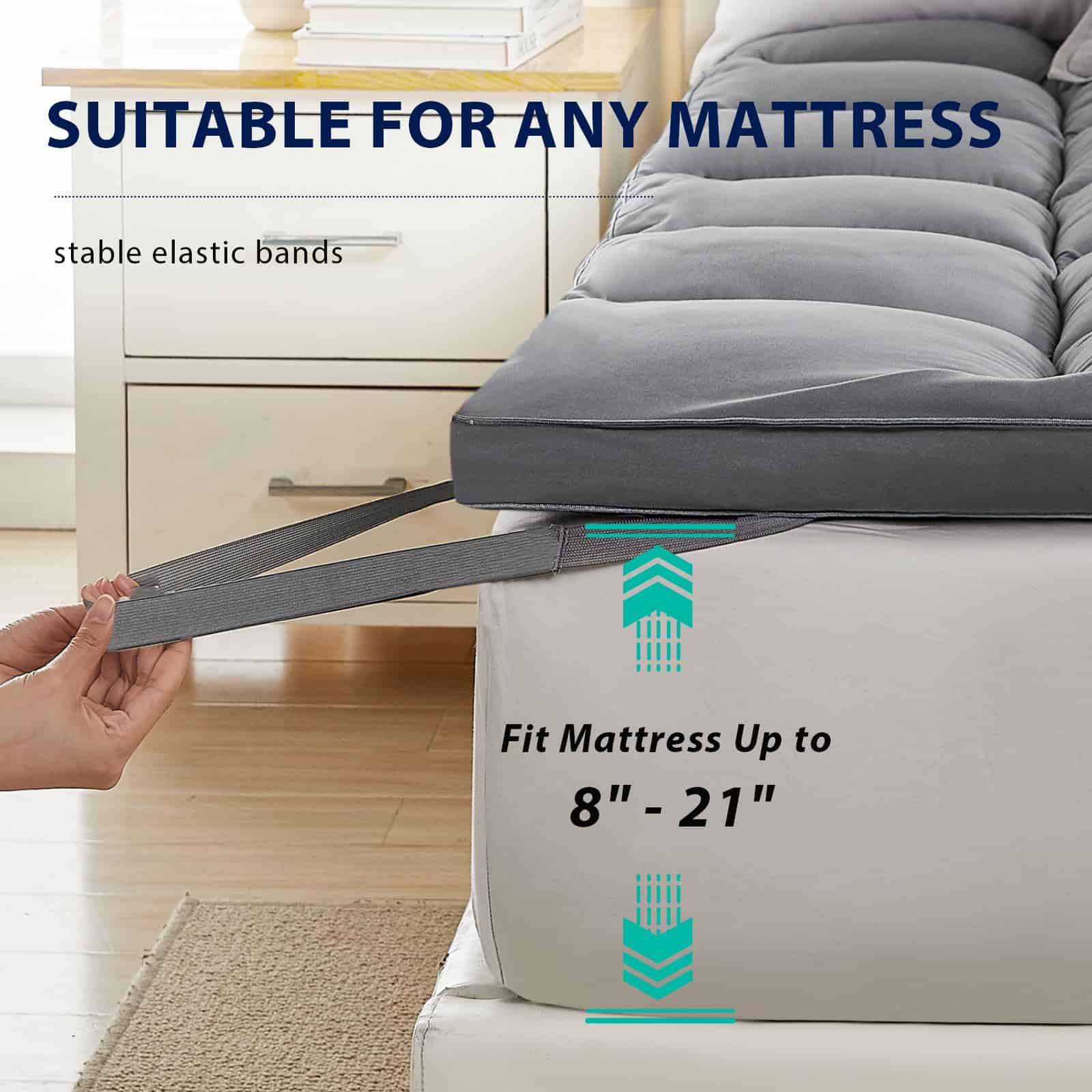 3. AJUSTE PERFECTO Y ESTABLE DURANTE TODA LA NOCHE Este topper de colchón adopta una banda elástica estable que se estira de 8″ a 21″, garantizando un ajuste seguro para todos los tamaños de colchones y permitiéndote voltear y mover libremente por la noche. El diseño simplista combinará muy bien con tu habitación. La construcción acolchada en cuadros evita que los rellenos distribuidos uniformemente se desplacen mientras duermes, ofreciéndote la comodidad más suave de manera constante.