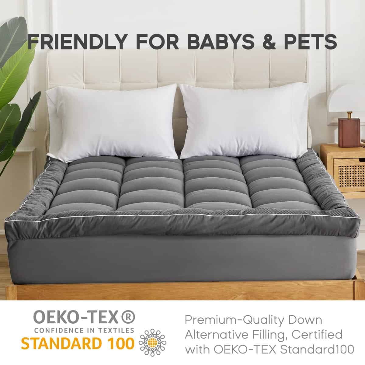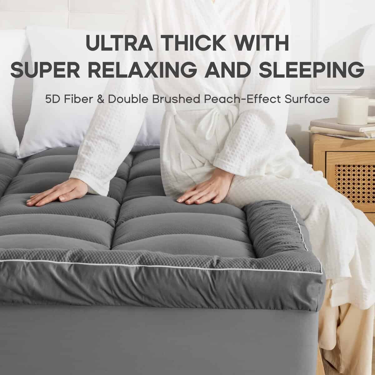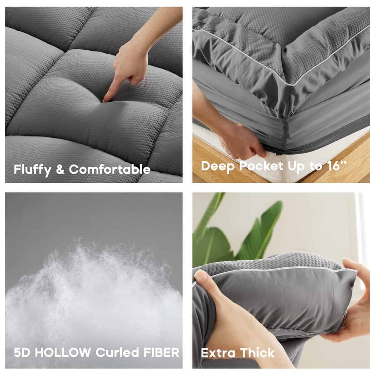 1. COLCHONETA DE LUJO ULTRA GRUESA – ¡Nuestra colchoneta de colchón ultra gruesa es la solución perfecta para rejuvenecer su viejo colchón y ofrecerle una experiencia de sueño de lujo! Esta colchoneta está rellena con fibra alternativa 5D, esponjosa y de apoyo, que proporciona un soporte que alivia el estrés para sus caderas, hombros, espalda y rodillas. Ideal para todos los tipos de dormilones, ya sea que duerma de lado, de espalda o boca abajo.