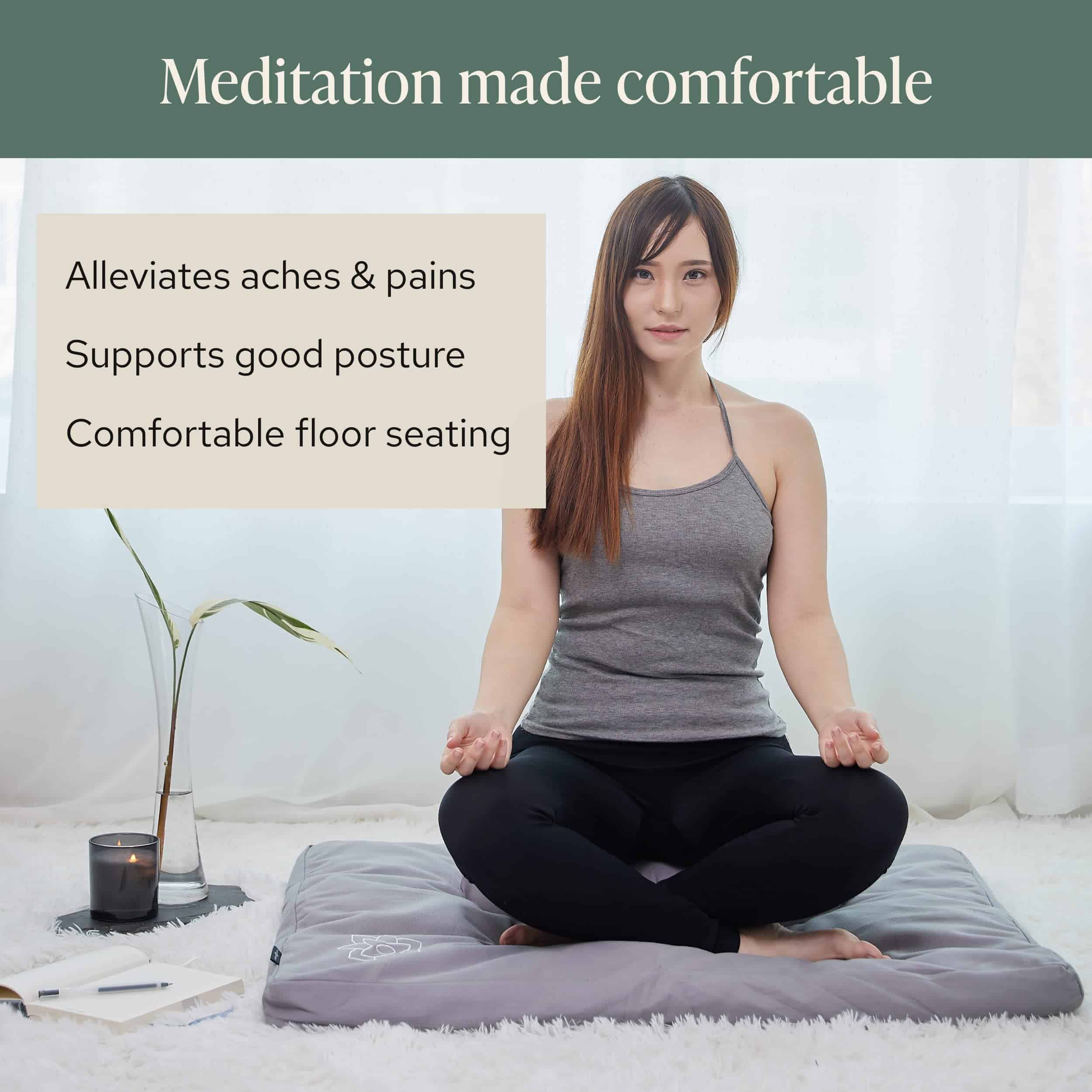 4. GRAN COLCHONETA DE MEDITACIÓN PARA MAYOR COMODIDAD – Esta colchoneta rectangular de 36″ x 28″ te ayuda a mejorar drásticamente tu nivel de comodidad mientras meditas. ¡Puedes sentarte cruzando las piernas en el suelo y concentrarte en tu mente y cuerpo durante meditaciones más largas sin dolor!