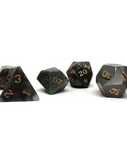 Los dados de piedra se cortan de piezas sólidas de piedras naturales y sintéticas, luego se graban con la numeración en cada cara de los dados. Los dados de piedra ofrecen una sensación de alta calidad en la mano y ningún conjunto es exactamente igual. Recomendamos usar un estuche de dados con un inserto de espuma y también recomendamos encarecidamente comprar una bandeja de dados para proteger tanto los dados como la superficie de lanzamiento.