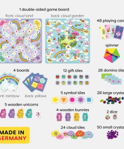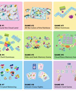 Presenta a tus pequeños un mundo de magia, brillo e imaginación con la Colección de Juegos de Unicornio Glitterluck de HABA. Esta colección es más que un conjunto de juegos; es una puerta a la creatividad, la narración de historias y el juego cooperativo. Cada juego está diseñado para mejorar las habilidades cognitivas, fomentar las interacciones sociales y brindar diversión sin fin. Cada juego de la colección de Unicornio Glitterluck ofrece un conjunto único de desafíos y experiencias. Desde juegos de dados estratégicos hasta desafíos de memoria y destreza, este set cubre una amplia gama de juegos divertidos para niños. Juego 1: Todo sobre la Tierra de las Nubes Una emocionante carrera de dados para 2 a 4 niños de 3 años en adelante. Juego 2: Todos los Colores del Arcoíris Un divertido juego de recolección para 2 a 4 niños de 4 años en adelante. Juego 3: Dominó Glitter Un mágico juego de arreglos para 2 a 4 niños de 3 años en adelante. Juego 4: Dominó Nube Swirl Otro encantador juego de arreglos para 2 a 4 niños de 4 años en adelante. Juego 5: Juego de Memoria Escondida y Buscada Un juego de memoria de respuesta rápida para 2 a 4 niños de 5 años en adelante. Juego 6: Juego de Memoria Rápida de Carrera de Nubes Una dulce carrera de memoria para 2 a 4 niños de 3 años en adelante. Juego 7: Equilibrio de Cristales de Nube Un juego de destreza inestable para 2 a 4 niños de 5 años en adelante. Juego 8: Crazy Eights de Unicornio Un colorido juego de cartas para 2 a 4 niños de 4 años en adelante. Juego 9: Juego de Cartas de Unicornio Un divertido juego de cartas para 2 a 4 niños de 5 años en adelante. Si estás buscando juegos para niños de 4 a 8 años que combinen la magia de los unicornios con el juego de desarrollo, la colección de Unicornio Glitterluck es la elección perfecta. Este set no solo entretiene, sino que también ayuda a los niños a desarrollar habilidades de pensamiento crítico, habilidades sociales y paciencia mientras juegan con familiares y amigos. Unicornio Glitterluck es un regalo de cumpleaños fantástico para niñas de 6 años que traerá alegría a cualquier niño que ame los unicornios y las aventuras mágicas.