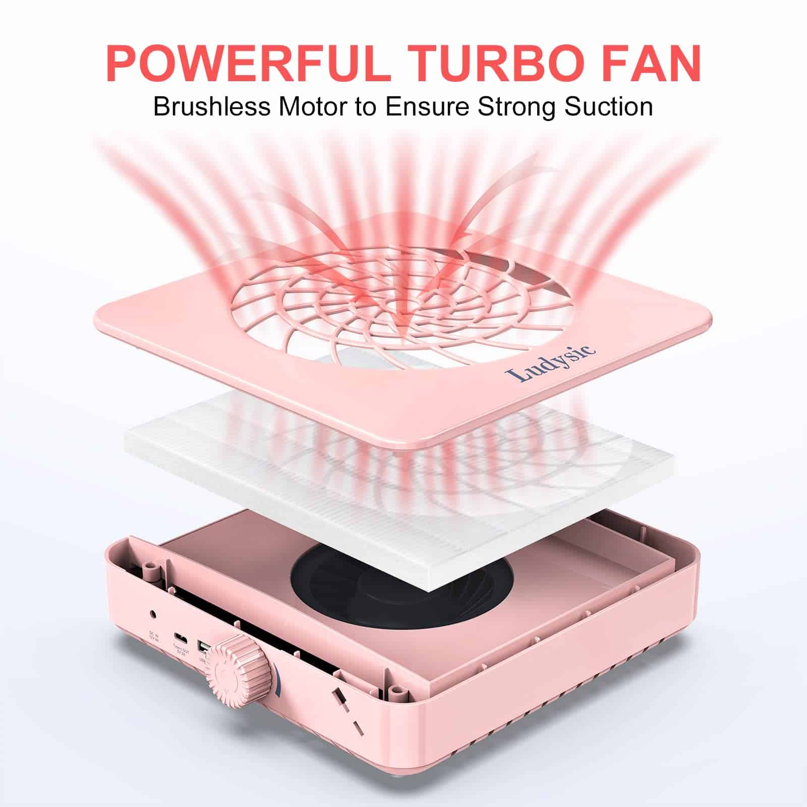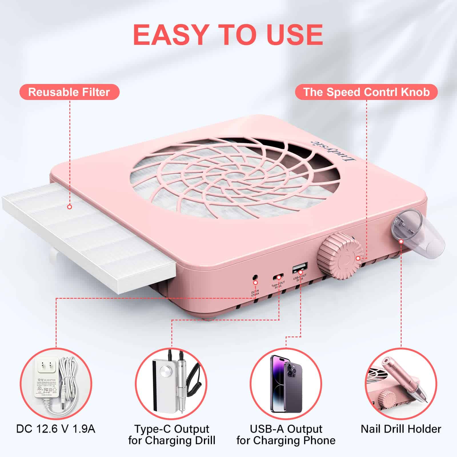 1. Colector de Polvo Profesional: El colector de polvo para uñas de Ludysic efectivamente adsorbe y recoge el polvo de las uñas y las cenizas voladoras desde 360 grados de forma eficiente. Tú y tus clientes pueden disfrutar de un ambiente libre de polvo mientras liman o pulen las uñas.