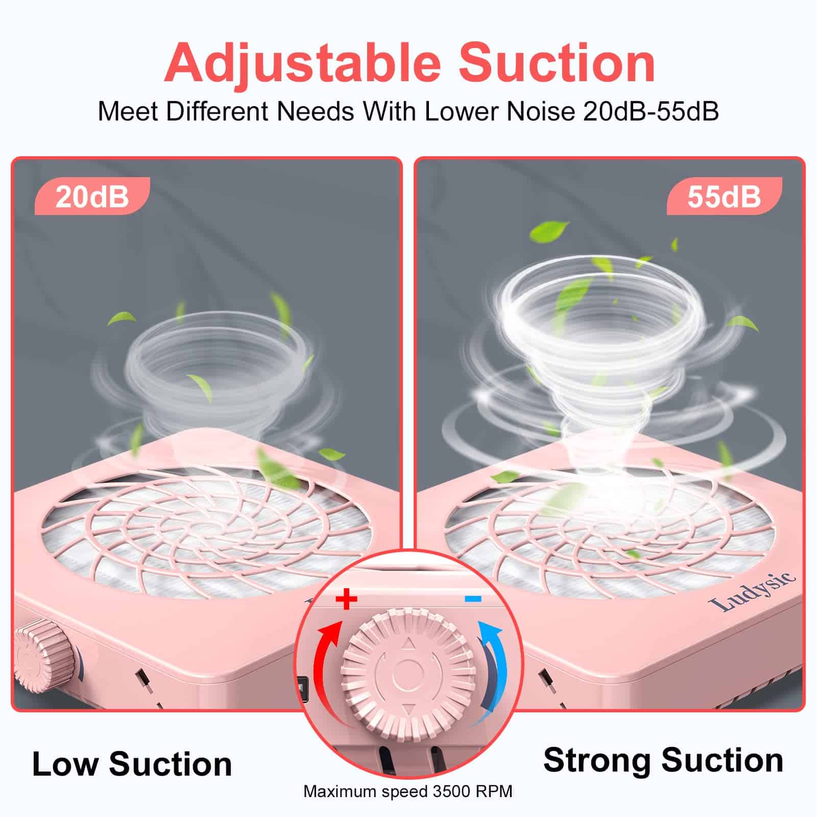 2. Bajo Ruido y Succión Ajustable: Esta máquina colectora de polvo para uñas tiene un motor de alta calidad que funciona en bajo ruido y de forma suave. Tiene un botón ajustable, por lo que puedes elegir la intensidad del viento ajustando el botón y así absorber fácilmente todo tipo de polvo y confeti para mantener limpia la superficie de trabajo en todo momento.