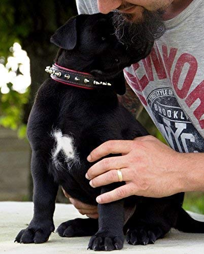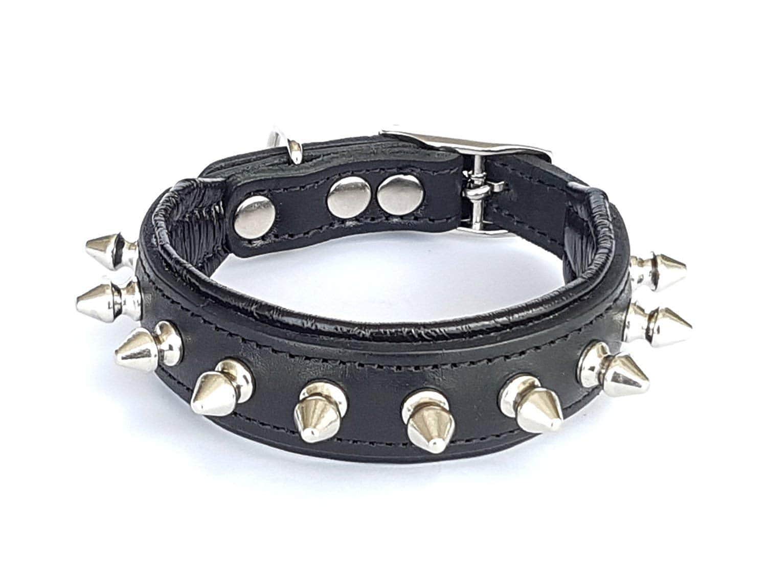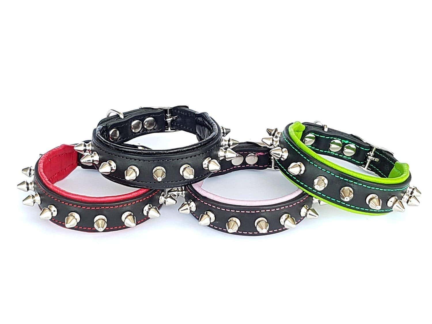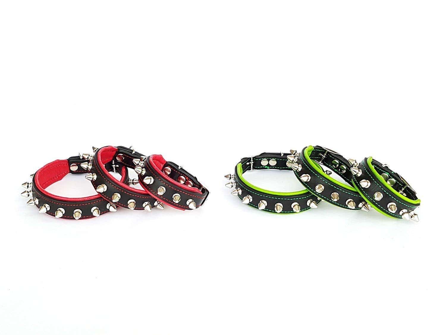 Bestia CUSTOM DOG GEAR presenta: Nuestro collar ‘Spiky’ es un IMPRESCINDIBLE para tu cachorro o pequeño querido. ¡Este collar se adapta tan bien que tu perro querrá llevarlo todos los días! Se ve impresionante y está bien construido, pero muy ligero y suave al mismo tiempo. Tiene una base de cuero y nuestro suave cojín patentado de piel de cordero en el interior. Decorado con 7 (hasta 13) espinas cortas y DULL niqueladas y es absolutamente seguro para tu perro. La hebilla y la anilla son de 15 mm (0,6 pulgadas) de ancho. El ancho total de este collar es de 2,5 cm (1 pulgada). 100% de cuero genuino suave acolchado hecho a mano de alta calidad en Europa con un diseño único.