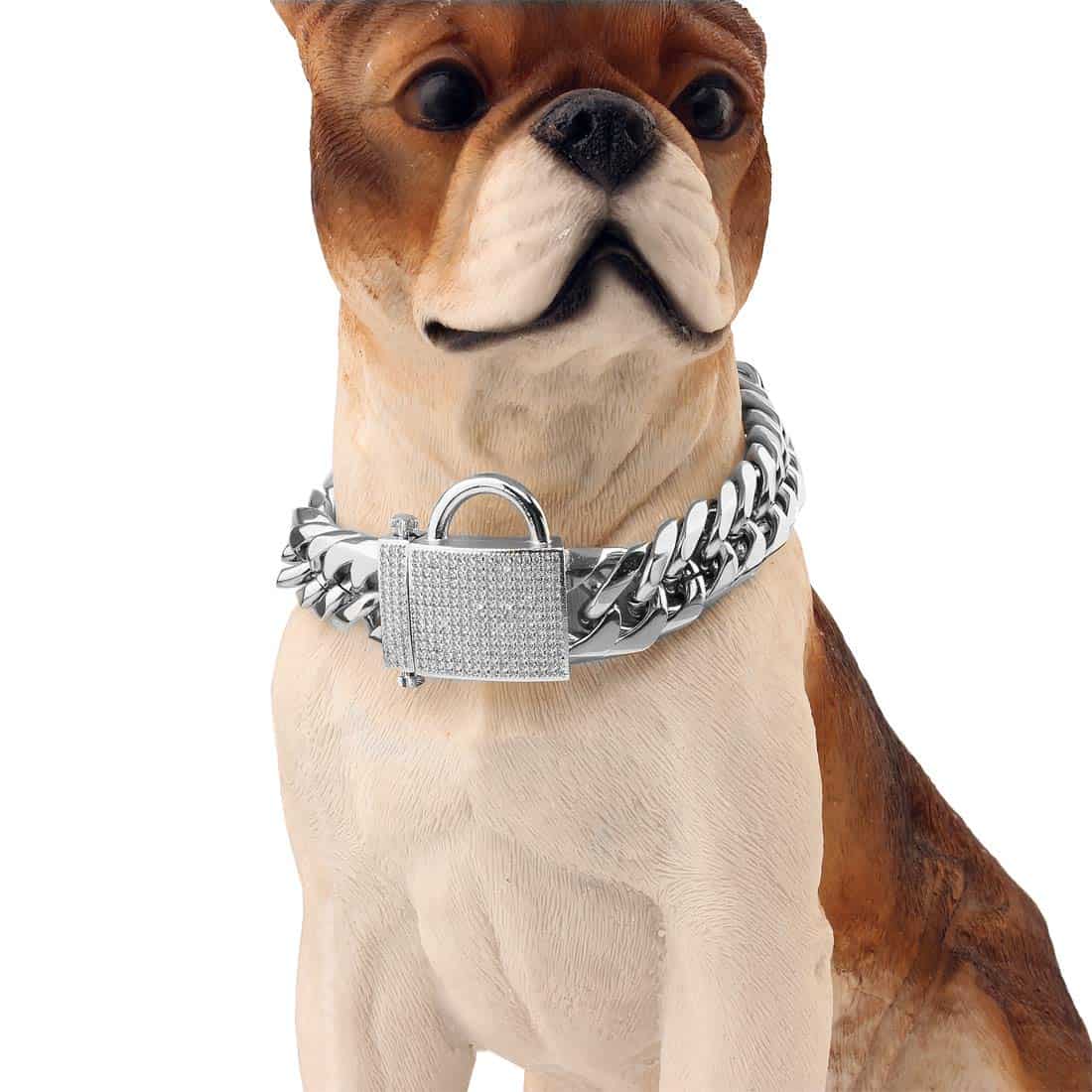 1. Material de Este Collar para Perros: Este collar para perros está hecho de acero inoxidable 316, es un collar para perros muy fuerte y resistente, altamente pulido y chapado en oro, Diseño de cadena de doble capa de 16 mm de ancho hace que el collar sea más robusto. El collar es antideslizante y resistente al agua, no se desvanece, no irritará la piel del perro.