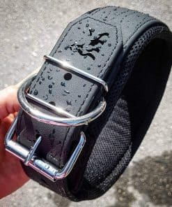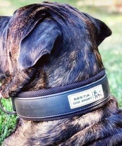 Bestia Custom Dog Gear presenta con orgullo: El collar ULTRA RESISTENTE Bestia Dog Sport de 2.5 pulgadas de ancho. Este collar cuenta con una capa base de 5 mm de cinta técnica y herrajes de ACERO INOXIDABLE de alta resistencia. El lado interior presenta un suave acolchado de malla perforada para hacerlo súper cómodo de llevar. La hebilla y el anillo en D son de alta resistencia, con un ancho de 5 cm. Este es el collar perfecto para entrenar a tu perro sin preocuparte de que se estropee, ya que es lavable a máquina, resistente al agua y a las manchas. Se ajusta perfectamente a perros de razas grandes y gigantes, como: Cane Corso, Rottweiler, Doberman, Presa Canario, Mastín Español, Mastín Inglés, Bullmastiff, Mastín Francés, Bulldog Americano, Boerboel, Dogo Argentino, Amstaff, etc. La correa a juego también está disponible en nuestra tienda y tiene las siguientes dimensiones: 5 pies (1.5 m) de largo y 1 pulgada (2.5 cm) de ancho. Tiene un asa acolchada y un mosquetón de aviación táctico de aluminio y está hecha de los mismos materiales que el collar. ¡Diseño único de calidad artesanal ULTRA resistente e impermeable hecha en Europa!