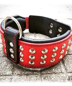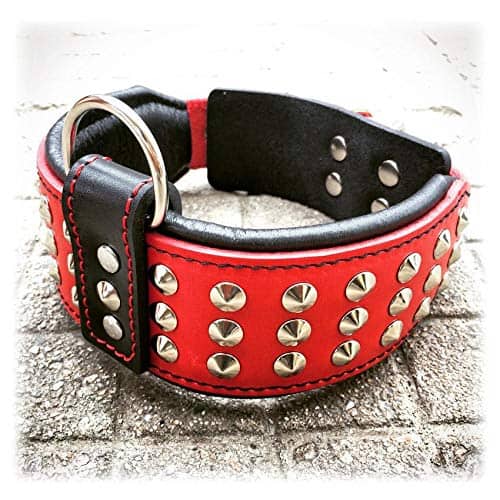 BESTIA CUSTOM DOG GEAR te presenta con orgullo: El collar «Star». Tiene una decoración de 3 filas de tachuelas de níquel de 0.4 pulgadas de ancho. La capa base de este collar es cuero de cinturón de la más alta calidad de 1/8 de pulgada de grosor. Muy fuerte y duradero. La capa interna es nuestro cojín suave único. También es cuero de cerdo o cordero 100% real. Este collar tiene un ancho total de 2.5 pulgadas. La hebilla y el anillo en D miden 1.4 pulgadas para tallas M – XL, y 2 pulgadas para la talla XXL. Todas las partes metálicas están niqueladas. Nuestras hebillas y anillos en D son de alambre de acero, hechos especialmente para este propósito. Cuero genuino 100% de calidad acolchado suave hecho a mano en Europa diseño único