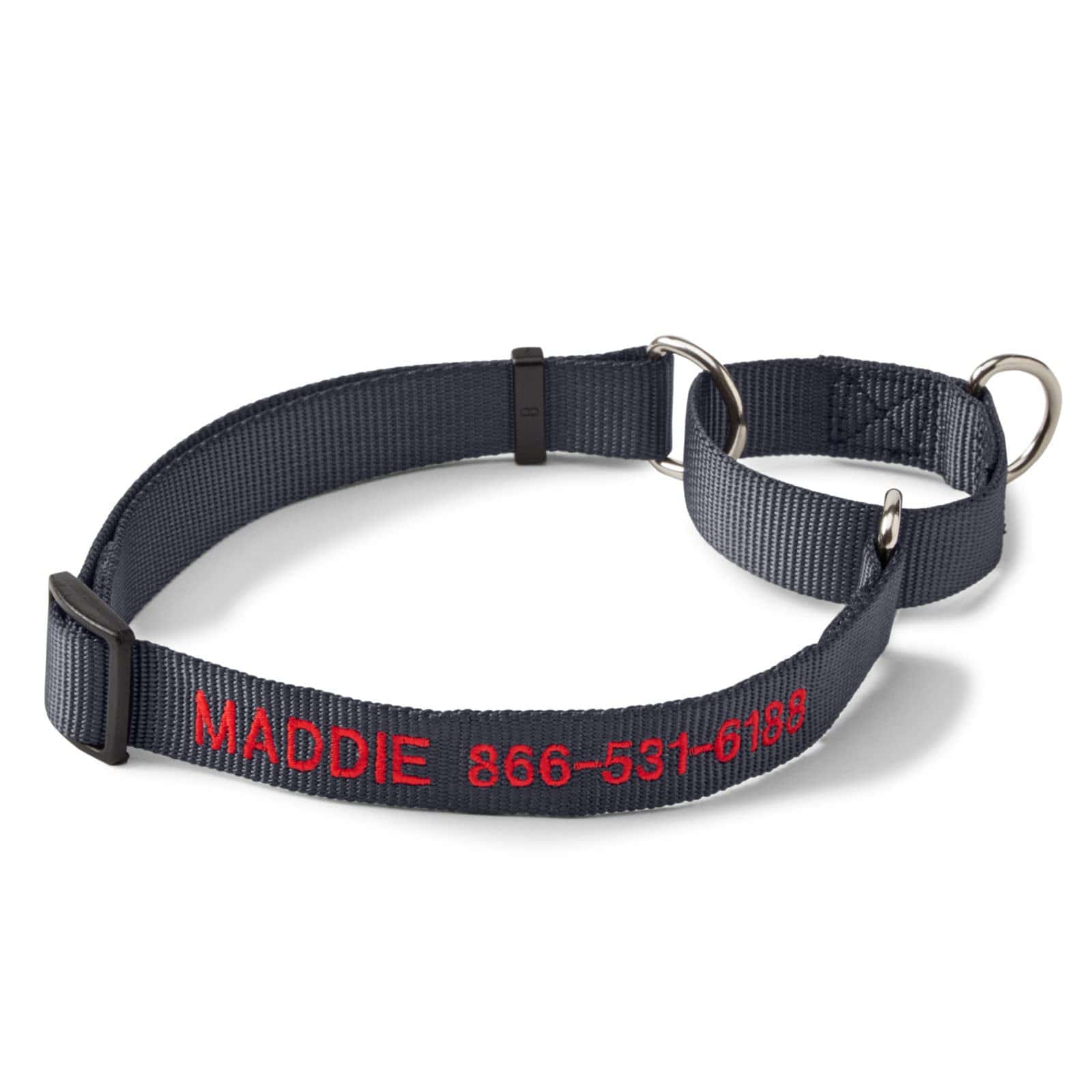 Nuestro Collar Martingale Personalizado sin tirones está diseñado para apretar lo suficiente para llamar la atención de tu perro, sin causar asfixia. Un collar martingale proporciona más control sobre tu perro, gracias a un diseño de dos bucles uno que rodea el cuello de tu perro y un bucle más pequeño para la sujeción de la correa. Cuando tu perro intenta tirar, el bucle pequeño se tensa y aprieta el bucle más grande, controlando a tu perro y evitando que escape. Originalmente diseñado para galgos cuyas cabezas estrechas causaban que fácilmente se salieran de collares estándar con hebilla. Este collar seguro y efectivo es el favorito de adiestradores y entrenadores de perros profesionales. La cinta de nylon de alta calidad y un resistente anillo en D de acero garantizan durabilidad, mientras que el nombre de tu perro y tu número de teléfono bordados en el collar aseguran que tu perro siempre encuentre el camino de regreso a casa. Para el tamaño correcto, mide en la parte superior del cuello, directamente detrás de las orejas. Personalizado pequeño con hasta 15 letras y/o números, incluyendo espacios; mediano y grande con hasta 24 letras y/o números, incluyendo espacios. La personalización está disponible solo en los collares. Elige un color de hilo contrastante: dorado, rosa, rojo, morado, verde, azul, naranja, blanco, negro. Toda la personalización en letras mayúsculas. Lavable. Hecho en EE. UU.