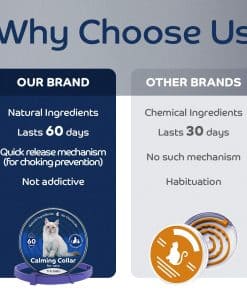 Collar natural calmante y relajante para gatos, reduce la ansiedad, tamaño ajustable, se adapta a todos los gatos. Cada collar dura hasta 60 días, liberando feromonas que ayudan a reducir el maullido excesivo, marcaje y rascado. Comienza a funcionar en 1 hora. Seguro y natural, con ingredientes naturales como manzanilla y lavanda. Hipoalergénico, sin adicción. Diseño de liberación rápida para evitar peligros de asfixia. Tamaño ajustable que sirve para todos los tamaños de gatos, incluidos los gatitos a partir de las 10 semanas de edad. Resistente al agua y a la intemperie, no es necesario quitar en caso de mojarse.