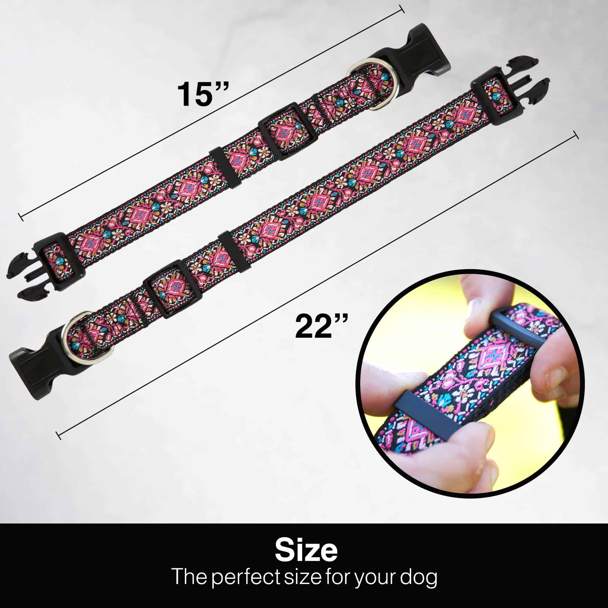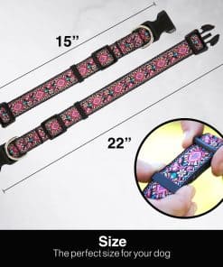 ¡EL ARTE MÁS LINDO en el collar de tu perro! Han quedado atrás los días del aburrido collar de perro. PREPARARSE PARA PASEOS, CAMINATAS Y EJERCICIOS NUNCA HA SIDO TAN DIVERTIDO. Cuando es hora de llevar a tu mejor amigo a pasear diariamente, ponerse el collar de diseñador de Art Tribute es pan comido. Un rápido clic y estás listo para salir. MATERIALES DE MEJOR CALIDAD Utilizamos solo el mejor y más resistente nylon para el collar de perro impreso con patrón, plástico extra duradero para la hebilla de liberación lateral y un anillo en D chapado en carbono al que se engancha la correa. Estos materiales, junto con el más alto estándar de procesos de fabricación y costura, garantizan un collar que resistirá las travesuras incluso de los perros más duros. NO TE ESTRESES POR LA SUCIEDAD Incluso si a tu perro le encanta ensuciarse en el barro, escarbar agujeros o darse un chapuzón rápido, no temas. Este bonito collar de perro es lavable a máquina y se verá como nuevo, listo para la siguiente aventura. DISPONIBLE EN 4 TAMAÑOS Pequeño – 10-15 largo x ancho Razas: Cavalier King Charles, Pekingés, Schnauzer miniatura, Carlino, Terrier escocés Mediano – 12-18 largo x ancho Razas: Beagle, Border Collie, Bulldog francés, Bulldog inglés, Boston Terrier Grande – 15-22 largo x 1 ancho Razas: Boxer, Dálmata, Golden Retriever, Labrador Retriever, Weimaraner Extra grande – 19-26 largo x 1 ancho Razas: Bernese Mountain Dog, Gran Danés, Mastiff, Rottweiler, San Bernardo. ELIGE TU DISEÑO VIBRANTE FAVORITO Elige entre nuestra gama de geométricos y flores y deja que la personalidad de tu perro brille mientras pasea con estilo en su paseo diario o tiempo de juego en el parque para perros. Permite que tu peludo brille y destaque. Incluso el perro de aspecto más rudo se ve entrañable con uno de estos coloridos collares. ¡COMPRA EL TUYO HOY y disfruta de una GARANTÍA DE POR VIDA y de paseos sin preocupaciones con tu mascota.