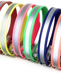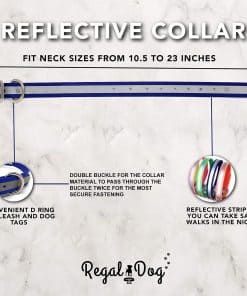 El Collar Reflectante para Perros de Regal Dog Products es la elección perfecta para mantener a tu perro seguro y con estilo. Con una franja altamente reflectante, este collar garantiza que tú y tu mascota seáis visibles durante los paseos nocturnos, protegiéndoos de posibles accidentes. El material recubierto de PVC asegura que este collar sea resistente al agua y fácil de limpiar, lo que lo convierte en una excelente opción para perros activos que disfrutan de zambullirse en el agua. La durabilidad es clave, y este collar está diseñado para resistir las maniobras más enérgicas de tu perro, con enganches y una hebilla de metal sólido que no se romperán fácilmente. Además, el material no absorbente evita que el collar se ensucie y huela mal. El material sintético de alta calidad tiene un aspecto elegante similar al cuero, pero sin la necesidad de utilizar productos animales. ¡Dale a tu perro un toque de estilo con el Collar Reflectante para Perros de Regal Dog Products y disfruta de paseos seguros y cómodos juntos!