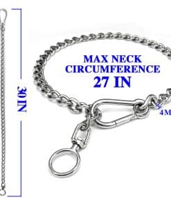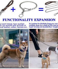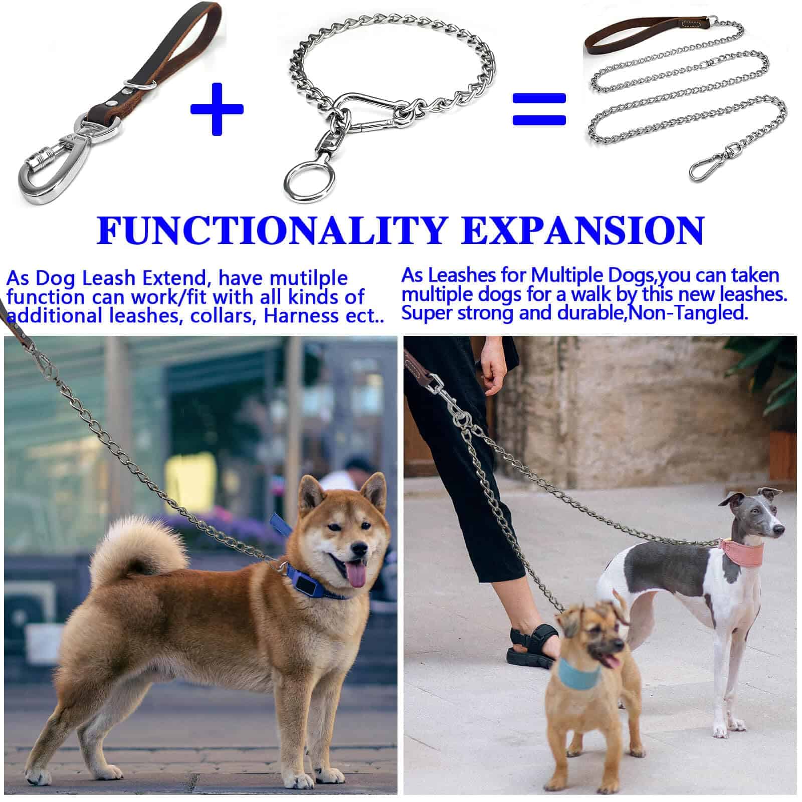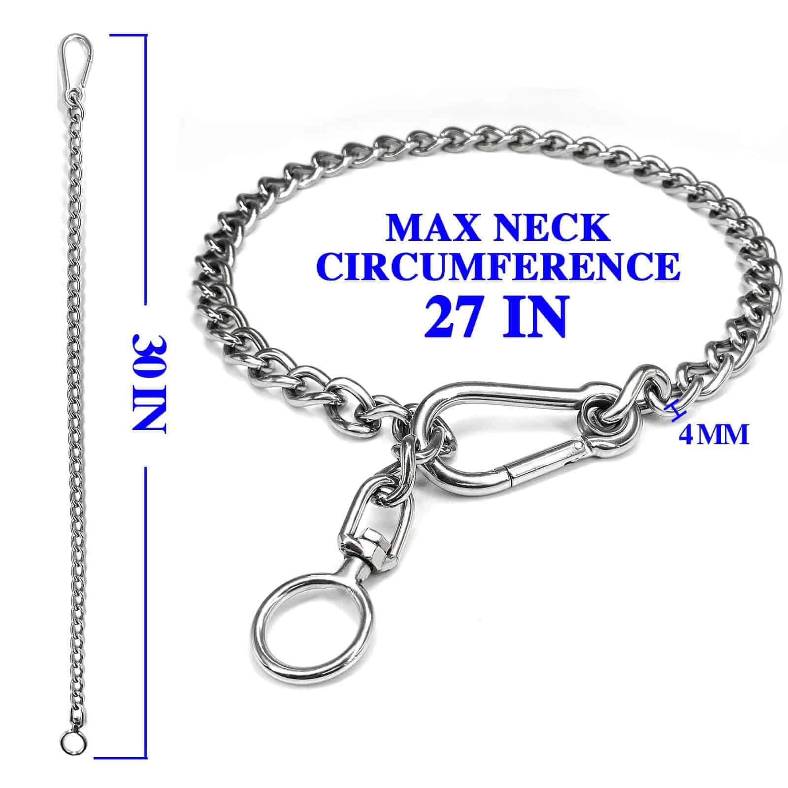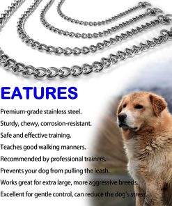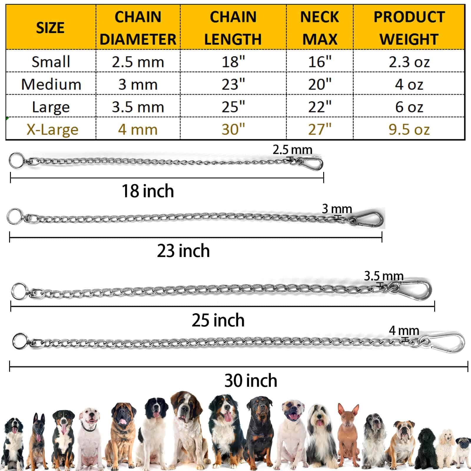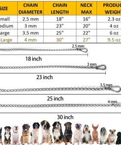 Marca: HONGSAGE Tipo: Collar de Cadena para Perros, Extensión de Correa de Perro y Correa de Perro para Múltiples Perros Material(Color): Acero Inoxidable Metal (Plateado) Tamaño y Peso: 2.5mm x 18 pulgadas y 2.3 oz; 3 mm x 23 pulgadas y 4 oz; 3.5 mm x 25 pulgadas y 6 oz; 4 mm x 30 pulgadas y 9.5 oz Componentes: Eslabones de Cadena + Anillo en O + Clips Giratorios 360 + Mosquetón de Resorte Características: Hecho de acero inoxidable de alta calidad, resistente al óxido. Corrige el comportamiento del perro, ayudándolos a aprender hábitos de caminar receptivos. Excelente para un control suave, conveniente para su uso diario. Funcionalidad extendida: 1. Como extensión de correa de perro, tiene múltiples funciones para trabajar/ajustarse con todo tipo de correas adicionales, collares, arneses, etc. 2. Como correas para múltiples Perros, puedes llevar a varios perros a pasear con estas nuevas correas. Súper fuertes y duraderas, sin enredos.