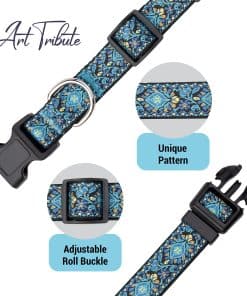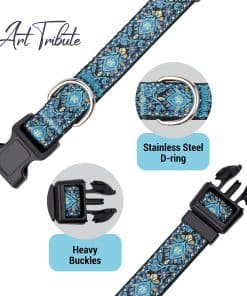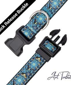 ¡EL MEJOR ARTE en el collar de tu perro! Se acabaron los días del aburrido collar de perro. PREPARARSE PARA CAMINATAS, EXCURSIONES Y EJERCICIO NUNCA HA SIDO TAN DIVERTIDO Cuando llega el momento de llevar a tu mejor amigo a dar su paseo diario, ponerse el collar de perro diseñado por Art Tribute es pan comido. Un clic rápido y estás listo para salir. MATERIALES DE LA MEJOR CALIDAD Utilizamos solo el mejor y más resistente nylon para el collar con patrón impreso, plástico extra resistente para la hebilla de liberación lateral y un D-Ring enchapado en carbono al que se engancha la correa. Estos materiales, junto con los más altos estándares de procesos de fabricación y costura, garantizan un collar que resistirá las travesuras incluso de los perros más duros. NO TE PREOCUPES POR LA SUCIEDAD Incluso si a tu perro le encanta revolcarse en el barro, cavar agujeros o darse un chapuzón rápido, no temas. Este bonito collar para perros es lavable a máquina y lucirá como nuevo, listo para la próxima aventura. DISPONIBLE EN 4 TAMAÑOS Pequeño – 10-15 largo x 1 ancho Razas: Cavalier King Charles, Pekingés, Schnauzer Miniatura, Carlino, Terrier Escocés Mediano – 12-18 largo x 1 ancho Razas: Beagle, Border Collie, Boston Terrier, Bulldog Inglés, Bulldog Francés Grande – 15-22 largo x 1 ancho Razas: Boxer, Dálmata, Golden Retriever, Labrador Retriever, Weimaraner Extra-Grande – 19-26 largo x 1 ancho Razas: Bernés de la Montaña, Gran Danés, Mastín, Rottweiler, San Bernardo. ELIGE TU DISEÑO VIBRANTE FAVORITO Elige entre nuestra gama de geométricos y florales y deja que la personalidad de tu perro brille mientras pasea orgulloso en su paseo diario o en el parque para perros. Deja que tu bebé peludo brille y destaque. Incluso el perro de aspecto más rudo luce adorable con uno de estos coloridos collares. ¡COMPRA EL TUYO HOY y disfruta de una GARANTÍA DE POR VIDA y paseos sin preocupaciones con tu mascota!