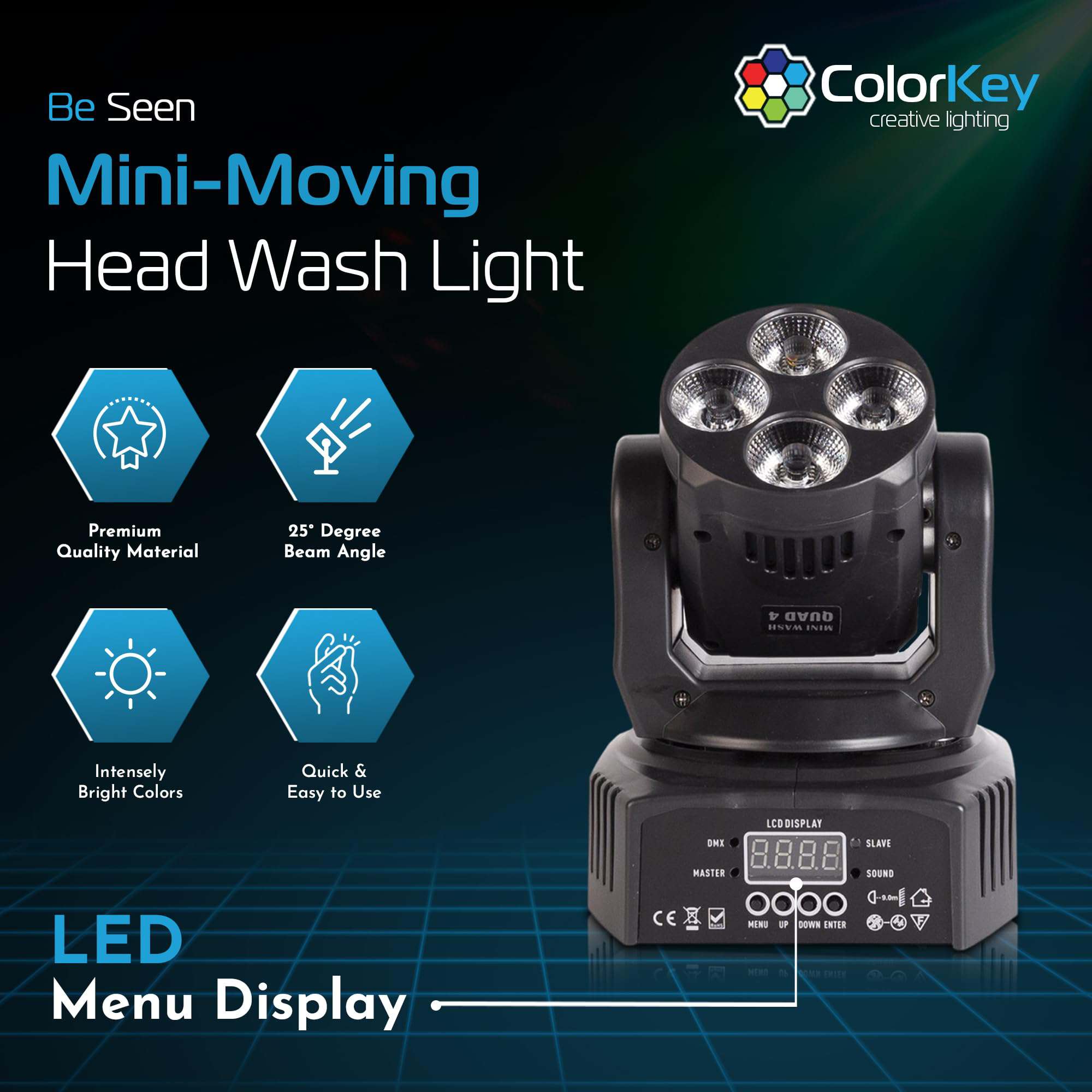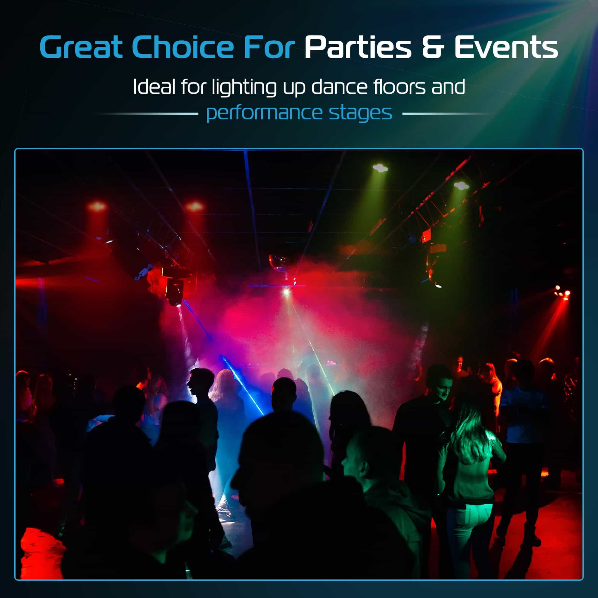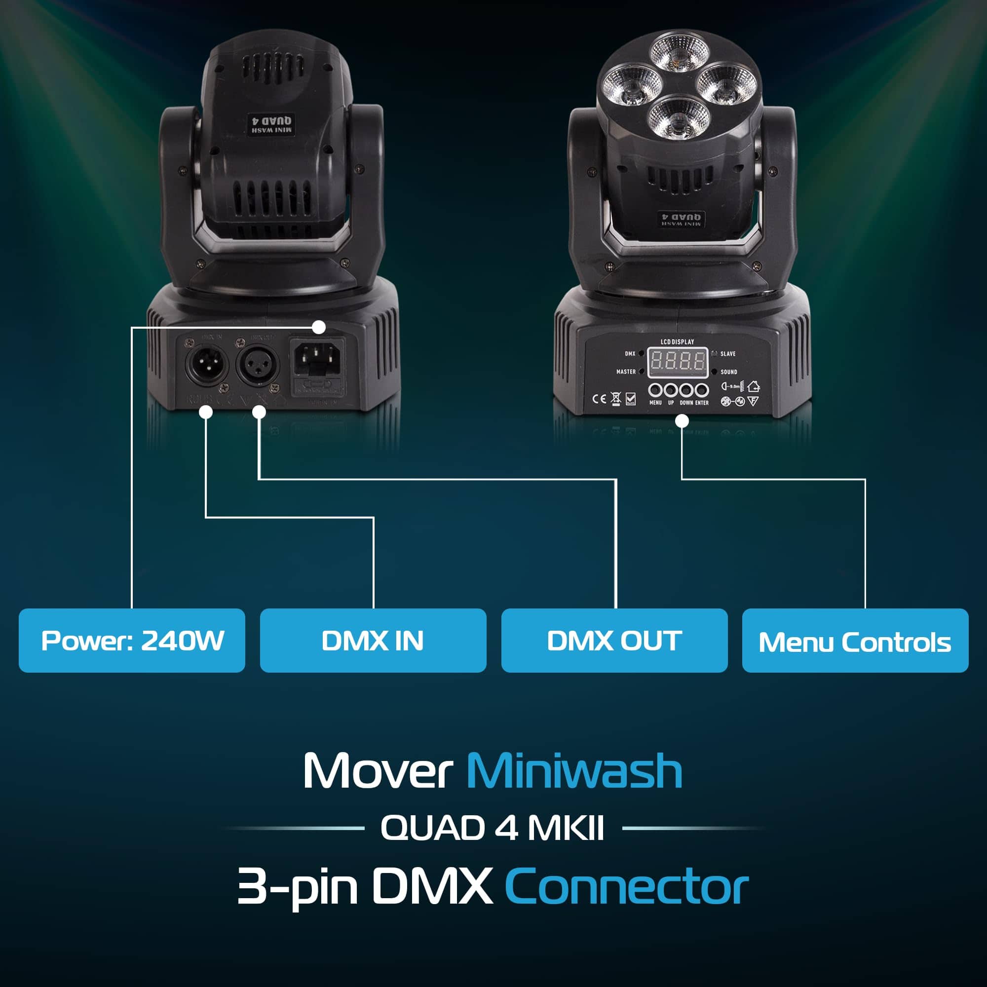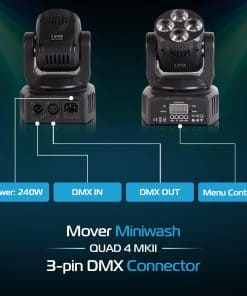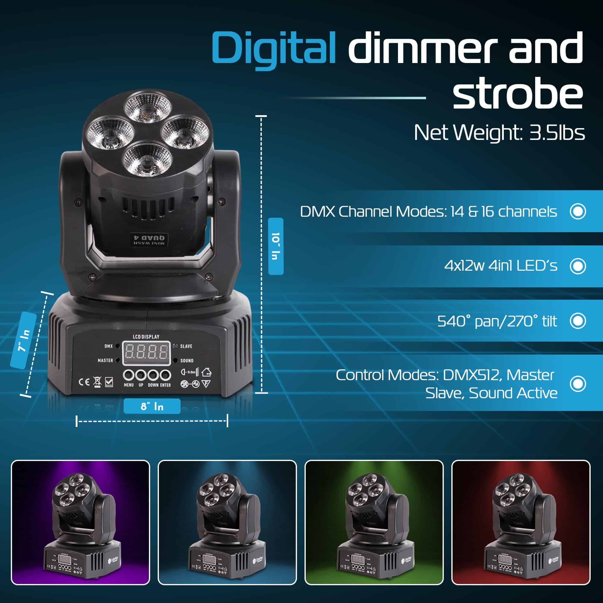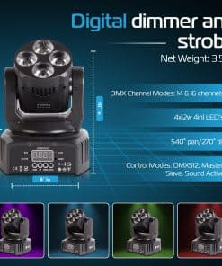 1. 4x12w 4in1 LED�s. 2. Rojo, Verde, Azul, Blanco. 3. Ángulo de haz de 25 grados. 4. Pan de 540 grados / inclinación de 270 grados. 5. 14 y 16 modos de canal DMX.