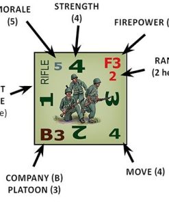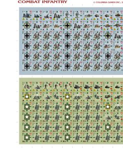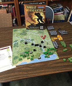 Combat Infantry es un juego de nivel de escuadrón de la Segunda Guerra Mundial de ritmo rápido, que emplea nuestros bloques de madera. El sistema de juego cuenta con reglas innovadoras e interactivas para Combate de Fuego, Combate Cercano, Moral y Líderes. El juego es sofisticado, pero muy jugable. Comandas un batallón de infantería alemán o americano, compuesto por tres compañías de infantería y una compañía de armas pesadas. Los conjuntos de expansión incluirán batallones británicos, soviéticos, italianos y japoneses. Los tipos de unidades incluyen: líderes, escuadrones de fusiles, ametralladoras, morteros, anti-tanques, tanques. Las unidades están organizadas por batallón, compañía y pelotón y deben mantener la integridad de la unidad. Ningún juego de nivel de escuadrón de la Segunda Guerra Mundial puede reclamar precisión sin representar la niebla de la guerra (mantén la cabeza gacha o muere). Los bloques de madera en este juego proporcionan la niebla de la guerra y la reducción de pasos sin complicaciones. Se incluyen dos mapas geomórficos de 16.5″ x 22″ a una escala de 100 metros por hexágono.