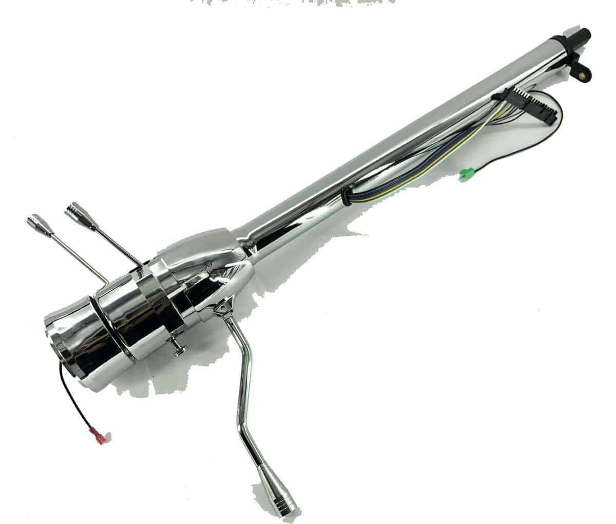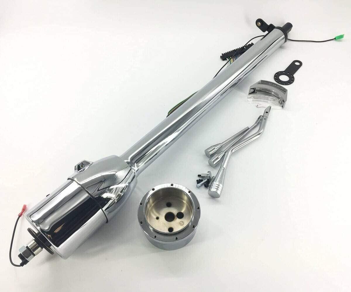 Característica: Longitud de la columna (en): 28.00 in. Colapsable: No Telescópica: No Ubicación de la llave de encendido: Tablero Indicador de marcha incluido: Sí Interruptor de peligro: Sí Interruptor de seguridad de neutral incluido: No Inclinación: Sí Interruptor de señal de giro incluido: Sí Material de la columna: Acero inoxidable Acabado de la columna: Cromado Cantidad: Se vende individualmente. Notas: La columna incluye un adaptador de volante GM de 9 orificios con una altura de 2.25 pulgadas, no incluido en la longitud de la columna. La longitud de la columna se mide desde la parte superior de la campana hasta el final del eje de salida. Incluye lentes indicadores de velocidad de 3 y 4 velocidades. Las columnas de acero de diámetro están equipadas con un interruptor de señal de giro pre-cableado y una palanca de señal billet, junto con un interruptor de peligro pre-cableado y cableado codificado por colores con un enchufe de estilo GM de 4 1/2 pulg. Están terminadas en su elección de cromo o negro e incluyen instrucciones detalladas para una instalación sin complicaciones. Contenido del paquete: 1 Juego de Columna de Dirección de 28 pulgadas