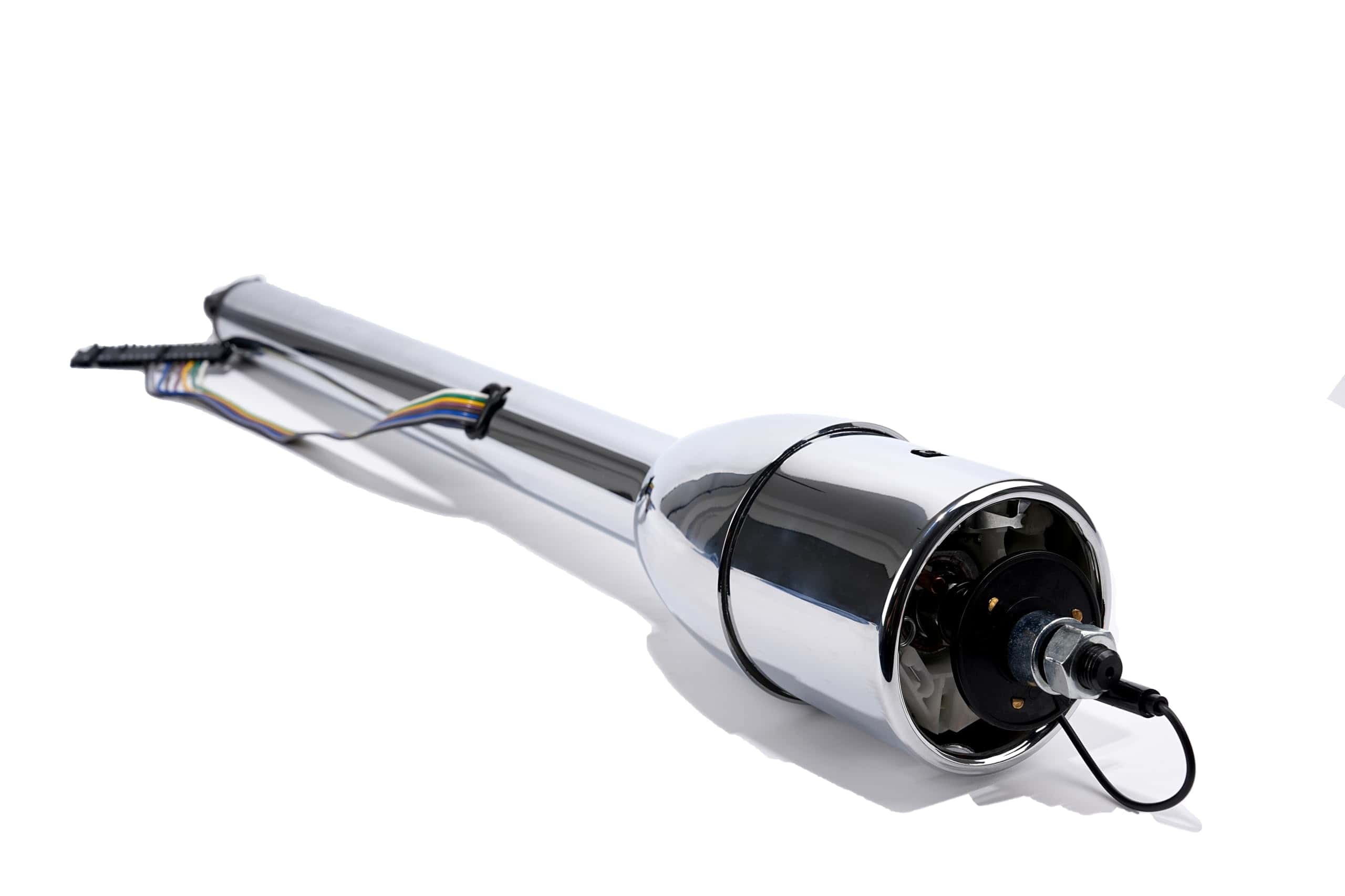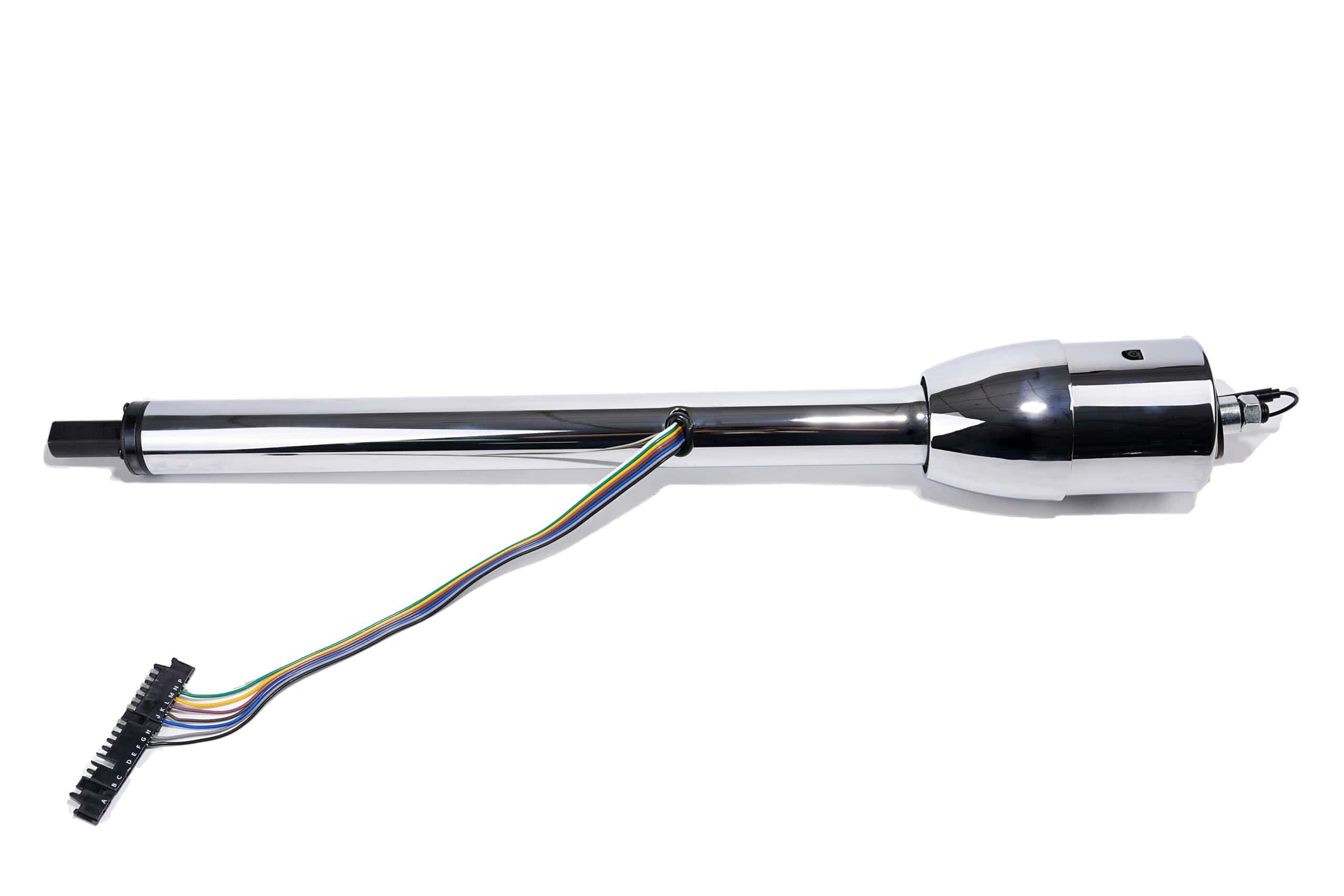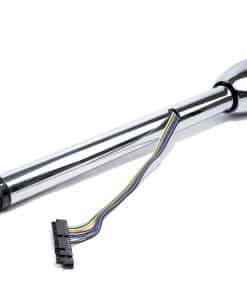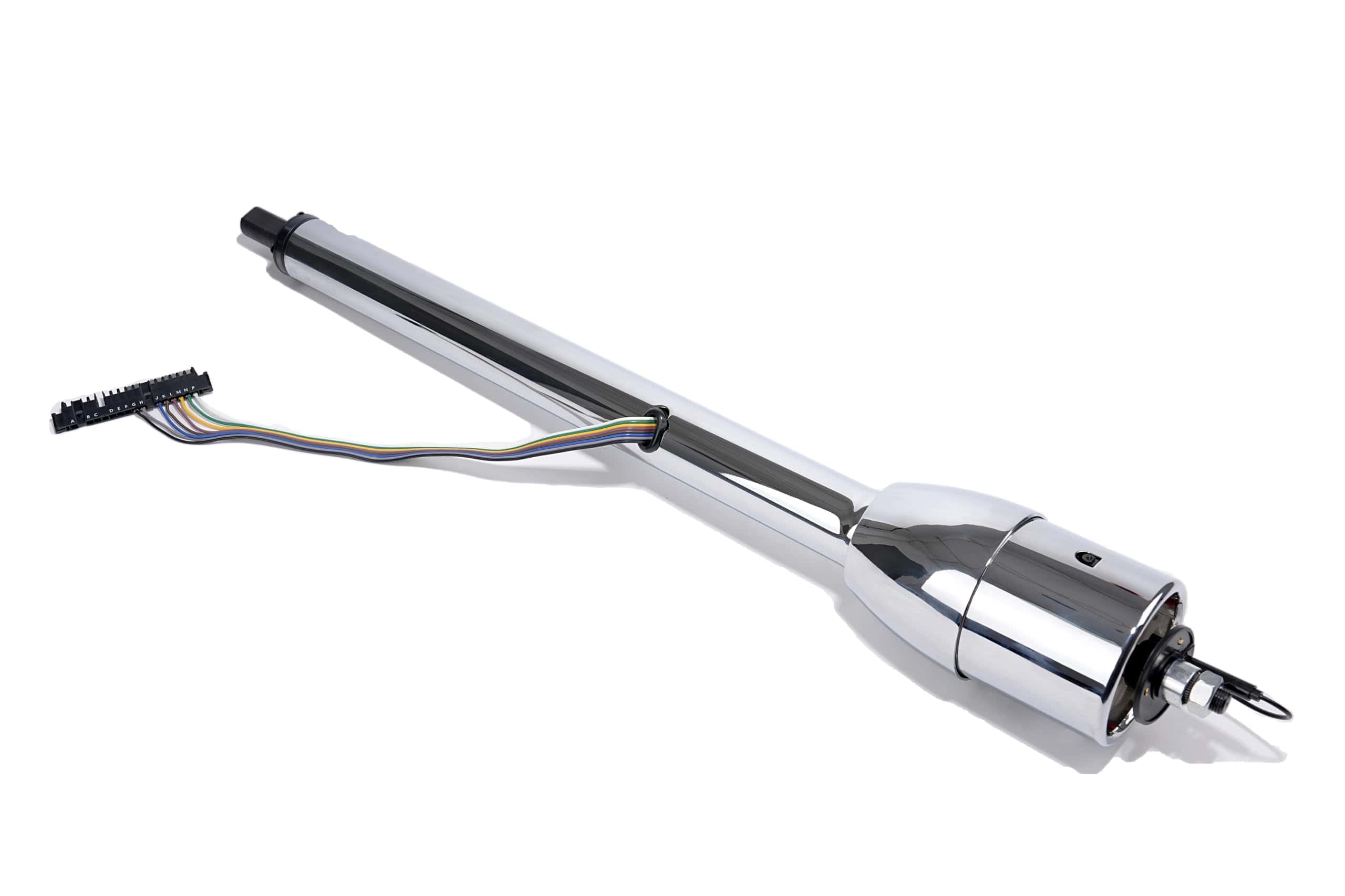 Columna de dirección de acero inoxidable cromado de alta calidad con adaptador de volante GM de 9 agujeros y altura de 2.25 pulgadas incluido. Incluye un interruptor de peligro precableado y un cableado codificado por colores de 4 1/2 pulgadas. La longitud de la columna se mide desde la parte superior de la campana hasta el final del eje de salida.