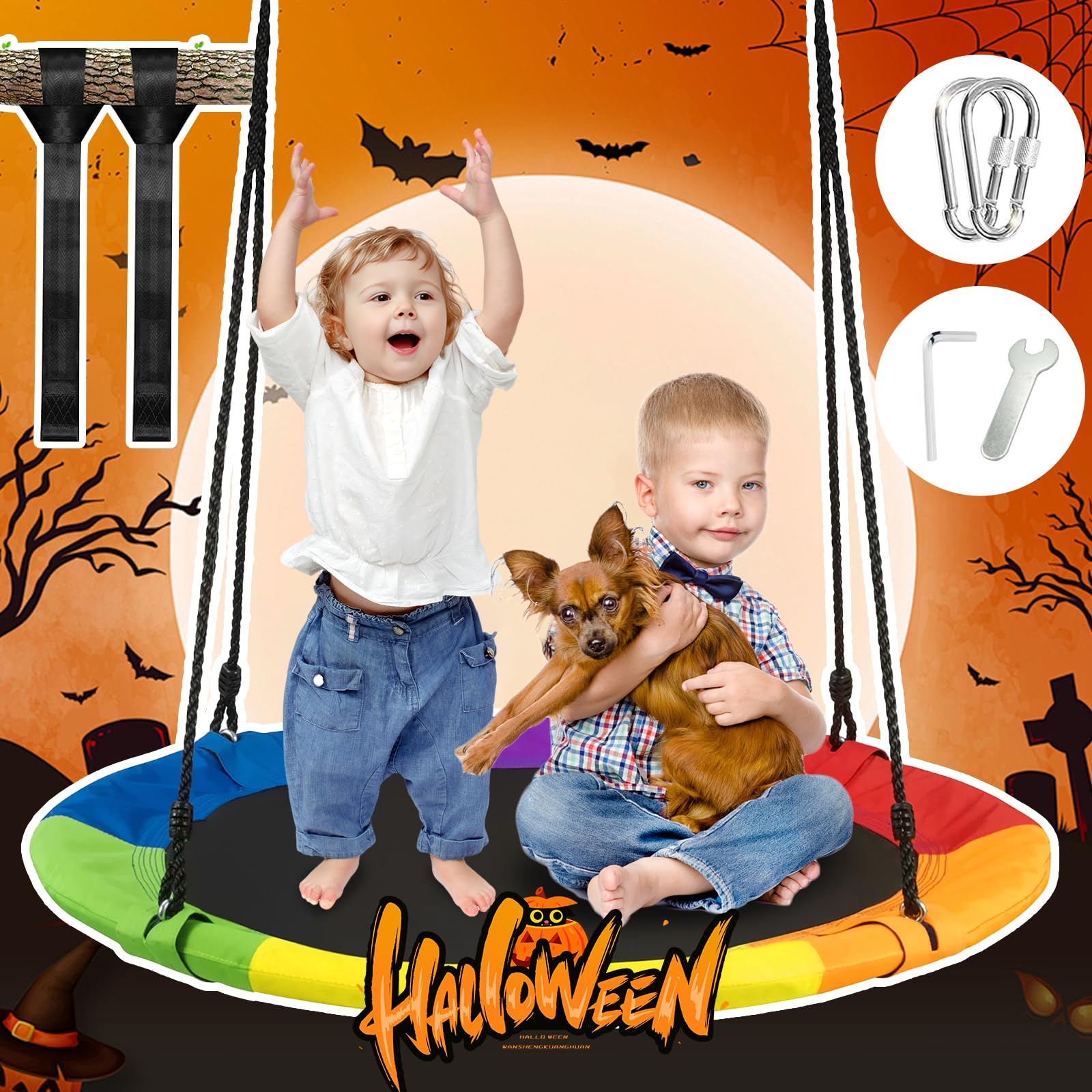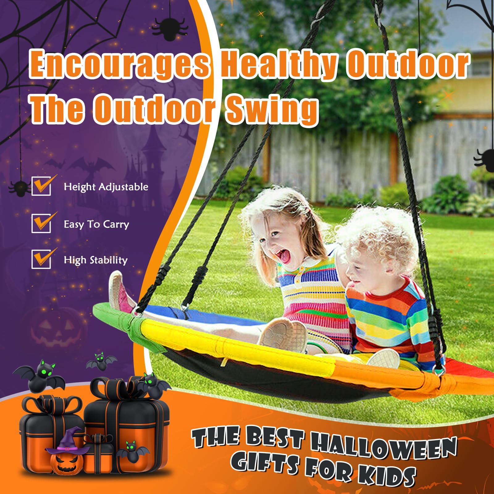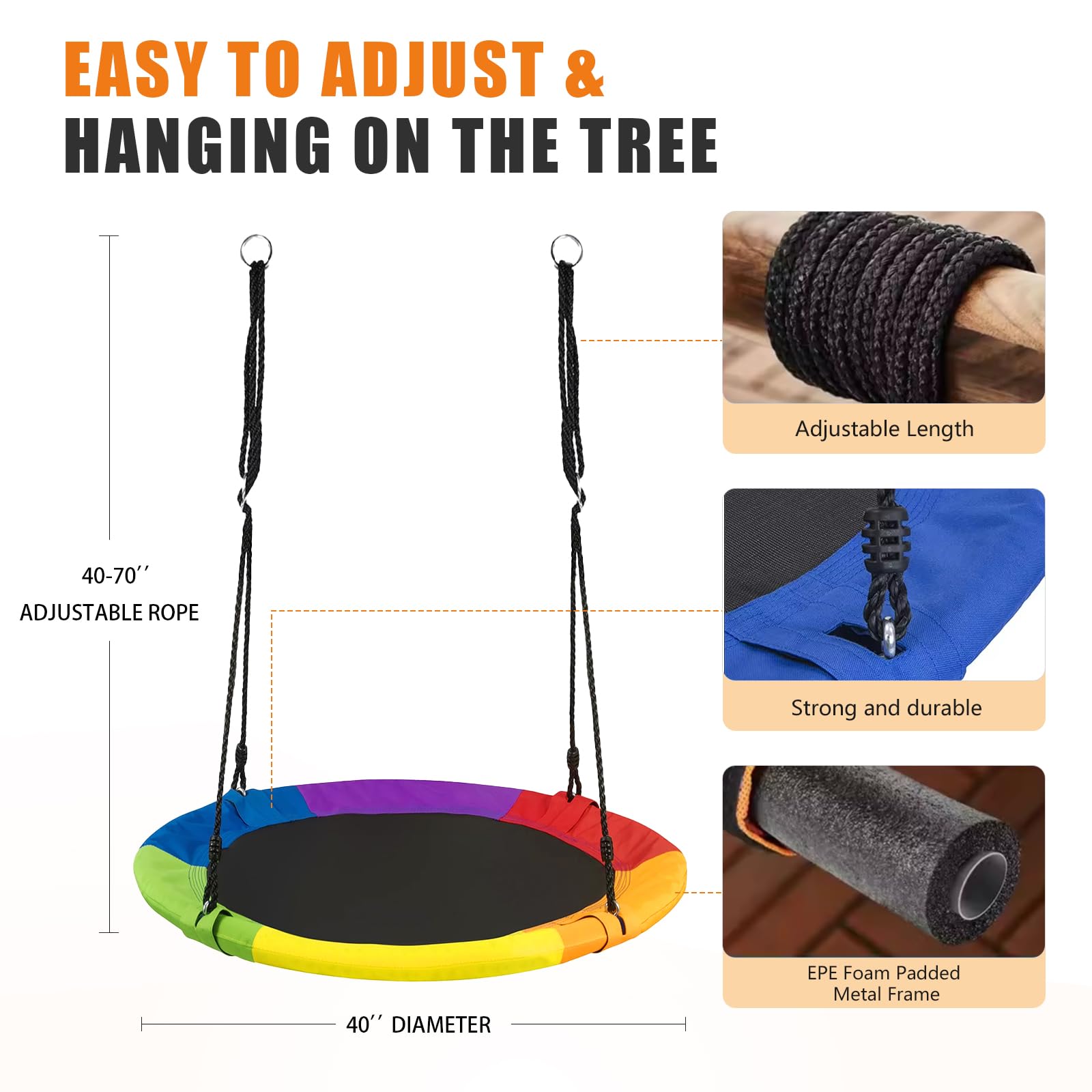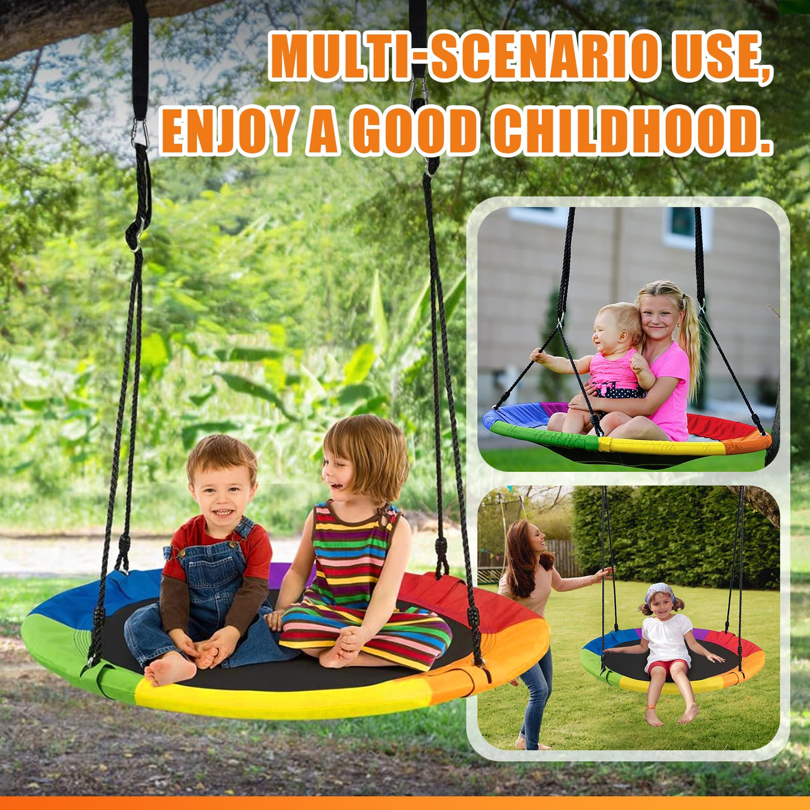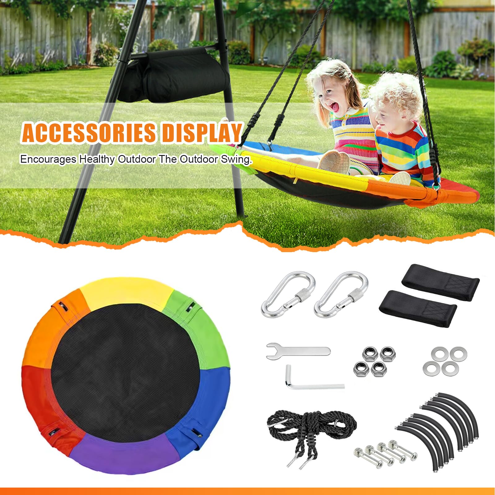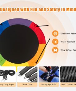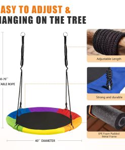 El Columpio Exterior RayRoam proporciona diversión relajante y de balanceo para niños y adolescentes. Plataforma de 40″ de diámetro adecuada para varios niños para columpiarse juntos. Fácil de montar con nuestro kit de suspensión incluido y cuerdas ajustables que te permiten instalar este columpio exterior para niños en minutos en un juego de columpios, árbol, pérgola, gimnasio de jardín, equipo de parque infantil o casa del árbol. Instrucciones incluidas. El marco del columpio de disco es de acero galvanizado sin óxido, envuelto en tubos de espuma suave. Nuestro Columpio Circular está hecho de tela Oxford 900D de alta calidad, que es resistente al agua y a los rayos UV. Agradable para los niños con sus colores llamativos. Sin duda, un regalo fantástico y divertido para niños en cumpleaños, vacaciones u otras ocasiones. Tus hijos seguramente pasarán su tiempo libre en este columpio de disco. Servicio postventa para responder rápidamente a cualquier consulta.