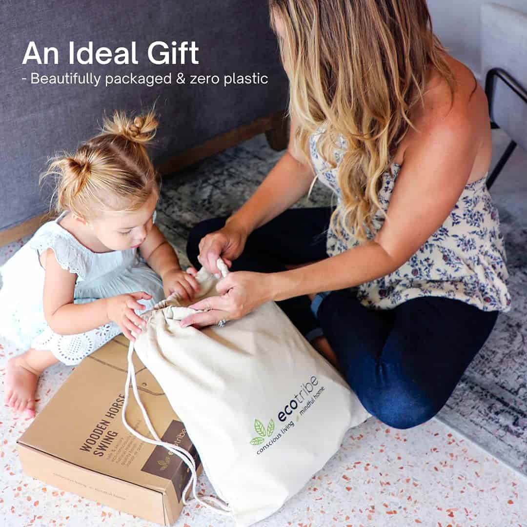 1. MATERIALES ECOLÓGICOS Y SEGUROS – Nuestro columpio para bebés libre de químicos está cuidadosamente diseñado para ser tanto respetuoso con el medio ambiente como completamente seguro para tu pequeño. Construido con todos los materiales naturales incluyendo madera natural sin tratar, barniz no tóxico para niños y fuertes cuerdas de algodón, este juguete de caballo oscilante está rigurosamente probado en laboratorio para cumplir con las normativas de seguridad de EE. UU.