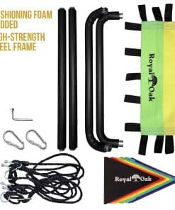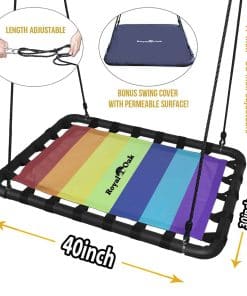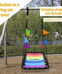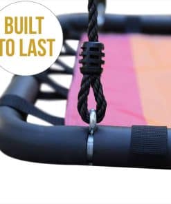 ¡Diversión durante todo el año! Nuestro columpio de plataforma con banderas desmontables es popular entre los niños y es obvio por qué. Su diseño único permite balancearse emocionantemente durante todo el año. Suficientemente grande para un adulto solo y/o varios niños. Siempre es un éxito en las fiestas y garantiza risas estruendosas y sonrisas grandes. Resistente a la intemperie: Nuestros columpios de plataforma resisten las inclemencias del tiempo y siguen luciendo genial. Nuestro exclusivo tejido de Oxford 900D significa que la lluvia y la nieve no son un problema para este columpio. También utilizamos cuerda de grado comercial para que no tengas que preocuparte por reparaciones. Construimos este columpio para resistir cualquier cosa que le pueda lanzar la Madre Naturaleza. Ultra seguro y duradero: Aprobado por ASTM F963-11 y CPSIA sección 101 (a)(2). Con una capacidad de carga de 700 lbs., este columpio puede soportar varios niños al mismo tiempo. Nos tomamos la seguridad en serio y es por eso que solo usamos los materiales más fuertes y seguros, como tela de Oxford 900D, sin plomo y un marco de acero de resistencia industrial. Instalación sencilla: ¿De qué sirve un columpio si es complicado de armar y desmontar Diseñamos nuestro columpio con simplicidad en mente. Nuestras instrucciones fáciles de seguir hacen que sea pan comido armarlo o desmontarlo para guardarlo en invierno. Cuélgalo de una gran rama de árbol o adjúntalo a un conjunto de columpios. Ten en cuenta que nuestras correas Easy Hang se venden por separado. 12 meses de garantía y patente pendiente: Garantía contra defectos de fabricación (registro fácil después de la entrega).