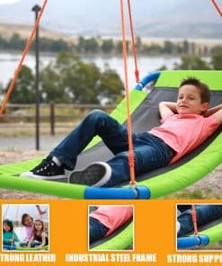 ¿Tienes un árbol, equipo de juegos, gimnasio jungle, o una casa del árbol en tu patio trasero ¿Los niños se aburren jugando en tu patio ¿Tienes un columpio que necesitas reemplazar constantemente? ¡Convierte tu patio trasero en un parque de aventuras con el columpio que desearías haber comprado hace años! DIVERSIÓN INFINITA: Diseñado de forma única para todos los tipos de columpios direccional, el Columpio de Plataforma Gigante Platports ofrece horas de diversión interminable durante todo el año! Además, fomenta el juego al aire libre sin electrónicos! Todos estarán haciendo ejercicio sin darse cuenta! FUERTE Y SEGURO: Con un marco de acero de resistencia industrial y cuerdas de grado comercial, nuestro columpio de plataforma gigante está diseñado para durarle a su familia por años. La tela de poliéster 600D es resistente a la intemperie y permeable en dejar que el agua drene para que el columpio dure y sin pantalones mojados! Con un asiento grande de 65 x 34, una capacidad de peso de 700 lb y acolchado de espuma en el marco de acero para mayor comodidad, ¡puede acomodar a adultos y varios niños! ¡Un éxito garantizado en fiestas de niños! FÁCIL DE INSTALAR: Nuestro columpio de plataforma gigante viene completamente ensamblado. Instrucciones fáciles de seguir para conectar rápidamente y fácilmente el columpio a su árbol o juego de columpios están incluidas. Se puede instalar en cualquier equipo de juegos o gimnasio jungle. Requiere kit de suspensión. INCLUYE: (1) Columpio, (4) Anillos de Suspensión, (4) Cuerdas de Suspensión de 63. Nuestros Columpios de Plataforma Gigante Platports son divertidos, seguros, duraderos y fáciles de instalar. Además, están respaldados por nuestra política de devolución de 30 días del fabricante o nuestra política de reemplazo gratuito de 1 año. Haz clic en el botón de añadir al carrito y ¡consigue tu Columpio de Plataforma Gigante Platports ahora mismo!
