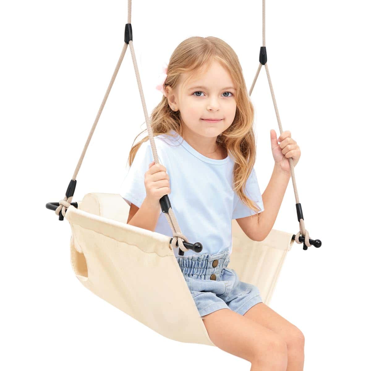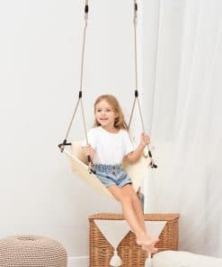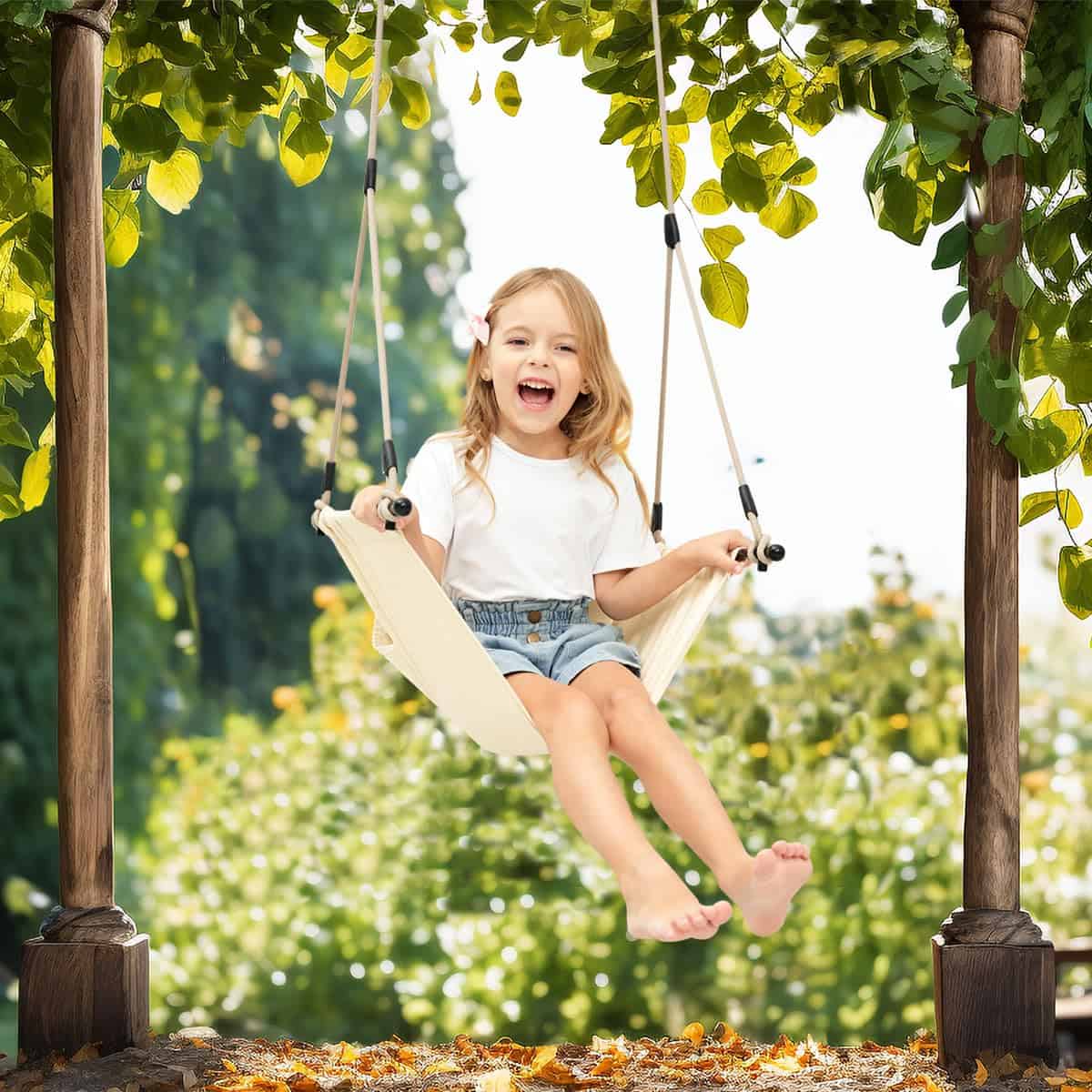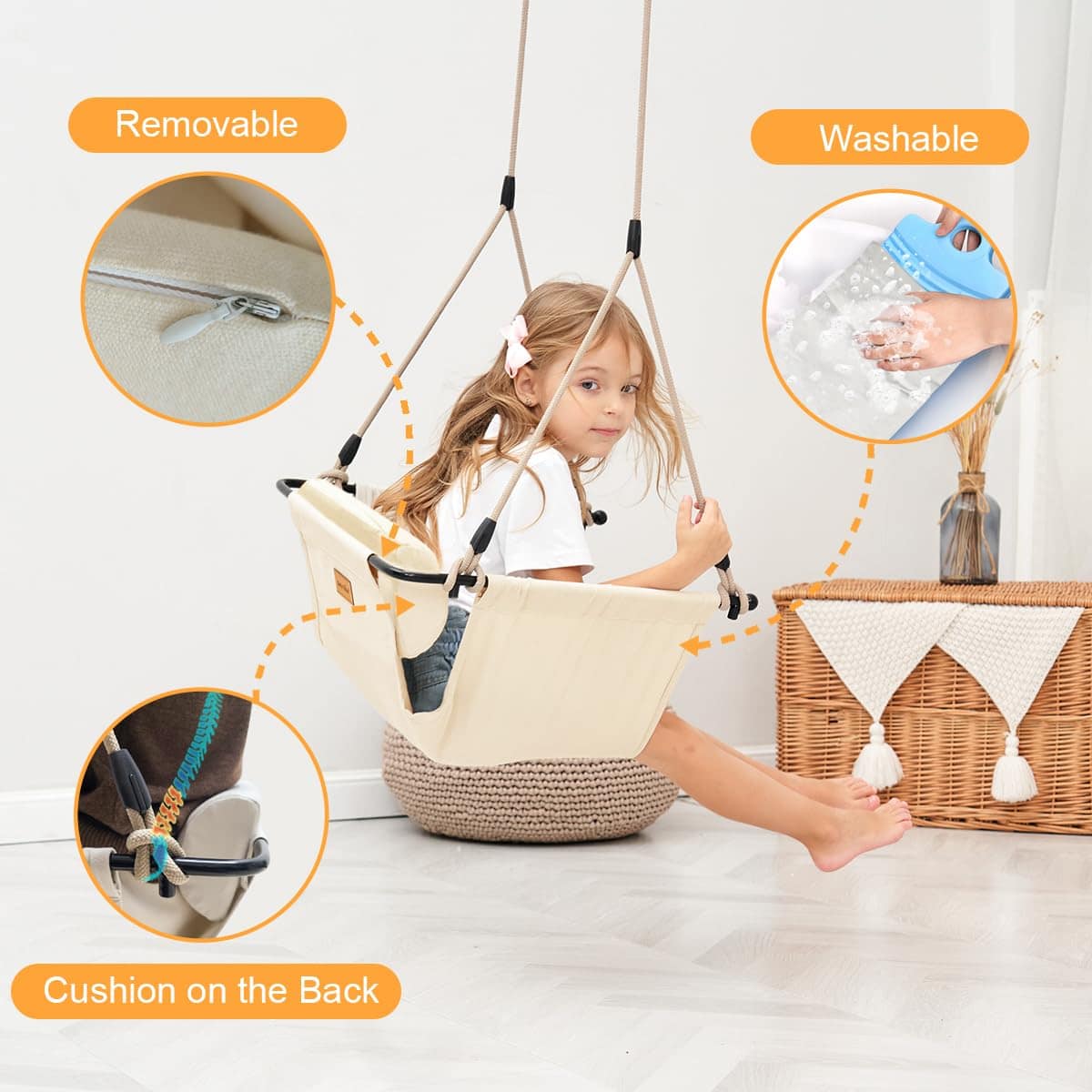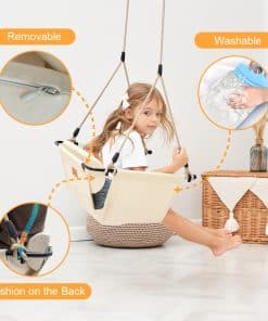 1. Cojín desmontable y lavable El respaldo acolchado proporciona soporte y comodidad para los usuarios. El cojín es fácil de limpiar y mantener, convirtiendo este columpio para niños en una elección perfecta para familias con niños.