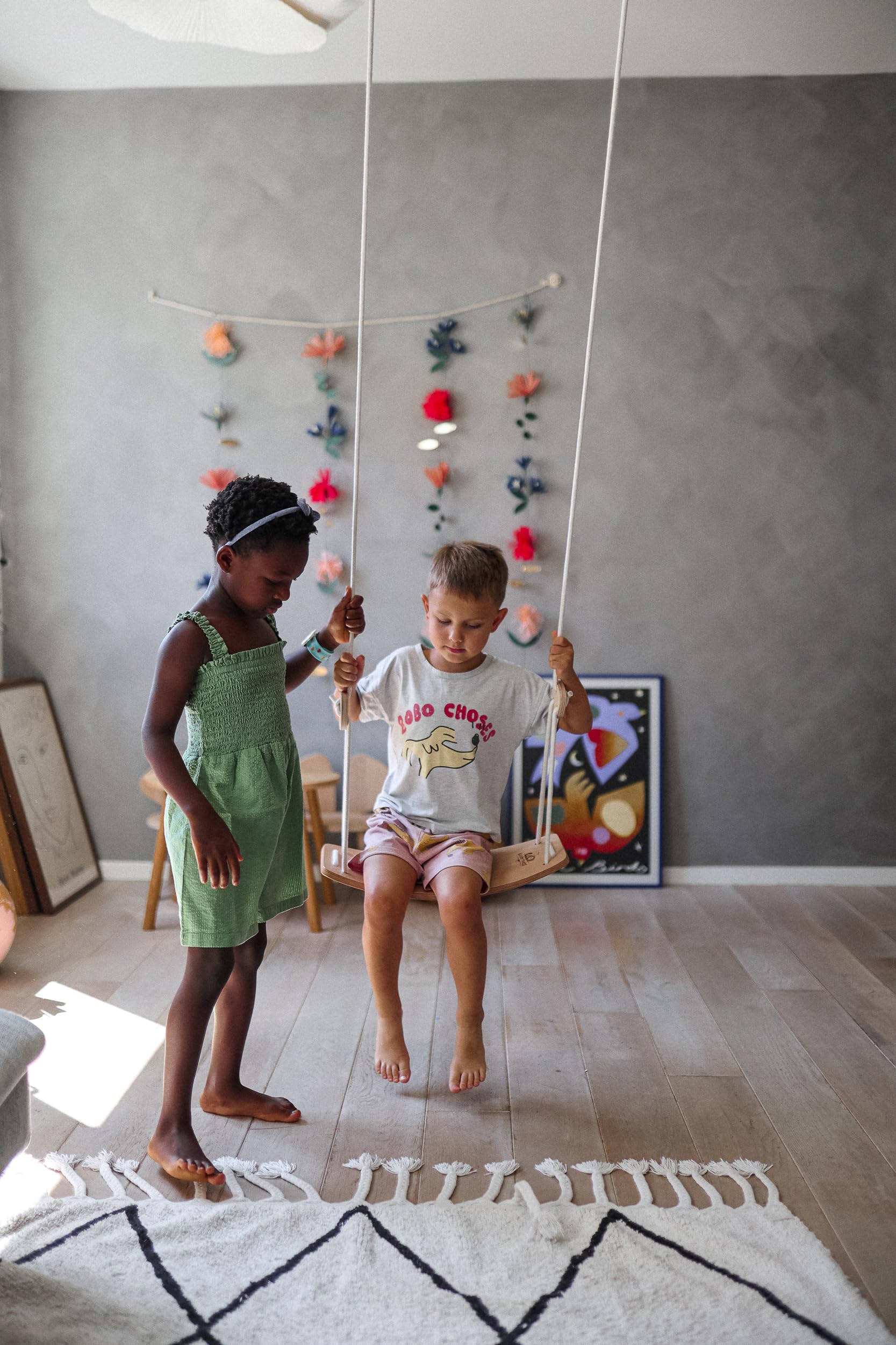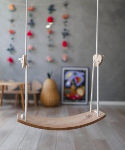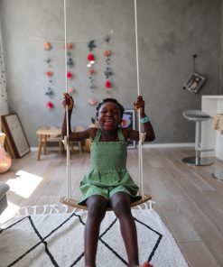 3. SEGURIDAD: Los seguros de cuerda de madera, correas de nylon para colgar y mosquetones garantizan estabilidad y seguridad. El diseño ergonómico curvado del asiento se adapta perfectamente a los pequeños cuerpos. ¡Revise que todos los nudos y cierres estén seguros antes de usar. Nunca deje a su hijo desatendido mientras juega.